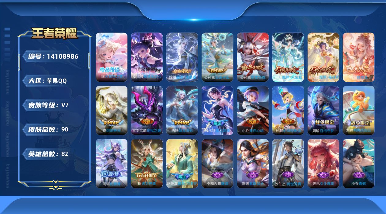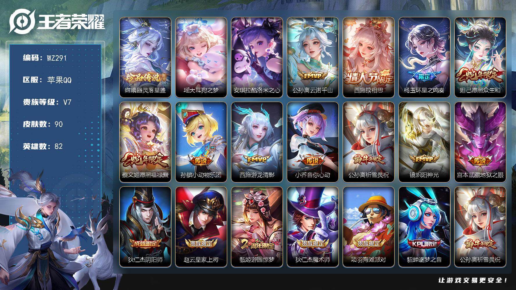 [14108986]金标西施 嫦娥苹果Q-V7-90皮肤-3珍品传说-11传说-26史诗 【英雄全皮】:影全皮 【珍品传说】:嫦娥器灵落星盏,瑶大耳狗之梦,安琪拉酷洛米之心 【传说皮肤】:公孙离云诺千山,西施续相思,杨玉环星之鸣奏,妲己愿照众生和,蔡文姬愿照福禄聚,孙膑小动物乐团,西施游龙清影,小乔音你心动,公孙离祈雪灵祝,镜炽阳神光,宫本武藏地狱之眼 【限定皮肤】:狄仁杰阴阳师,赵云皇家上将,甄姬游园惊梦,狄仁杰魔术师,项羽海滩派对,貂蝉逐梦之音,公孙离祈雪灵祝 【年限皮肤】:公孙离祈雪灵祝 【史诗皮肤】:露娜紫霞仙子,赵云皇家上将,狄仁杰魔术师,廉颇地狱岩魂,宫本武藏鬼剑武藏,孙尚香水果甜心,妲己魅力维加斯,妲己女仆咖啡,李白千年之狐,貂蝉逐梦之音,甄姬游园惊梦,刘禅天才门将,李元芳逐浪之夏,阿轲节奏热浪,狄仁杰鹰眼统帅,小乔青蛇,不知火舞魅语,瑶遇见神鹿,貂蝉唤灵魅影,孙膑茶境仙,赵怀真器灵浮梦炉,狄仁杰绮世丹青,阿轲化蝶舞,刘禅鸭鸭历险记,周瑜百相守梦,少司缘巫礼祀神 【其他皮肤】:项羽海滩派对,韩信街头霸王,阿轲爱心护理,赵云白执事,赵云忍炎影,安琪拉玩偶对对碰,达摩拳王,张飞五福同心,狄仁杰阴阳师,苏烈坚韧之力,明世隐虹云星官,沈梦溪鲨炮海盗猫,马可波罗潮玩牛仔,蒙犽胡桃狂想曲,朵莉亚金色潮汐,太乙真人谧流熔炉,马超访茗客,影魅影绮裳,明世隐景韶洛都,戈娅玫蓝誓约,刘备浪漫序章,钟馗虚灵犬护,沈梦溪鸭鸭历险记,小乔秘证寻踪,张良灵野札记,阿古朵布丁狗之约,露娜命运加冕,姬小满小满鸭,甄姬逆浪荇歌,云中君云械蓝图,孙策百相守梦,庄周锦麟游梦,莱西奥踏浪烽翎,鬼谷子克喵,亚瑟荣光之誓,艾琳鹤鸣心笺,王昭君精灵公主,后羿精灵王,虞姬加勒比小姐,蔡文姬蔷薇王座,大乔伊势巫女,公孙离花间舞,杨玉环霓裳曲,李信灼热之刃,嫦娥露花倒影,瑶森,西施归虚梦演,镜冰刃幻境,云缨赤焰之缨,金蝉前尘 【营地ID】:1562218932