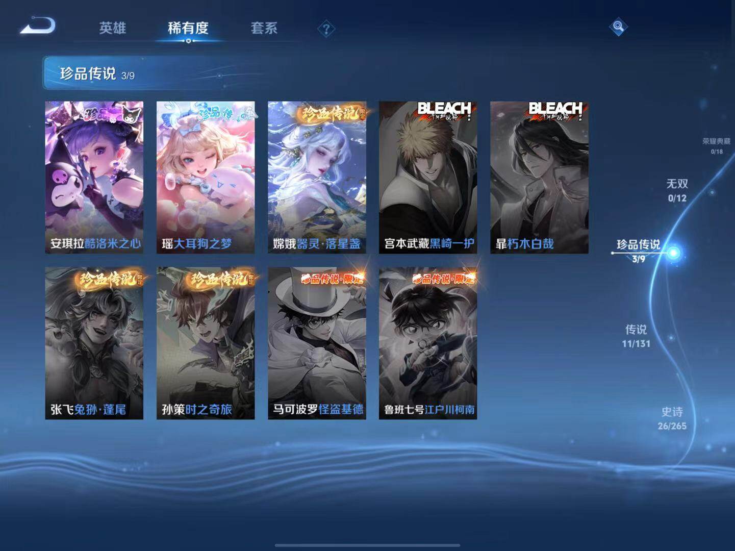 【史诗皮肤】:露娜紫霞仙子,赵云皇家上将,狄仁杰魔术师,廉颇地狱岩魂,宫本武藏鬼剑武藏,孙尚香水果甜心,妲己魅力维加斯,妲己女仆咖啡,李白千年之狐,貂蝉逐梦之音,甄姬游园惊梦,刘禅天才门将,李元芳逐浪之夏,阿轲节奏热浪,狄仁杰鹰眼统帅,小乔青蛇,不知火舞魅语,瑶遇见神鹿,貂蝉唤灵魅影,孙膑茶境仙,赵怀真器灵浮梦炉,狄仁杰绮世丹青,阿轲化蝶舞,刘禅鸭鸭历险记,周瑜百相守梦,少司缘巫礼祀神