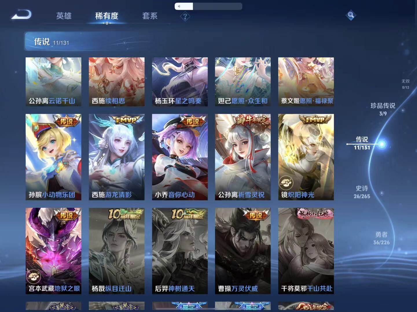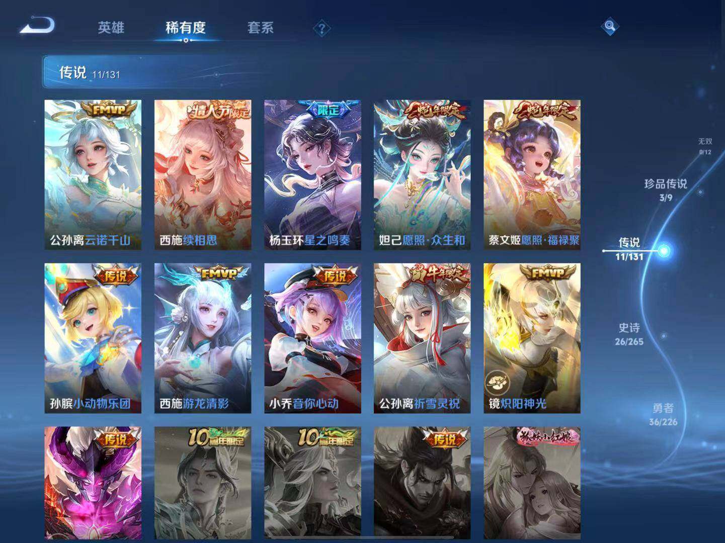 【传说皮肤】:公孙离云诺千山,西施续相思,杨玉环星之鸣奏,妲己愿照众生和,蔡文姬愿照福禄聚,孙膑小动物乐团,西施游龙清影,小乔音你心动,公孙离祈雪灵祝,镜炽阳神光,宫本武藏地狱之眼