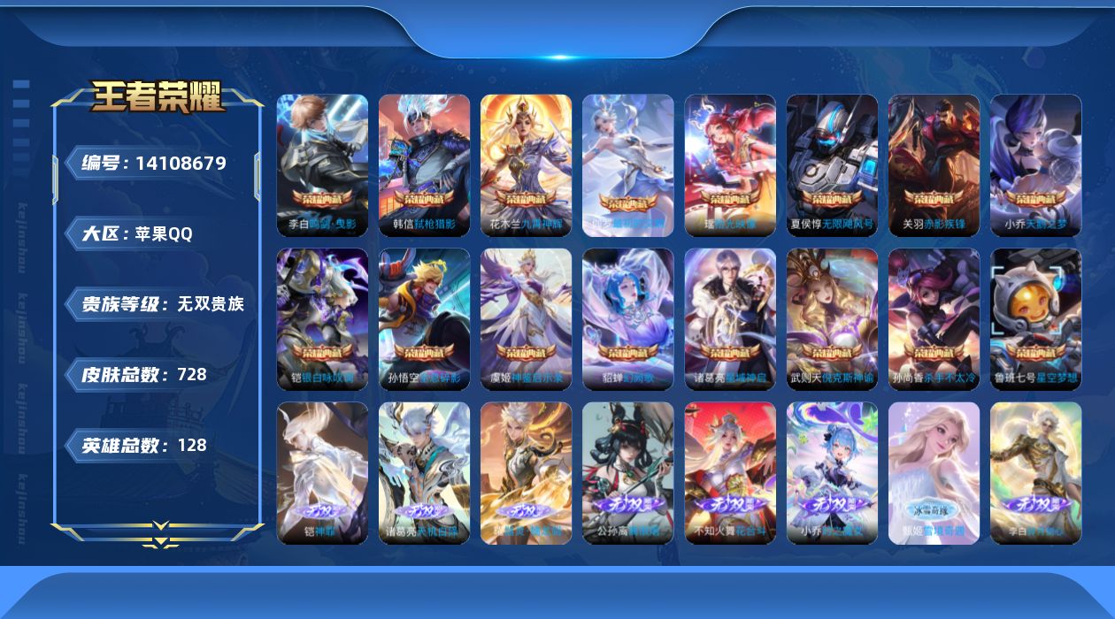 - [14039709]【店主推荐捡漏号!可直接换绑】苹果Q-V11-最强王者段位-128英雄-694皮肤-13典藏-1珍品无双-9无双-7珍品传说-117传说-247史诗 【英雄全皮】:廉颇全皮,小乔全皮,墨子全皮,妲己全皮,嬴政全皮,刘禅全皮,阿轲全皮,白起全皮,吕布全皮,元歌全皮,夏侯惇全皮,典韦全皮,宫本武藏全皮,李白全皮,马可波罗全皮,狄仁杰全皮,达摩全皮,貂蝉全皮,程咬金全皮,露娜全皮,姜子牙全皮,刘邦全皮,韩信全皮,孙权全皮,花木兰全皮,张良全皮,不知火舞全皮,娜可露露全皮,橘右京全皮,孙悟空全皮,牛魔全皮,李元芳全皮,虞姬全皮,钟馗全皮,杨玉环全皮,苍全皮,女娲全皮,哪吒全皮,雅典娜全皮,蔡文姬全皮,太乙真人全皮,鬼谷子全皮,黄忠全皮,苏烈全皮,百里玄策全皮,百里守约全皮,弈星全皮,沈梦溪全皮,明世隐全皮,狂铁全皮,米莱狄全皮,瑶全皮,云中君全皮,李信全皮,盾山全皮,孙策全皮,猪八戒全皮,上官婉儿全皮,亚连全皮,马超全皮,曜全皮,西施全皮,蒙犽全皮,鲁班大师全皮,蒙恬全皮,澜全皮,镜全皮,阿古朵全皮,桑启全皮,夏洛特全皮,司空震全皮,云缨全皮,金蝉全皮,暃全皮,赵怀真全皮,莱西奥全皮,戈娅全皮,空空儿全皮,影全皮,海诺全皮,姬小满全皮,少司缘全皮 【荣耀典藏】:武则天英雄,孙悟空全息碎影,夏侯惇无限飓风号,小乔天鹅之梦,芈月大秦宣太后,程咬金活力突击,李白鸣剑曳影,诸葛亮星域神启,花木兰九霄神辉,关羽赤影疾锋,貂蝉幻阙歌,韩信弑枪猎影,虞姬神鉴启示录,瑶拾光映像 【珍品无双】:貂蝉馥梦繁花 【无双皮肤】:妲己青丘九尾,瑶真我赫兹,李白碎月剑心,小乔时之魔女,韩信群星魔术团,不知火舞花合斗,公孙离离恨烟,甄姬雪境奇遇,曜器灵螭龙剑 【珍品传说】:马可波罗怪盗基德,鲁班七号江户川柯南,孙策时之奇旅,瑶大耳狗之梦,安琪拉酷洛米之心,暃朽木白哉,宫本武藏黑崎一护 【传说皮肤】:后羿神树通天,元歌诡秘之主,西施续相思,杨玉环星之鸣奏,司空震愿照山河定,女娲愿照千秋盛,妲己愿照众生和,澜愿照九州拓,蔡文姬愿照福禄聚,虞姬愿照岁时盈,云缨幻光神枪,裴擒虎祥瑞亨通,嬴政玄雷天君,桑启鸣野蒿,庄周牧神诗旅,夏侯惇霜北刀,铠冥王哈迪斯,朵莉亚心动手记,云中君群星魔术团,墨子黄金天蝎座,海月金乌负日,亚连落雪白狼,吕布曦玄引,貂蝉曦玄引,典韦战鼓燎原,孙尚香乘龙问璇玑,孙策乘龙淬吴钩,赵云乘龙