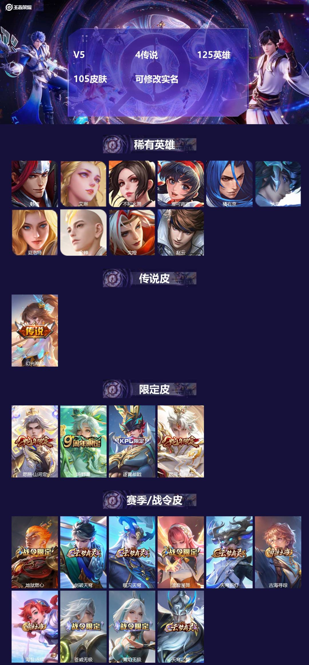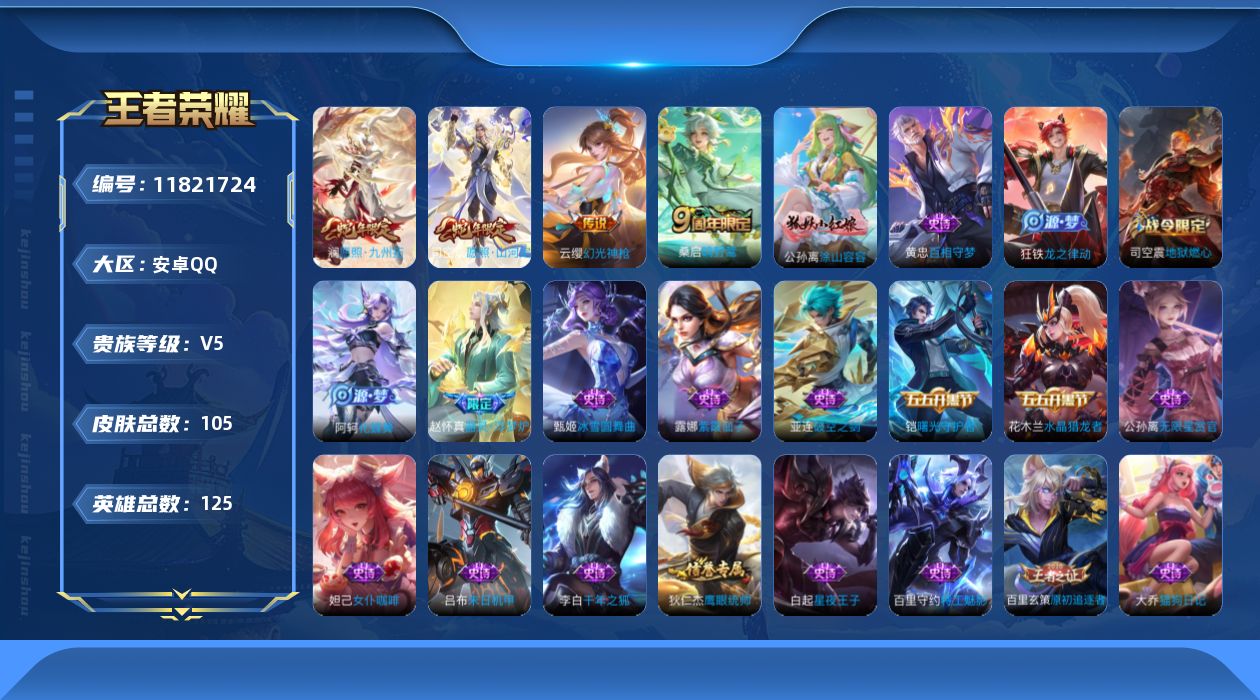 [11821724]V5 4传说 125英雄 105皮肤 可修改实名 【英雄全皮】:司空震全皮 【稀有英雄】:大司命,韩信(韩跳跳),夏洛特(夏师傅),艾琳,橘右京(橘子),娜可露露(鸟人),不知火舞,赵云,金蝉(唐僧),戈娅 【传说皮】:幻光神枪 【赛季/战令皮】:噬灭天穹(s37),古海寻踪(s33),海盐诗旅(s30),流音漫舞,地狱燃心,剑破天穹(s35),天穹祈灯(s34),青焰无极,苍威无极,天穹之誓(s36) 【史诗皮】:器灵·浮梦炉,化蝶舞,龙之律动,百相守梦-黄忠,茶境仙,破空之剑,涂山容容,紫霞仙子,特工魅影,千年之狐,无限星赏官,末日机甲-吕布,猫狗日记-大乔,乱世虎臣,女仆咖啡,水果甜心,绅士熊喵,星夜王子,暗隐猎兽者,鬼剑武藏,心灵战警,缤纷独角兽,逐浪之夏,水晶猎龙者,曙光守护者,原初追逐者,圣诞狂欢,圣诞恋歌,鹰眼统帅,魅力维加斯,未来纪元-赵云 【限定皮】:愿照·九州拓(澜年限),愿照·山河定(司空震年限),逐霄战戟,鸣野蒿 【普通皮】:熔金海岸,苍林狼骑,访茗客,铁骨偃魂,谧流熔炉,龙舞盛年,街头霸王,雪境奇遇-西施,星梦巡礼,逆浪荇歌,荣光之誓,克喵,锦麟游梦,死霸装,春野闲踪,小满鸭,景韶洛都,玫蓝誓约,虚灵犬护,浪漫序章,灵野札记,布丁狗之约,命运加冕,西部游侠,完美运算,鬼谷子天穹祈灯(S34),万事如意,海滩丽影,海滩派对,皇家上将,掌控之力,守护之力,纽约教父,乓乓大师,万象初新,黄金武士,天使之翼,功夫老勺,哥特玫瑰,红桃皇后,教廷特使,阴阳师,少女阿狸,忍·炎影,丁香结,救世之瞳,野性能量,冰雪圆舞曲,未来纪元-宫本武藏,拳王,幻想奇妙夜,修竹墨客,幸存者,冰刃幻境,战争女神,启蛰,特种部队,帝国元帅,无双福将