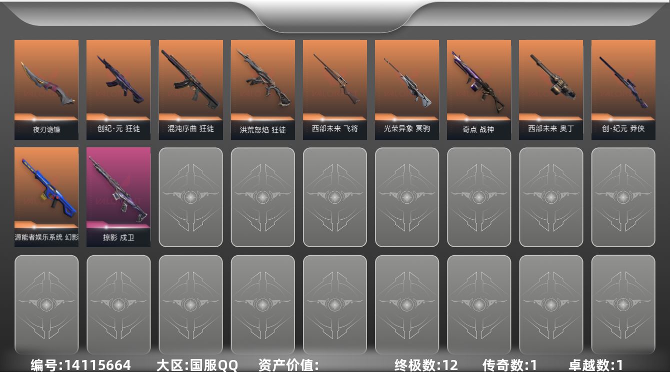 - [12540321]【商品标题】:陕西一区-26V-2王者-0炫金 【传说武器】:传说夜影 【热门武器】:传说夜影,QBZ03-金色蔷薇,死亡之眼,炼狱-迷你小钢,沙鹰-修罗,金刚伞 【角色】:葵,幽,战地猎狐 【人偶武器】:AWM-灵狐-15周年嘉年华,炼狱-迷你小钢,夺魂,灵狐娃娃手雷,生化手雷-机甲核心*2 【暴走生化】:炼狱-迷你小钢,死亡之眼,黑龙吞噬者,双面神 【挑战大师】:神圣爆裂者-末日III,冰龙粉碎者-白马银枪 【英雄级武器】:QBZ03-云龙,COP 357-云龙,唐刀-神工天巧,QBZ03-金色蔷薇,无影-神兵利器,AWM-裁决,黑武士-锦绣游龙,超新星-热带奇洋,沙鹰-修罗,麒麟刺,擎天,屠龙,龙啸-热带奇洋 【特殊枪械】:0白虎,0黑骑士,0烈龙,0盘龙,0炼狱,0蝴蝶斯泰尔