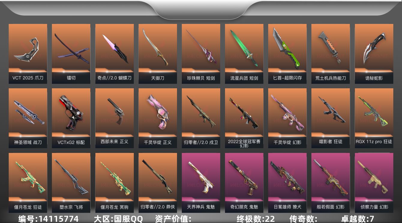 [14115774]【套装】:VCT 2025 赛季套装 【英雄】:幻棱,炼狱,维斯,暮蝶,钛狐,壹决,铁臂,捷风,雷兹,幽影,不死鸟,贤者,猎枭,蝰蛇,零,芮娜,奇乐,尚勃勒,霓虹,斯凯,夜露,星礈,K/O,海神,盖可,黑梦,钢锁 【近战 武器】:近战武器-奇点//2.0 蝴蝶刀,近战武器-VCT 2025 爪刀,近战武器-镭切,近战武器-珍珠棘贝 短剑,近战武器-流星兵团 短剑,近战武器-超限闪存 匕首,近战武器-荒土机兵 热能刀,近战武器-天御刀,近战武器-诡秘蛇影 军刀,近战武器-神圣领域 战刀 【狂徒】:狂徒-偃月苍龙,狂徒-噬影者,狂徒-RGX 11z Pro,狂徒-堕天遗武,狂徒-掠影,狂徒-荒土机兵,狂徒-流星兵团,狂徒-诡秘蛇影 【幻影】:幻影-2022全球冠军赛,幻影-千灵华绽,幻影-般若假面,幻影-侦察力量,幻影-超限闪存,幻影-珍珠棘贝,幻影-神圣领域,幻影-纳米打击,幻影-末日之翼 【戍卫】:戍卫-归零者//2.0,戍卫-珍珠棘贝,戍卫-浮光跃金,戍卫-逆冲蛮牛,戍卫-战术熊与伙伴们,戍卫-月球哨兵,戍卫-折光棱晶 【獠犬】:獠犬-日冕雄师,獠犬-神圣领域,獠犬-复古浪潮,獠犬-模拟赫兹,獠犬-逆冲蛮牛 【冥驹】:冥驹-偃月苍龙,冥驹-荒土机兵,冥驹-复古浪潮,冥驹-模拟赫兹,冥驹-星云暗涌 【飞将】:飞将-塑水宗,飞将-战术熊与伙伴们,飞将-末日之翼 【莽侠】:莽侠-归零者//2.0,莽侠-超限闪存,莽侠-诡秘蛇影,莽侠-深海水族,莽侠-纤云弄巧,莽侠-月球哨兵 【战神】:战神-神圣领域,战神-浮光跃金,战神-深海水族 【奥丁】:奥丁-流星兵团,奥丁-纳米打击,奥丁-末日之翼 【判官】:判官-诡秘蛇影,判官-纳米打击x 【雄鹿】:雄鹿-复古浪潮,雄鹿-模拟赫兹,雄鹿-逆冲蛮牛,雄鹿-月球哨兵 【骇灵】:骇灵-荒土机兵,骇灵-流星兵团,骇灵-珍珠棘贝,骇灵-无限竞技,骇灵-浮光跃金,骇灵-星云暗涌 【蜂刺】:蜂刺-超限闪存,蜂刺-深海水族,蜂刺-纤云弄巧,蜂刺-星云暗涌,蜂刺-折光棱晶 【标配】:标配-荒土机兵,标配-浮光跃金,标配-战术熊与伙伴们,标配-折光棱晶 【VCT手枪】:标配-VCT x G2 【正义】:正义-千灵华绽,正义-西部未来,正义-超限闪存,正义-复古浪潮,正义-纳米打击,正义-纤云弄巧,正义-月球哨兵 【鬼魅】:鬼魅-奇幻朋克,鬼魅-天