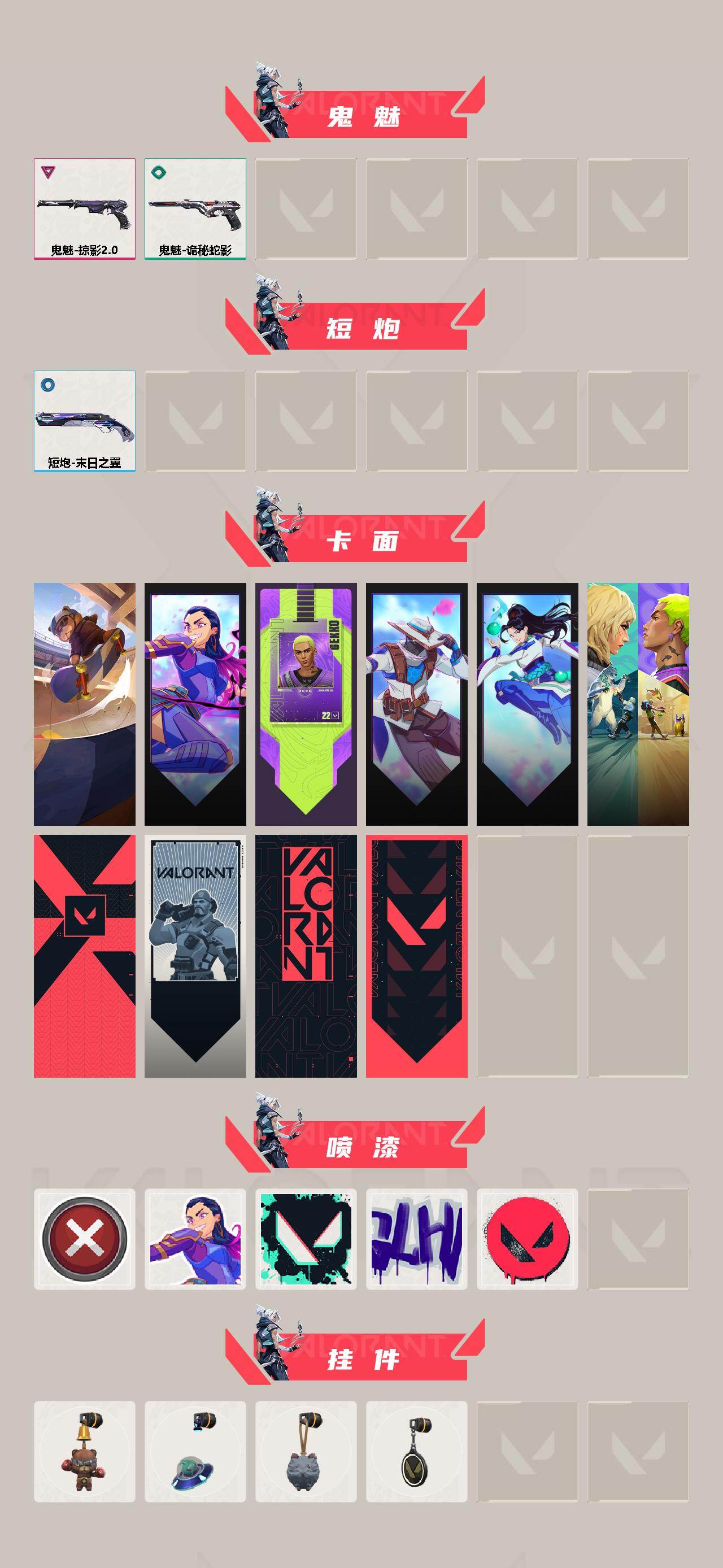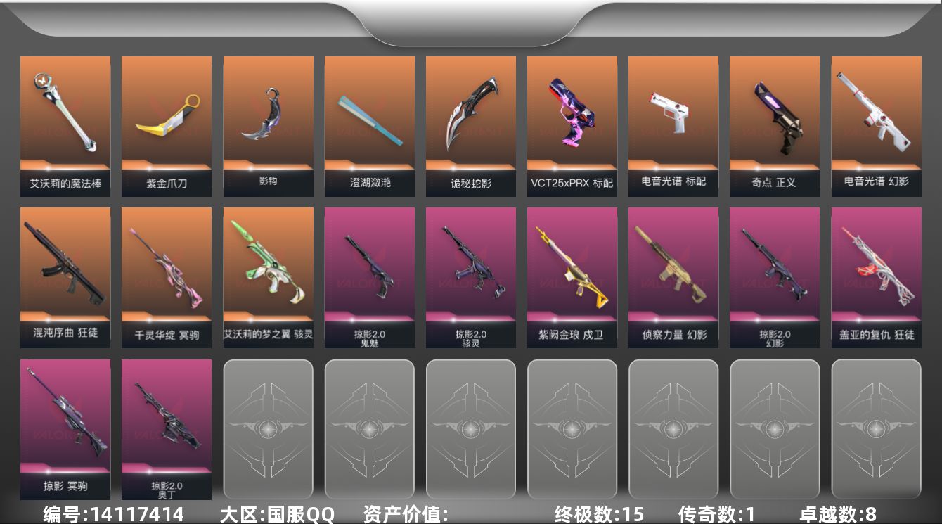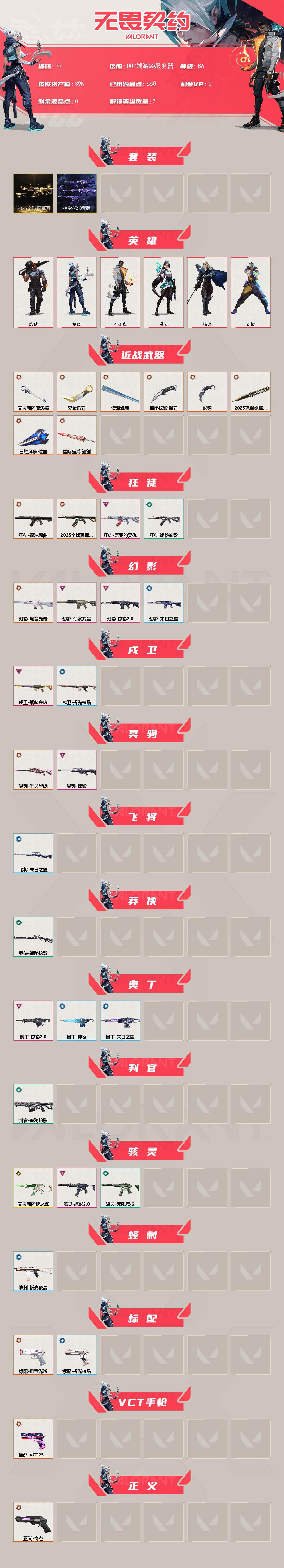 [14117414]【套装】:2025全球冠军赛套装,掠影//2.0套装 【英雄】:幻棱,炼狱,捷风,不死鸟,贤者,猎枭 【近战 武器】:近战武器-2025全球冠军赛 蝴蝶刀,近战武器-影钩,近战武器-紫金爪刀,近战武器-艾沃莉的魔法棒,近战武器-澄湖潋滟,近战武器-诡秘蛇影 军刀,近战武器-日耀风暴 遗器,近战武器-星际猎兵 短剑 【狂徒】:狂徒-2025全球冠军赛,狂徒-混沌序曲,狂徒-盖亚的复仇,狂徒-诡秘蛇影 【幻影】:幻影-电音光谱,幻影-侦察力量,幻影-掠影//2.0,幻影-末日之翼,幻影-电音光谱 【戍卫】:戍卫-紫阙金琅,戍卫-折光棱晶 【冥驹】:冥驹-千灵华绽,冥驹-掠影 【飞将】:飞将-末日之翼 【莽侠】:莽侠-诡秘蛇影 【奥丁】:奥丁-掠影//2.0,奥丁-神罚,奥丁-末日之翼 【判官】:判官-诡秘蛇影 【骇灵】:骇灵-艾沃莉的梦之翼,骇灵-掠影//2.0,骇灵-无限竞技 【蜂刺】:蜂刺-折光棱晶 【标配】:标配-电音光谱,标配-折光棱晶,标配-电音光谱 【VCT手枪】:标配-VCT25 x PRX 【正义】:正义-奇点 【鬼魅】:鬼魅-掠影//2.0,鬼魅-诡秘蛇影 【短炮】:短炮-末日之翼 【卡面】:Clutch 卡面,无畏契约GO!第一卷:芮娜 卡面,盖可工牌 卡面,无畏契约GO!第一卷:零 卡面,无畏契约GO!第一卷:贤者 卡面,钢锁vs盖可 卡面,代号红色 卡面,新兵报到 卡面,V契约 卡面,无畏契约 卡面 【喷漆】:买装还是存钱 喷漆,无畏契约GO!第一卷:芮娜 喷漆,胜利属于无畏契约 喷漆,GLHF 喷漆,无畏契约 喷漆 【挂饰】:拳击战术熊 挂饰,天外飞客 挂饰,《双城之战》魄罗 挂饰,无畏契约 纪念币 挂饰