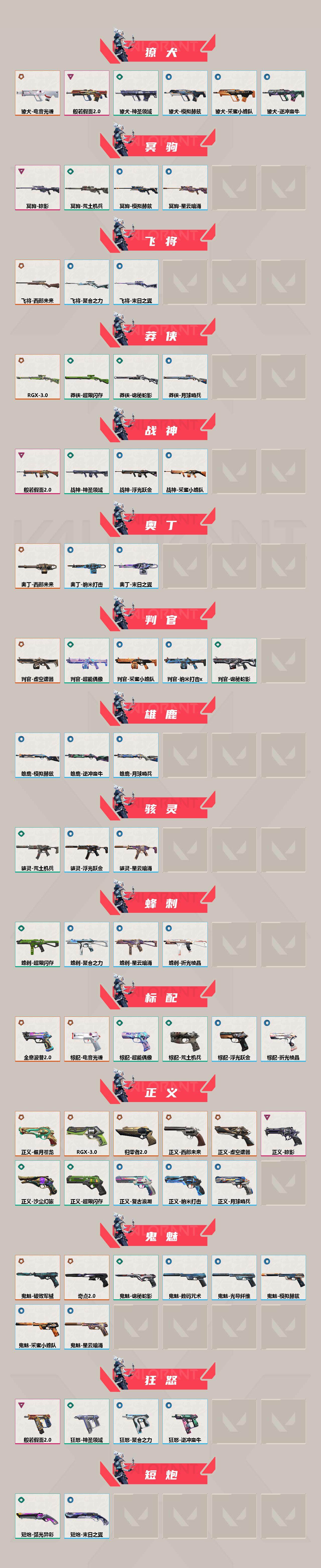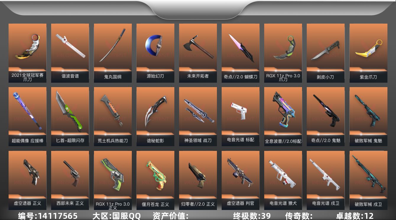 [14117565]【套装】:2021全球冠军赛套装,电音光谱套装,虚空遗器套装,西部未来套装,RGX 11z Pro//3.0套装,奇点//2.0套装,般若假面//2.0套装 【英雄】:幻棱,炼狱,维斯,暮蝶,钛狐,壹决,铁臂,捷风,雷兹,幽影,不死鸟,贤者,猎枭,蝰蛇,零,芮娜,奇乐,尚勃勒,霓虹,斯凯,夜露,星礈,K/O,海神,盖可,黑梦,钢锁 【近战 武器】:近战武器-2021全球冠军赛 爪刀,近战武器-谐波音谱,近战武器-剥皮小刀,近战武器-奇点//2.0 蝴蝶刀,近战武器-紫金爪刀,近战武器-RGX 11z Pro//3.0 爪刀,近战武器-鬼丸国纲,近战武器-源始幻刃,近战武器-未来开拓者,近战武器-超能偶像 应援棒,近战武器-超限闪存 匕首,近战武器-荒土机兵 热能刀,近战武器-诡秘蛇影 军刀,近战武器-神圣领域 战刀 【狂徒】:狂徒-2021全球冠军赛,狂徒-归零者,狂徒-混沌序曲,狂徒-奇点//2.0,狂徒-全息波普//2.0,狂徒-虚空遗器,狂徒-般若假面//2.0,狂徒-堕天遗武,狂徒-掠影,狂徒-盖亚的复仇,狂徒-紫阙金琅,狂徒-超能偶像,狂徒-荒土机兵,狂徒-诡秘蛇影 【幻影】:幻影-西部未来,幻影-虚空遗器,幻影-电音光谱,幻影-侦察力量,幻影-海洋之星//2.0,幻影-超限闪存,幻影-神圣领域,幻影-聚合之力,幻影-纳米打击,幻影-末日之翼,幻影-西部未来,幻影-电音光谱 【戍卫】:戍卫-破败军械,戍卫-电音光谱,戍卫-超能偶像,戍卫-浮光跃金,戍卫-逆冲蛮牛,戍卫-月球哨兵,戍卫-折光棱晶,戍卫-电音光谱 【獠犬】:獠犬-电音光谱,獠犬-般若假面//2.0,獠犬-神圣领域,獠犬-采蜜小蜂队,獠犬-模拟赫兹,獠犬-逆冲蛮牛,獠犬-电音光谱 【冥驹】:冥驹-掠影,冥驹-荒土机兵,冥驹-模拟赫兹,冥驹-星云暗涌 【飞将】:飞将-西部未来,飞将-聚合之力,飞将-末日之翼 【莽侠】:莽侠-RGX 11z Pro//3.0,莽侠-超限闪存,莽侠-诡秘蛇影,莽侠-月球哨兵 【战神】:战神-般若假面//2.0,战神-神圣领域,战神-采蜜小蜂队,战神-浮光跃金 【奥丁】:奥丁-西部未来,奥丁-纳米打击,奥丁-末日之翼 【判官】:判官-虚空遗器,判官-超能偶像,判官-诡秘蛇影,判官-采蜜小蜂队,判官-纳米打击x 【雄鹿】:雄鹿-模拟赫兹,雄鹿-逆冲蛮牛,雄鹿-月球哨兵