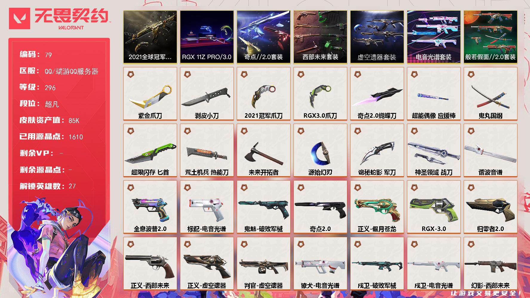 - [15562829]【英雄】:炼狱,维斯,暮蝶,壹决,铁臂,捷风,雷兹,幽影,不死鸟,贤者,猎枭,蝰蛇,零,芮娜,尚勃勒,斯凯,夜露,K/O,海神,盖可,黑梦,钢锁 【近战武器】:近战武器-奇点//2.0 蝴蝶刀,近战武器-星际猎兵 短剑 【狂徒】:狂徒-堕天遗武,狂徒-日冕雄师,狂徒-彩虹魔力小白马 【幻影】:幻影-侦察力量 【骇灵】:骇灵-无限竞技 【标配】:标配-紫阙金琅,标配-荒土机兵 【正义】:正义-离子武器 【鬼魅】:鬼魅-天界神兵 【狂怒】:狂怒-逆冲蛮牛 【卡面】:瓦娃脸雪糕 P2 卡面,欢迎来到底城 卡面,南瓜盛典 卡面,VCT CN首冠 卡面,修车达人 卡面,热舞环节 卡面,正义的化身 卡面,时间到 卡面,最高舞台 卡面,声感陷阱设计图 卡面,梦幻奶茶 卡面,哨卫者之领域 卡面,零点嗅探设计图 卡面,无畏契约GO!第一卷:芮娜 卡面,无畏契约GO!第一卷:零 卡面,钢锁vs盖可 卡面,代号红色 卡面,新兵报到 卡面,V契约 卡面,无畏契约 卡面 【喷漆】:独守蝰腹 喷漆,通缉:战术企鹅 喷漆,都算到了 喷漆,熊抱 喷漆,蛋糕还是爆能器? 喷漆,超级粉丝 喷漆,捷风差距 喷漆,拼一枪 喷漆,买装还是存钱 喷漆,胜利属于无畏契约 喷漆,GLHF 喷漆,无畏契约 喷漆 【挂饰】:水壶 挂饰,熔岩灯 挂饰,瞬云履 挂饰,第九季//第二幕 纪念币 挂饰,袖珍捷风 挂饰,Z世代特饮 挂饰,第九季//第一幕 纪念币 挂饰,第八季//第三幕 纪念币 挂饰,天外飞客 挂饰,《双城之战》魄罗 挂饰,无畏契约 纪念币 挂饰