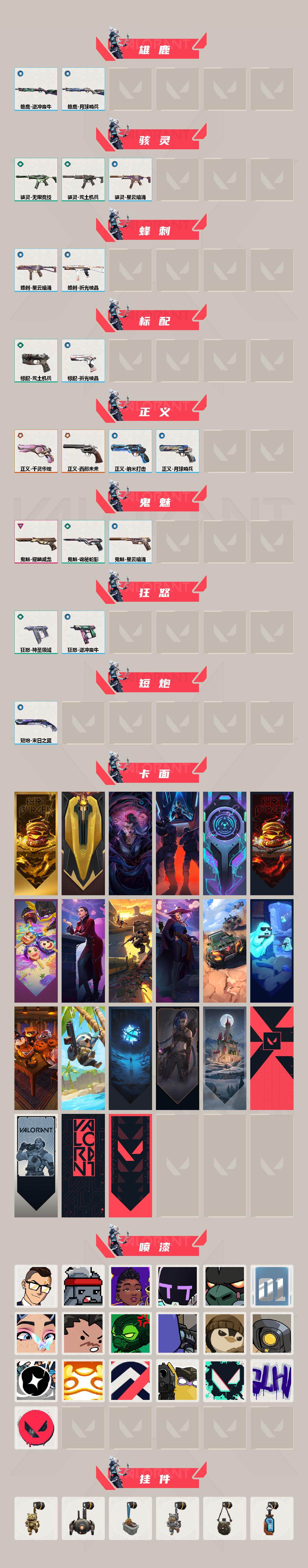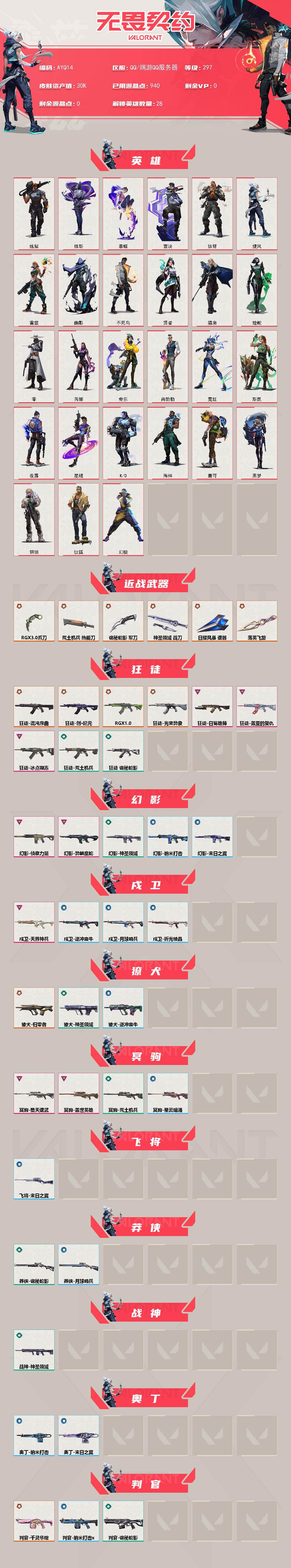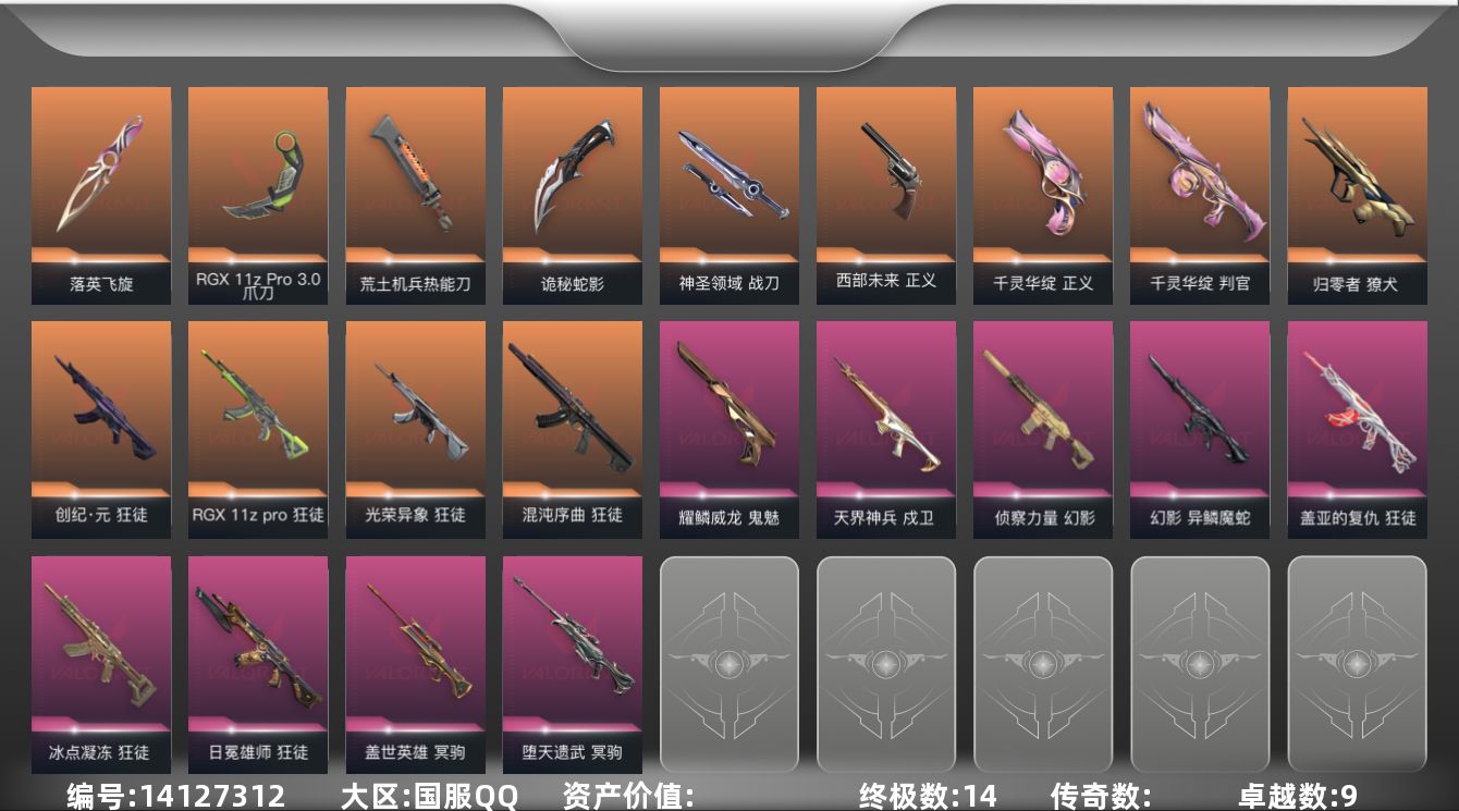 [14127312]【店主推荐捡漏号!可直接换绑】【英雄】:幻棱,炼狱,维斯,暮蝶,钛狐,壹决,铁臂,捷风,雷兹,幽影,不死鸟,贤者,猎枭,蝰蛇,零,芮娜,奇乐,尚勃勒,霓虹,斯凯,夜露,星礈,K/O,海神,盖可,黑梦,钢锁【近战 武器】:近战武器-RGX 11z Pro//3.0 爪刀,近战武器-落英飞旋,近战武器-荒土机兵 热能刀,近战武器-诡秘蛇影 军刀,近战武器-神圣领域 战刀,近战武器-日耀风暴 【狂徒】:狂徒-混沌序曲,狂徒-创·纪元,狂徒-RGX 11z Pro,狂徒-光荣异象,狂徒-冰点凝冻,狂徒-盖亚的复仇,狂徒-日冕雄师,狂徒-荒土机兵,狂徒-诡秘蛇影【幻影】:幻影-侦察力量,幻影-异鳞魔蛇,幻影-神圣领域,幻影-纳米打击,幻影-末日之翼【戍卫】:戍卫-天界神兵,戍卫-逆冲蛮牛,戍卫-月球哨兵,戍卫-折光棱晶【獠犬】:獠犬-归零者,獠犬-神圣领域,獠犬-逆冲蛮牛【冥驹】:冥驹-堕天遗武,冥驹-盖世英雄,冥驹-荒土机兵,冥驹-星云暗涌【飞将】:飞将-末日之翼【莽侠】:莽侠-诡秘蛇影,莽侠-月球哨兵【战神】:战神-神圣领域【奥丁】:奥丁-纳米打击,奥丁-末日之翼【判官】:判官-千灵华绽,判官-诡秘蛇影,判官-纳米打击x【雄鹿】:雄鹿-逆冲蛮牛,雄鹿-月球哨兵【骇灵】:骇灵-荒土机兵,骇灵-无限竞技,骇灵-星云暗涌【蜂刺】:蜂刺-星云暗涌,蜂刺-折光棱晶【标配】:标配-荒土机兵,标配-折光棱晶【正义】:正义-千灵华绽,正义-西部未来,正义-纳米打击,正义-月球哨兵【鬼魅】:鬼魅-耀鳞威龙,鬼魅-诡秘蛇影,鬼魅-星云暗涌【狂怒】:狂怒-神圣领域,狂怒-逆冲蛮牛【短炮】:短炮-末日之翼【卡面】:终章:激斗汉堡 卡面,进入射程 卡面,分崩离析 卡面,纳米打击 卡面,抑制技术 卡面,激斗汉堡 卡面,瓦娃脸雪糕 P2 卡面,从黄昏到黎明 卡面,荒土机兵 卡面,银弹猎手 卡面,逆冲蛮牛 卡面,精灵大战 卡面,南瓜盛典 卡面,树懒大作战 卡面,无垠星环 卡面,《双城之战》金克丝 卡面,胡桃狂想 卡面,代号红色 卡面,新兵报到 卡面,V契约 卡面,无畏契约 卡面【喷漆】:小小心意 喷漆,战“素”兔 喷漆,宇宙的指引 喷漆,请求重启 喷漆,逆冲蛮牛 喷漆,纳米打击 喷漆,鼻尖上的蝴蝶 喷漆,简笔画黯兽 喷漆,独守蝰腹 喷漆,他们将落荒而逃 喷漆,通缉:战术企鹅 喷漆,荒土机兵 喷漆,别挡