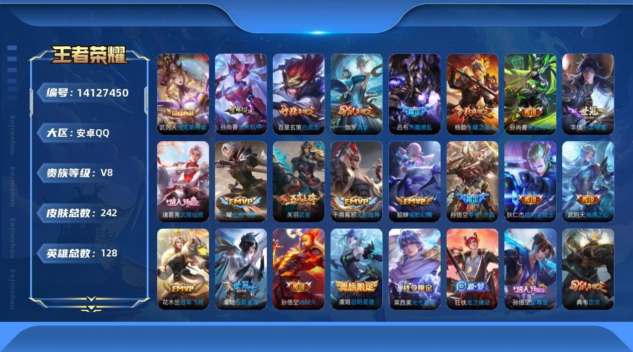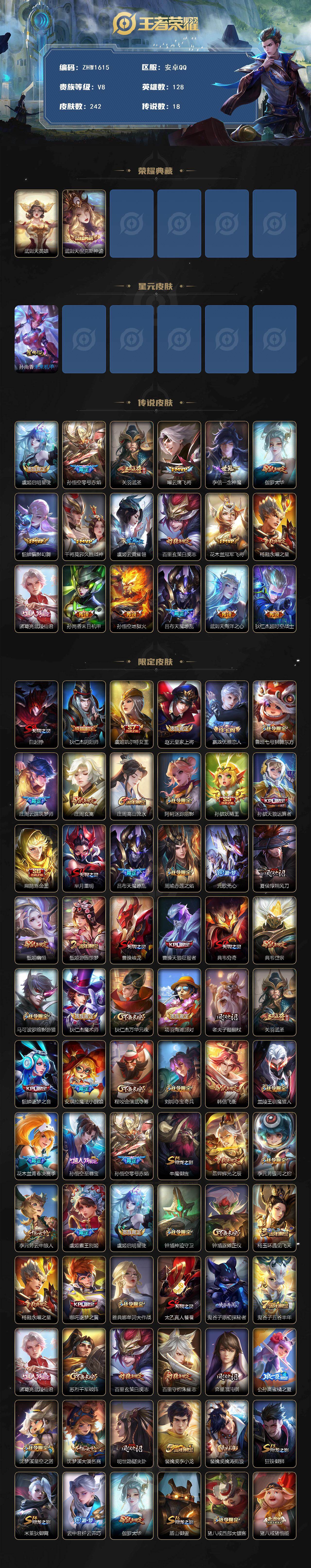 [14127450]【店主推荐捡漏号!可直接换绑】安卓Q-V8-至尊星耀I段位-128英雄-242皮肤-1典藏皮肤-1典藏英雄-18传说-75史诗 【英雄全皮】:鬼谷子全皮 【荣耀典藏】:武则天英雄,武则天倪克斯神谕 【传说皮肤】:虞姬启明星使,孙悟空零号赤焰,关羽武圣,曜云鹰飞将,李信一念神魔,伽罗太华,貂蝉猫影幻舞,干将莫邪久胜战神,虞姬云霓雀翎,百里玄策白虎志,花木兰冠军飞将,杨戬永曜之星,诸葛亮武陵仙君,孙尚香末日机甲,孙悟空地狱火,吕布天魔缭乱,武则天海洋之心,狄仁杰超时空战士 【限定皮肤】:白起狰,狄仁杰阴阳师,虞姬凯尔特女王,赵云皇家上将,嬴政优雅恋人,鲁班七号狮舞东方,庄周云端筑梦师,庄周玄嵩,庄周高山流水,阿轲迷踪丽影,孙膑妖精王,孙膑天狼运算者,扁鹊炼金王,芈月重明,吕布天魔缭乱,周瑜赤莲之焰,元歌无心,夏侯惇朔风刀,甄姬幽恒,甄姬游园惊梦,曹操烛龙,曹操天狼征服者,典韦穷奇,典韦岱宗,马可波罗暗影游猎,狄仁杰魔术师,狄仁杰万华元夜,项羽海滩派对,老夫子醍醐杖,关羽武圣,貂蝉逐梦之音,安琪拉魔法小厨娘,程咬金演武夺筹,刘邦夺宝奇兵,韩信飞衡,兰陵王驯魔猎人,花木兰青春决赛季,孙悟空至尊宝,孙悟空零号赤焰,牛魔御旌,后羿辉光之辰,李元芳银河之约,李元芳云中旅人,虞姬霸王别姬,虞姬启明星使,钟馗神迹守卫,钟馗驱傩正仪,杨玉环遇见飞天,杨戬永曜之星,哪吒逐梦之翼,雅典娜单词大作战,太乙真人饕餮,鬼谷子原初探秘者,鬼谷子五谷丰年,诸葛亮武陵仙君,苏烈千军破阵,百里玄策白虎志,百里守约朱雀志,弈星混沌棋,公孙离蜜橘之夏,沈梦溪星空之诺,沈梦溪大漠名商,明世隐疑决卦,裴擒虎李小龙,裴擒虎擒涛扼浪,狂铁御狮,米莱狄御霄,云中君纤云弄巧,伽罗太华,盾山御銮,猪八戒西部大镖客,猪八戒猪悟能,上官婉儿梁祝,嫦娥拒霜思,蒙犽狂想玩偶喵,鲁班大师探海日志,艾琳女武神,司空震地狱燃心,阿古朵江河有灵,张良古海寻踪,蒙犽百解令,鬼谷子天穹祈灯,沈梦溪龙舞盛年,刘邦剑破天穹,程咬金群星魔术团,周瑜熔金海岸 【年限皮肤】:百里玄策白虎志,百里守约朱雀志,杨戬永曜之星,后羿辉光之辰,伽罗太华,甄姬幽恒,韩信飞衡,典韦岱宗,庄周玄嵩,关羽武圣 【赛季限定】:孙膑妖精王,扁鹊炼金王,白起狰,芈月重明,夏侯惇朔风刀,曹操烛龙,典韦穷奇,狄仁杰万华元夜,老夫子醍醐杖,程咬金演武夺筹,张良古海寻踪,牛魔御旌