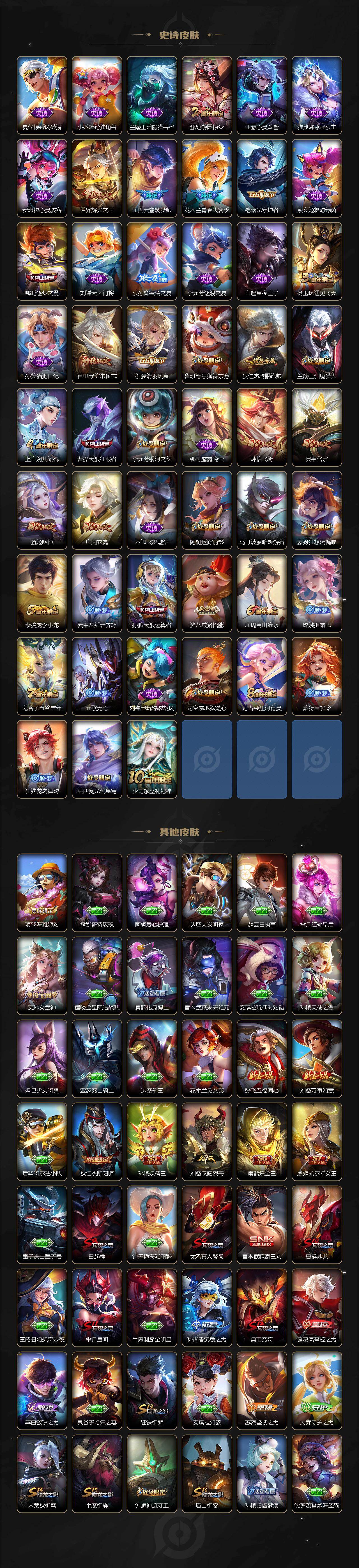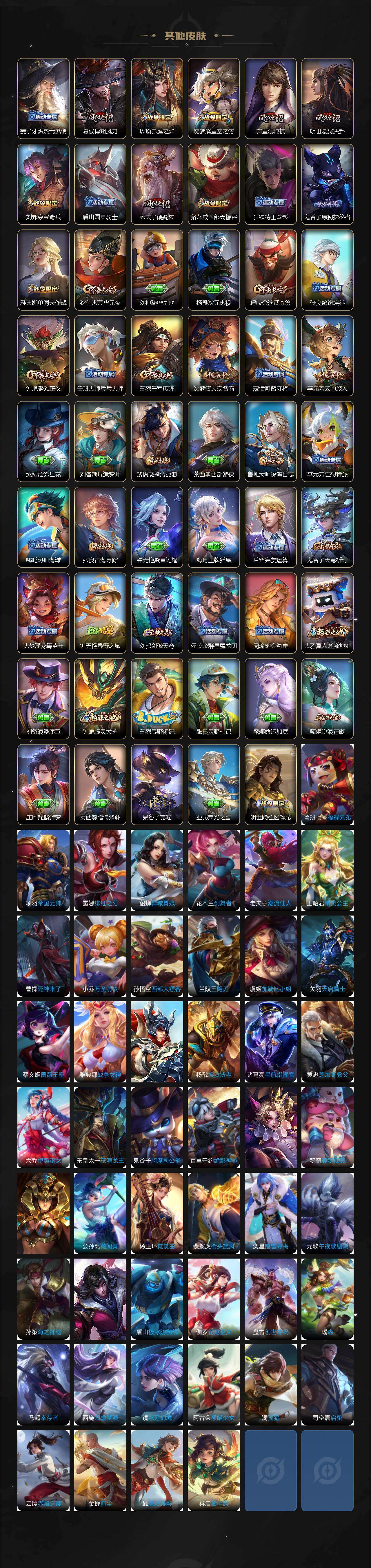 【限定皮肤】:白起狰,狄仁杰阴阳师,虞姬凯尔特女王,赵云皇家上将,嬴政优雅恋人,鲁班七号狮舞东方,庄周云端筑梦师,庄周玄嵩,庄周高山流水,阿轲迷踪丽影,孙膑妖精王,孙膑天狼运算者,扁鹊炼金王,芈月重明,吕布天魔缭乱,周瑜赤莲之焰,元歌无心,夏侯惇朔风刀,甄姬幽恒,甄姬游园惊梦,曹操烛龙,曹操天狼征服者,典韦穷奇,典韦岱宗,马可波罗暗影游猎,狄仁杰魔术师,狄仁杰万华元夜,项羽海滩派对,老夫子醍醐杖,关羽武圣,貂蝉逐梦之音,安琪拉魔法小厨娘,程咬金演武夺筹,刘邦夺宝奇兵,韩信飞衡,兰陵王驯魔猎人,花木兰青春决赛季,孙悟空至尊宝,孙悟空零号赤焰,牛魔御旌,后羿辉光之辰,李元芳银河之约,李元芳云中旅人,虞姬霸王别姬,虞姬启明星使,钟馗神迹守卫,钟馗驱傩正仪,杨玉环遇见飞天,杨戬永曜之星,哪吒逐梦之翼,雅典娜单词大作战,太乙真人饕餮,鬼谷子原初探秘者,鬼谷子五谷丰年,诸葛亮武陵仙君,苏烈千军破阵,百里玄策白虎志,百里守约朱雀志,弈星混沌棋,公孙离蜜橘之夏,沈梦溪星空之诺,沈梦溪大漠名商,明世隐疑决卦,裴擒虎李小龙,裴擒虎擒涛扼浪,狂铁御狮,米莱狄御霄,云中君纤云弄巧,伽罗太华,盾山御銮,猪八戒西部大镖客,猪八戒猪悟能,上官婉儿梁祝,嫦娥拒霜思,蒙犽狂想玩偶喵,鲁班大师探海日志,艾琳女武神,司空震地狱燃心,阿古朵江河有灵,张良古海寻踪,蒙犽百解令,鬼谷子天穹祈灯,沈梦溪龙舞盛年,刘邦剑破天穹,程咬金群星魔术团,周瑜熔金海岸