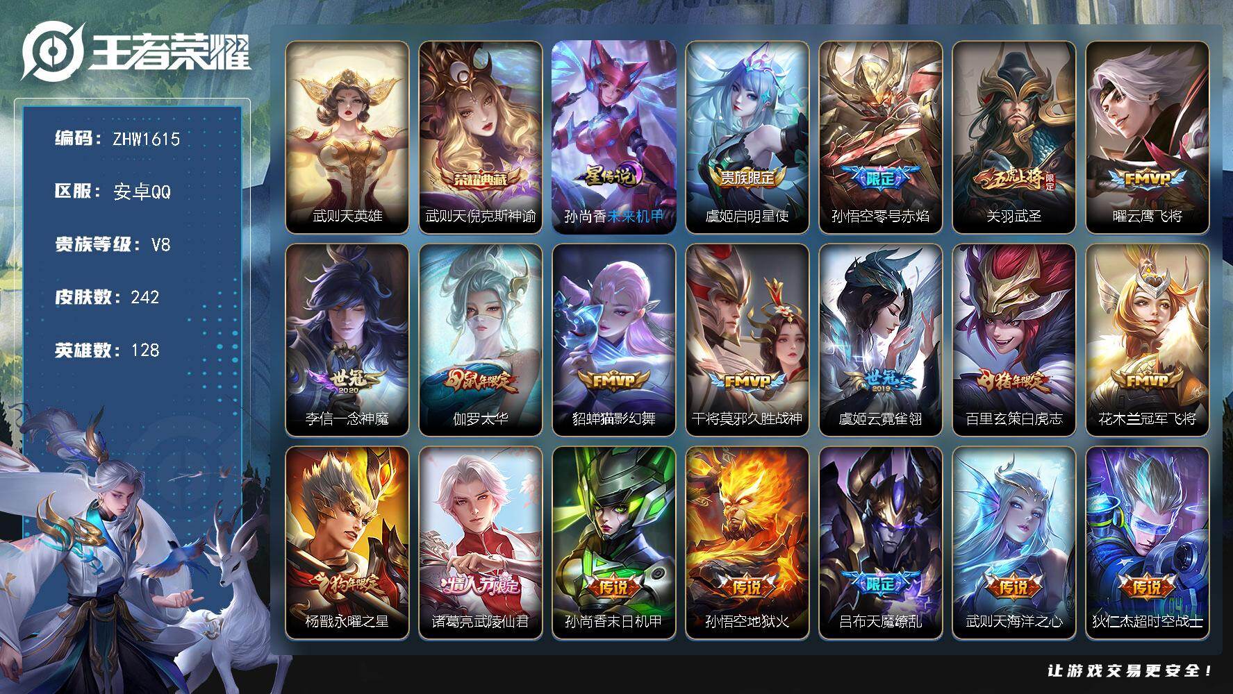 [14127450]【店主推荐捡漏号!可直接换绑】安卓Q-V8-至尊星耀I段位-128英雄-242皮肤-1典藏皮肤-1典藏英雄-18传说-75史诗