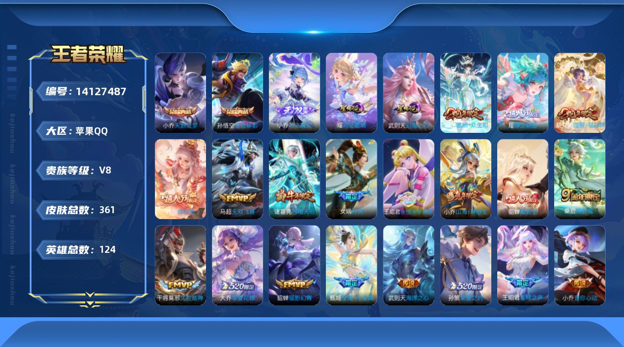 [14127487]【店主推荐捡漏号!可直接换绑】苹果Q-V8-荣耀黄金I段位-124英雄-361皮肤-2典藏皮肤-1典藏英雄-1无双-21传说-116史诗 【英雄全皮】:小乔全皮,阿轲全皮,刘邦全皮,太乙真人全皮,蒙恬全皮,金蝉全皮,影全皮 【荣耀典藏】:武则天英雄,孙悟空全息碎影,小乔天鹅之梦 【无双皮肤】:小乔时之魔女 【传说皮肤】:西施续相思,妲己愿照众生和,蔡文姬愿照福禄聚,桑启鸣野蒿,貂蝉曦玄引,王昭君永恒水手月亮,甄姬至美化雀舞,小乔山海琳琅生,王昭君星穹之声,马超无双飞将,大乔挚爱花嫁,孙策挚爱之约,蔡文姬花朝如约,女娲补天,瑶时之祈愿,小乔音你心动,诸葛亮时雨天司,虞姬启明星使,貂蝉猫影幻舞,干将莫邪久胜战神,武则天海洋之心 【限定皮肤】:白起狰,蔡文姬夏日便利店,虞姬夏日便利店,姜子牙天穹之誓,狄仁杰阴阳师,小乔纯白花嫁,虞姬凯尔特女王,小乔山海琳琅生,赵云皇家上将,妲己时之奇旅,嬴政优雅恋人,孙尚香蔷薇恋人,鲁班七号狮舞东方,庄周玄嵩,庄周高山流水,高渐离死亡摇滚,阿轲迷踪丽影,钟无艳超时空战士,孙膑天狼运算者,扁鹊炼金王,扁鹊奇幻香踪,白起夜都怪侠,芈月幻夜卜梦,元歌云间偶戏,元歌无心,夏侯惇朔风刀,甄姬游园惊梦,甄姬落雪兰心,甄姬至美化雀舞,曹操烛龙,典韦蓝屏警告,马可波罗暗影游猎,狄仁杰魔术师,狄仁杰万华元夜,达摩沙漠行僧,项羽海滩派对,老夫子醍醐杖,安琪拉魔法小厨娘,程咬金演武夺筹,露娜一生所爱,刘邦夺宝奇兵,王昭君午后时光,王昭君星穹之声,兰陵王金庭之子,亚瑟潮玩骑士王,牛魔御旌,李元芳银河之约,李元芳云中旅人,虞姬霸王别姬,虞姬启明星使,钟馗神迹守卫,钟馗驱傩正仪,杨玉环遇见飞天,杨戬潮玩骑兵,女娲朔望之晖,女娲补天,雅典娜单词大作战,雅典娜黎明之约,蔡文姬繁星吟游,太乙真人饕餮,太乙真人华丽摇滚,鬼谷子原初探秘者,鬼谷子五谷丰年,诸葛亮时雨天司,大乔白鹤梁神女,大乔挚爱花嫁,黄忠火炮绅士,苏烈千军破阵,百里玄策原初追逐者,弈星混沌棋,梦奇顽趣,公孙离玉兔公主,沈梦溪星空之诺,沈梦溪大漠名商,明世隐疑决卦,明世隐吟游魔法,裴擒虎李小龙,裴擒虎擒涛扼浪,狂铁电玩高手,米莱狄御霄,瑶时之祈愿,瑶山海碧波行,云中君纤云弄巧,盾山御銮,孙策挚爱之约,猪八戒西部大镖客,上官婉儿梁祝,嫦娥如梦令,嫦娥拒霜思,嫦娥暖冬兔眠,西施玲珑珍味,西施至美乘鲤谣,蒙犽狂想玩