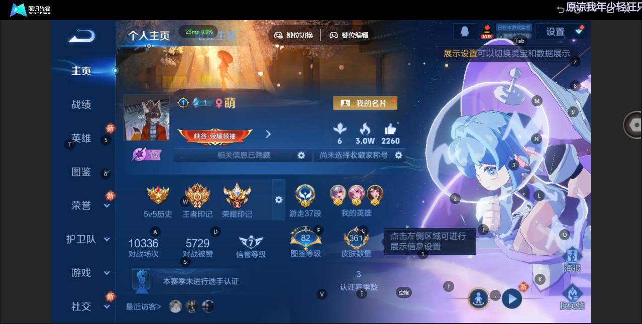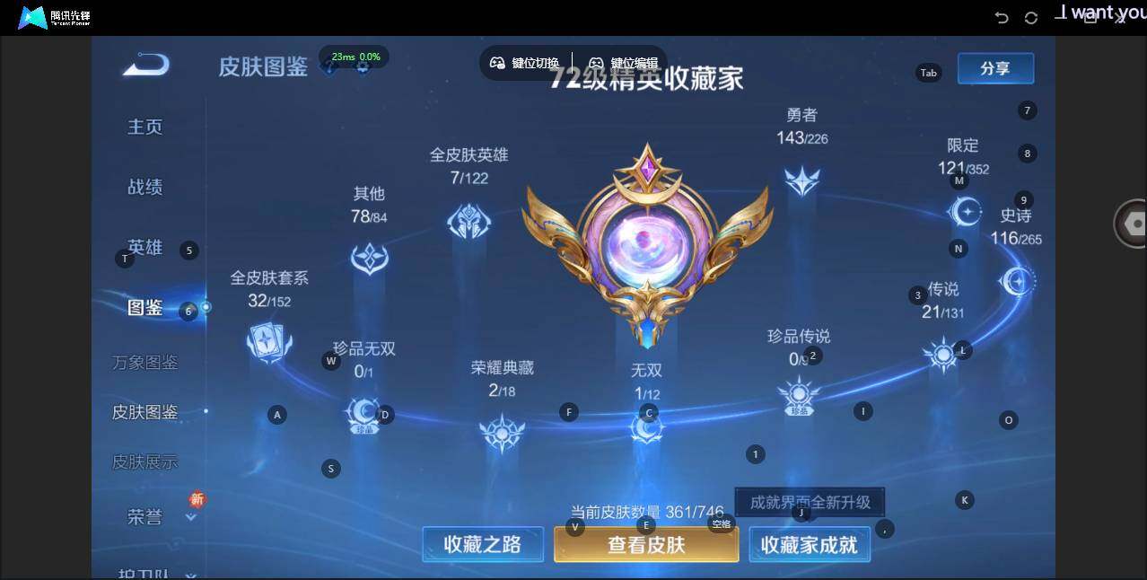 - PX_2012319-贵族等级: V9 英雄数: 124 皮肤数: 333 荣耀水晶: 武则天,九霄神辉,神鉴启示录 无双皮: 青丘·九尾,雪境奇遇-甄姬 珍品传说: 时之奇旅-孙策 传说皮: 黄金射手座,云鹰飞将,绛天战甲,黄金白羊座,猫影幻舞,炽阳神光,一念神魔,末日机甲-孙尚香,地狱火,仲夏夜之梦,地狱之眼,音你心动-周瑜,胖达荣荣,李逍遥,乞巧织情,时之恋人-刘备,游龙清影,淬星耀世,音你