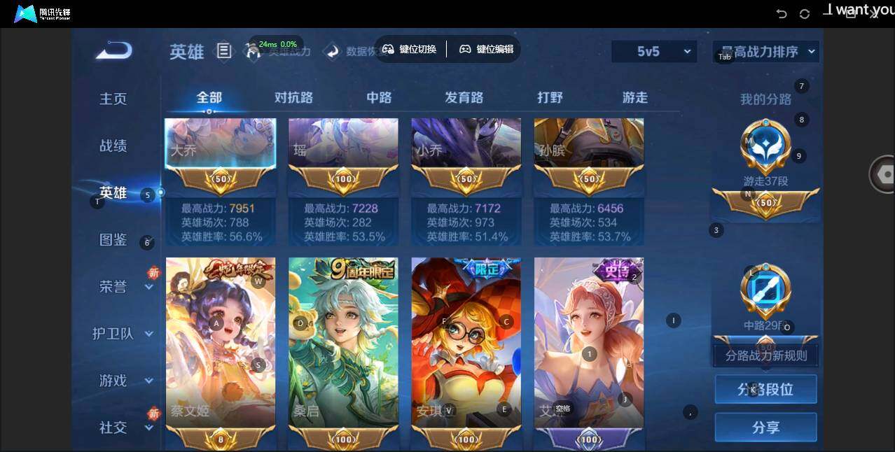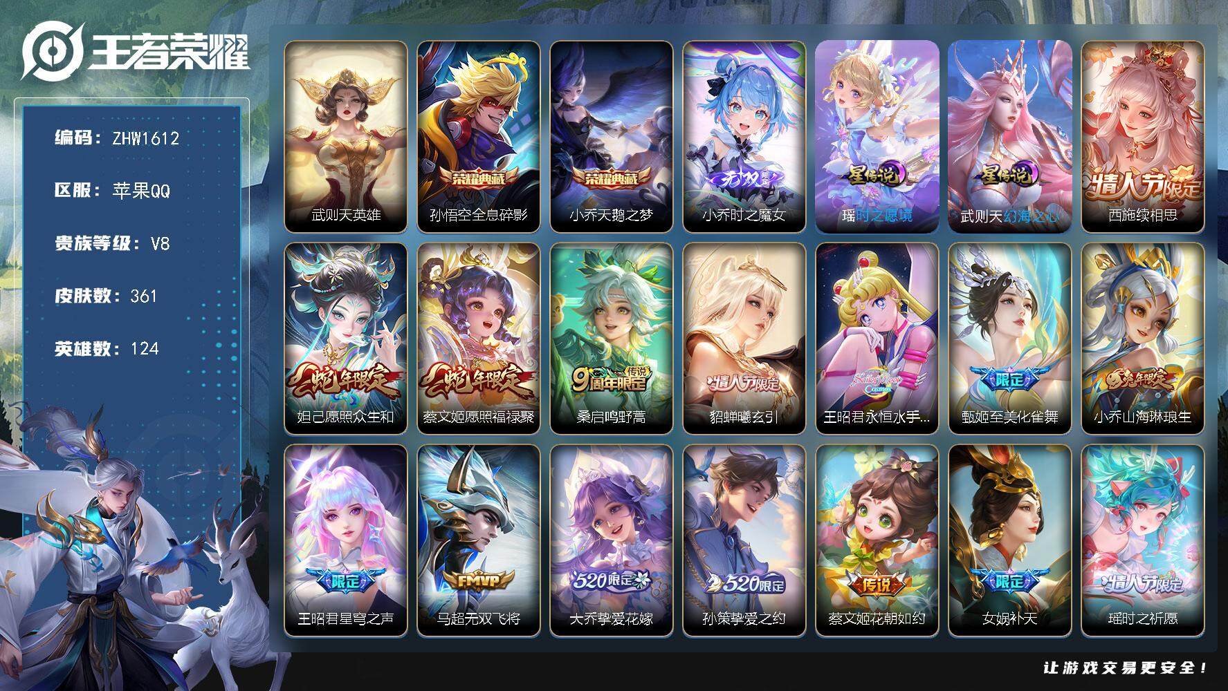[14127487]【店主推荐捡漏号!可直接换绑】苹果Q-V8-荣耀黄金I段位-124英雄-361皮肤-2典藏皮肤-1典藏英雄-1无双-21传说-116史诗