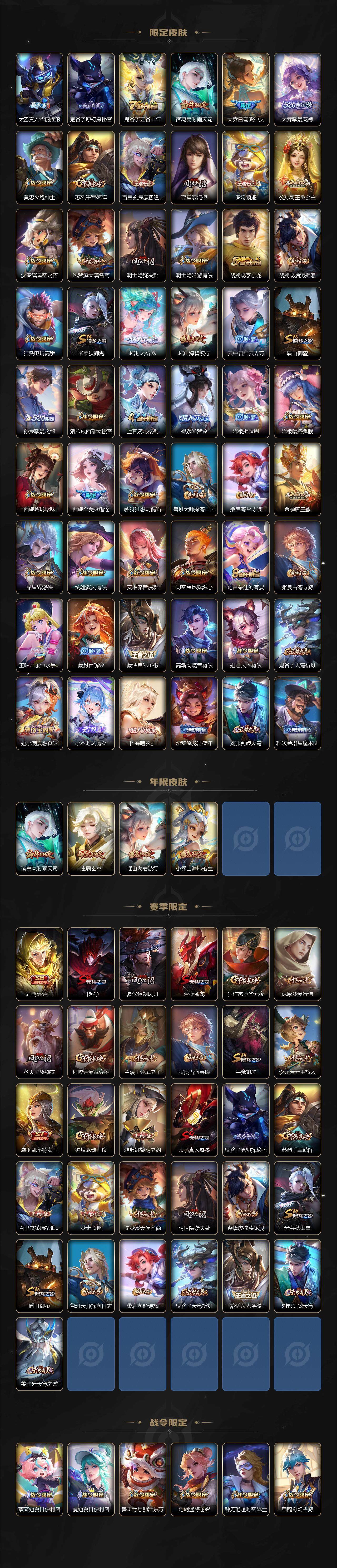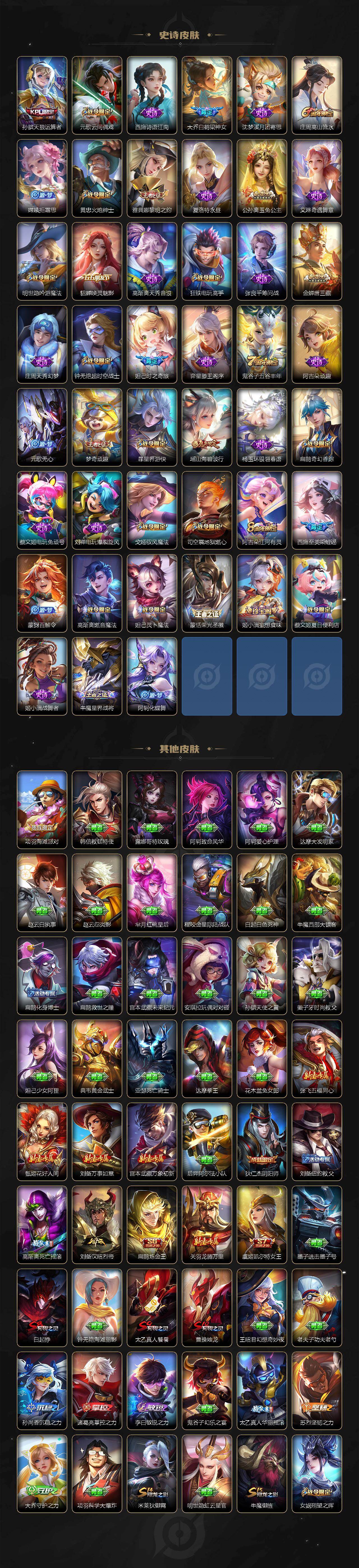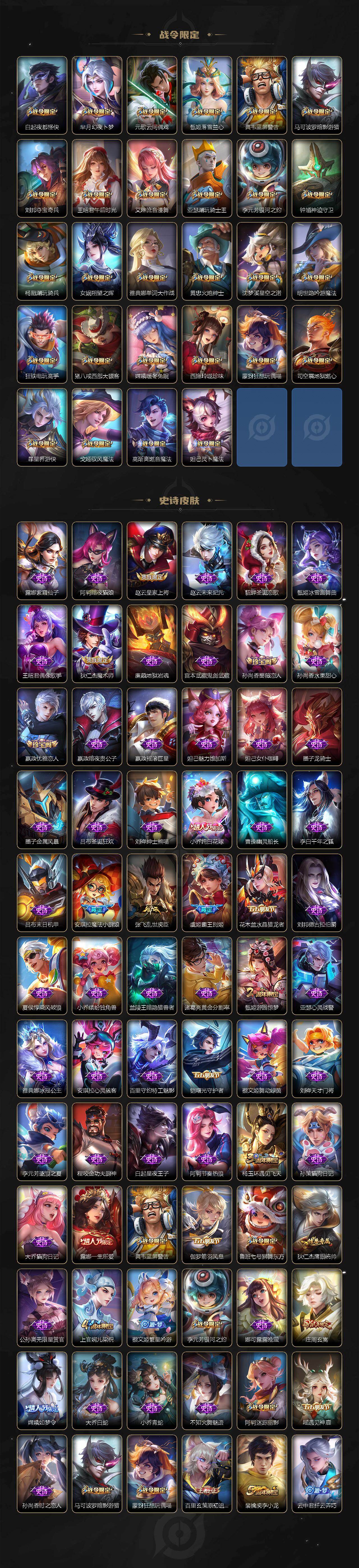 【限定皮肤】:白起狰,蔡文姬夏日便利店,虞姬夏日便利店,姜子牙天穹之誓,狄仁杰阴阳师,小乔纯白花嫁,虞姬凯尔特女王,小乔山海琳琅生,赵云皇家上将,妲己时之奇旅,嬴政优雅恋人,孙尚香蔷薇恋人,鲁班七号狮舞东方,庄周玄嵩,庄周高山流水,高渐离死亡摇滚,阿轲迷踪丽影,钟无艳超时空战士,孙膑天狼运算者,扁鹊炼金王,扁鹊奇幻香踪,白起夜都怪侠,芈月幻夜卜梦,元歌云间偶戏,元歌无心,夏侯惇朔风刀,甄姬游园惊梦,甄姬落雪兰心,甄姬至美化雀舞,曹操烛龙,典韦蓝屏警告,马可波罗暗影游猎,狄仁杰魔术师,狄仁杰万华元夜,达摩沙漠行僧,项羽海滩派对,老夫子醍醐杖,安琪拉魔法小厨娘,程咬金演武夺筹,露娜一生所爱,刘邦夺宝奇兵,王昭君午后时光,王昭君星穹之声,兰陵王金庭之子,亚瑟潮玩骑士王,牛魔御旌,李元芳银河之约,李元芳云中旅人,虞姬霸王别姬,虞姬启明星使,钟馗神迹守卫,钟馗驱傩正仪,杨玉环遇见飞天,杨戬潮玩骑兵,女娲朔望之晖,女娲补天,雅典娜单词大作战,雅典娜黎明之约,蔡文姬繁星吟游,太乙真人饕餮,太乙真人华丽摇滚,鬼谷子原初探秘者,鬼谷子五谷丰年,诸葛亮时雨天司,大乔白鹤梁神女,大乔挚爱花嫁,黄忠火炮绅士,苏烈千军破阵,百里玄策原初追逐者,弈星混沌棋,梦奇顽趣,公孙离玉兔公主,沈梦溪星空之诺,沈梦溪大漠名商,明世隐疑决卦,明世隐吟游魔法,裴擒虎李小龙,裴擒虎擒涛扼浪,狂铁电玩高手,米莱狄御霄,瑶时之祈愿,瑶山海碧波行,云中君纤云弄巧,盾山御銮,孙策挚爱之约,猪八戒西部大镖客,上官婉儿梁祝,嫦娥如梦令,嫦娥拒霜思,嫦娥暖冬兔眠,西施玲珑珍味,西施至美乘鲤谣,蒙犽狂想玩