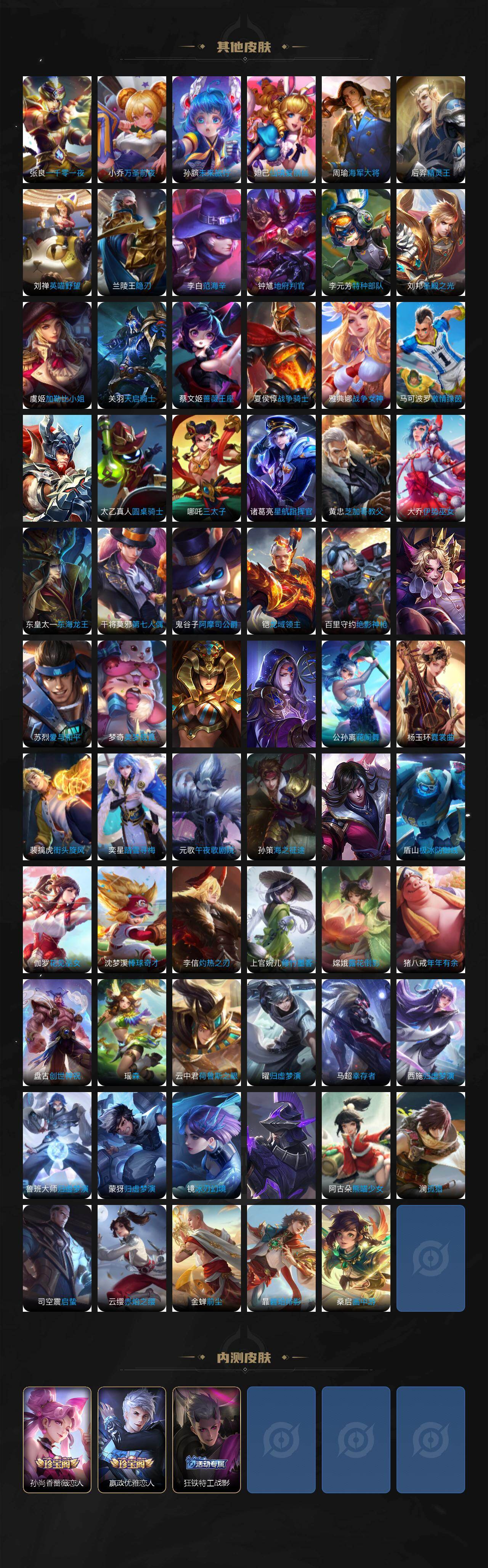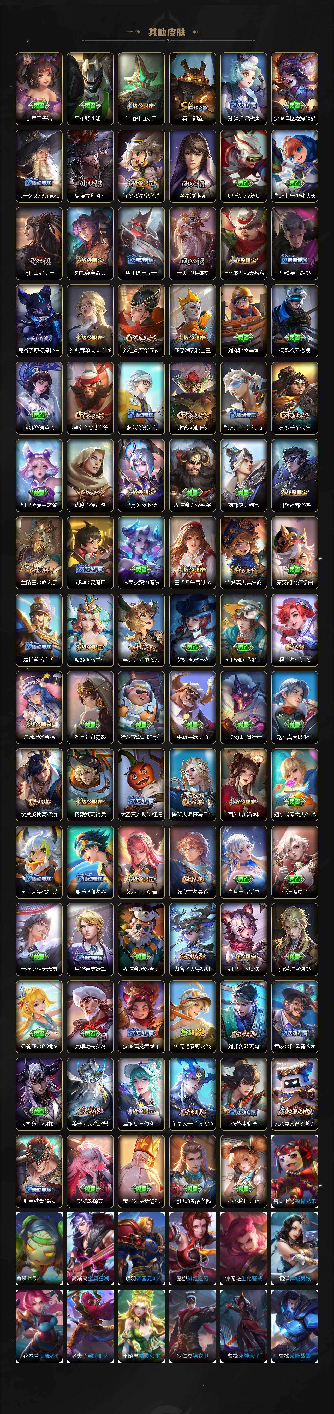 扁鹊炼金王,虞姬凯尔特女王,白起狰,太乙真人饕餮,曹操烛龙,米莱狄御霄,牛魔御旌,盾山御銮,夏侯惇朔风刀,明世隐疑决卦,老夫子醍醐杖,鬼谷子原初探秘者,狄仁杰万华元夜,程咬金演武夺筹,钟馗驱傩正仪,苏烈千军破阵,女娲朔望之晖,典韦蓝屏警告,钟馗神迹守卫,鲁班七号狮舞东方,沈梦溪星空之诺,李元芳银河之约,刘邦夺宝奇兵,马可波罗暗影游猎,蒙犽狂想玩偶喵,元歌云间偶戏,弈星混沌棋,达摩沙漠行僧,兰陵王金庭之子,沈梦溪大漠名商,李元芳云中旅人,桑启海盐诗旅,裴擒虎擒涛扼浪,鲁班大师探海日志,张良古海寻踪
