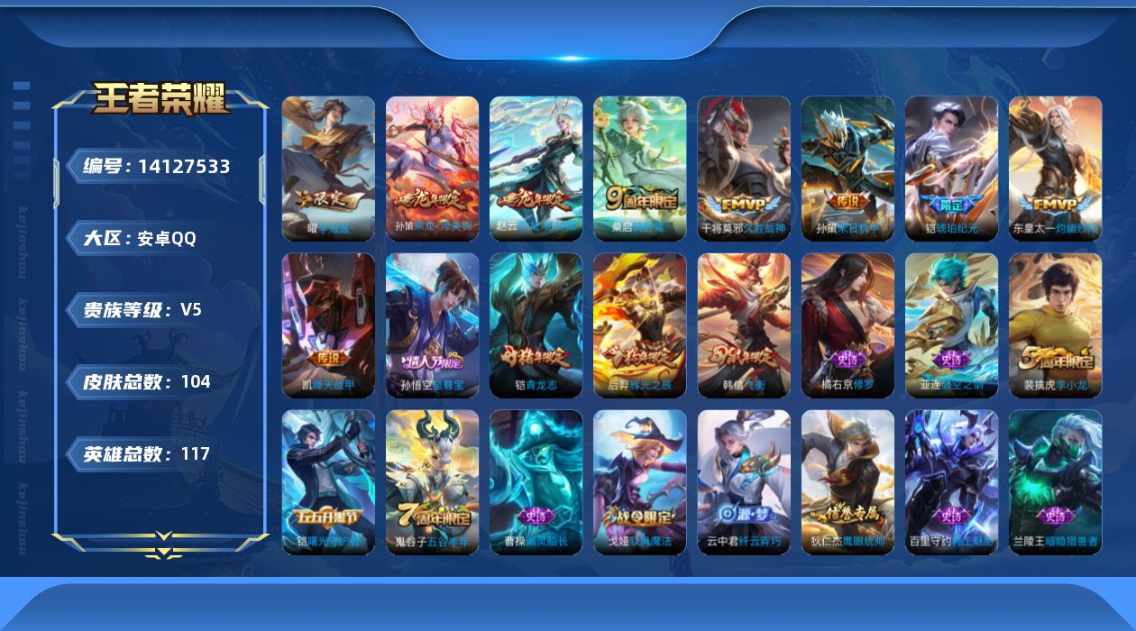 - [12878438]安卓Q-V8-永恒钻石I段位-126英雄-345皮肤-2典藏-11传说-89史诗 【英雄全皮】:孙权全皮,戈娅全皮 【荣耀典藏】:李白鸣剑曳影,花木兰九霄神辉 【传说皮肤】:虞姬愿照岁时盈,云缨幻光神枪,桑启鸣野蒿,露娜霜月吟,不知火舞绯月行,孙策挚爱之约,孙尚香异界灵契,曜李逍遥 ,虞姬启明星使,貂蝉仲夏夜之梦,李白凤求凰 【限定皮肤】:白起狰,狄仁杰阴阳师,虞姬凯尔特女王,赵云皇家上将,嬴政白昼王子,孙尚香蔷薇恋人,孙尚香异界灵契,鲁班七号狮舞东方,庄周蜃楼王,庄周高山流水,高渐离死亡摇滚,钟无艳超时空战士,孙膑妖精王,扁鹊炼金王,白起夜都怪侠,芈月幻夜卜梦,吕布猎兽之王,周瑜赤莲之焰,元歌无心,夏侯惇朔风刀,甄姬女儿国国王,甄姬游园惊梦,甄姬落雪兰心,曹操烛龙,典韦穷奇,典韦蓝屏警告,马可波罗山海玄木吟,狄仁杰魔术师,狄仁杰万华元夜,达摩星际陆战队,达摩沙漠行僧,项羽海滩派对,老夫子醍醐杖,关羽冰锋战神,貂蝉逐梦之音,程咬金演武夺筹,露娜一生所爱,韩信飞衡,韩信傲雪梅枪,王昭君午后时光,兰陵王驯魔猎人,兰陵王金庭之子,不知火舞绯月行,孙悟空孙行者,牛魔御旌,后羿如梦令,后羿圣弓游侠,李元芳银河之约,李元芳云中旅人,虞姬启明星使,钟馗神迹守卫,钟馗驱傩正仪,女娲朔望之晖,干将莫邪胡桃夹子,干将莫邪真爱魔法,雅典娜单词大作战,雅典娜黎明之约,蔡文姬繁星吟游,太乙真人饕餮,鬼谷子原初探秘者,鬼谷子五谷丰年,黄忠火炮绅士,苏烈千军破阵,百里玄策原初追逐者,百里守约朱雀志,弈星混沌棋,梦奇顽趣,沈梦溪星空之诺,沈梦溪大漠名商,明世隐疑决卦,明世隐吟游魔法,裴擒虎李小龙,裴擒虎擒涛扼浪,狂铁御狮,狂铁电玩高手,米莱狄御霄,云中君纤云弄巧,云中君时之祈愿,伽罗天狼溯光者,盾山御銮,孙策挚爱之约,猪八戒猪悟能,上官婉儿梁祝,嫦娥拒霜思,嫦娥暖冬兔眠,曜李逍遥 ,西施玲珑珍味,西施至美乘鲤谣,蒙犽狂想玩偶喵,鲁班大师探海日志,桑启海盐诗旅,暃星界游侠,戈娅驭风魔法,艾琳女武神,阿古朵江河有灵,张良古海寻踪,蒙犽百解令,高渐离燃音魔法,妲己灵卜魔法,鬼谷子天穹祈灯,沈梦溪龙舞盛年,刘邦剑破天穹,程咬金群星魔术团,镜青焰无极,项羽苍威无极,周瑜熔金海岸 【年限皮肤】:百里守约朱雀志,李白凤求凰,韩信飞衡,马可波罗山海玄木吟 【赛季限定】:庄周蜃楼王,孙膑妖精王,扁鹊炼金王,白起狰