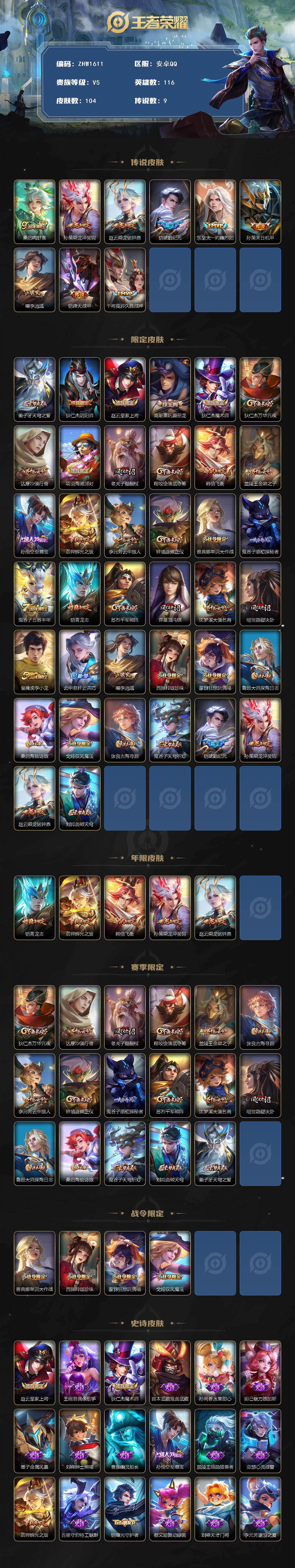 [14127533]可二次【店主推荐捡漏号!可直接换绑】安卓Q-V5-永恒钻石II段位-116英雄-104皮肤-9传说-29史诗