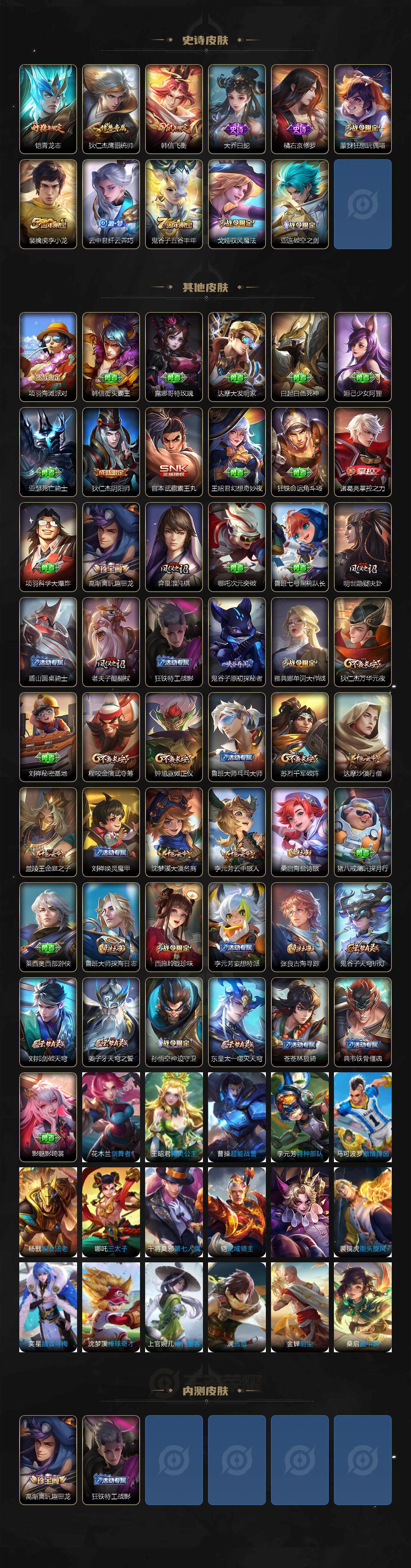 【限定皮肤】:姜子牙天穹之誓,狄仁杰阴阳师,赵云皇家上将,高渐离玩趣恶龙,狄仁杰魔术师,狄仁杰万华元夜,达摩沙漠行僧,项羽海滩派对,老夫子醍醐杖,程咬金演武夺筹,韩信飞衡,兰陵王金庭之子,孙悟空至尊宝,后羿辉光之辰,李元芳云中旅人,钟馗驱傩正仪,雅典娜单词大作战,鬼谷子原初探秘者,鬼谷子五谷丰年,铠青龙志,苏烈千军破阵,弈星混沌棋,沈梦溪大漠名商,明世隐疑决卦,裴擒虎李小龙,云中君纤云弄巧,曜李逍遥 ,西施玲珑珍味,蒙犽狂想玩偶喵,鲁班大师探海日志,桑启海盐诗旅,戈娅驭风魔法,张良古海寻踪,鬼谷子天穹祈灯,铠琥珀纪元,孙策乘龙淬吴钩,赵云乘龙铭钟鼎,刘邦剑破天穹