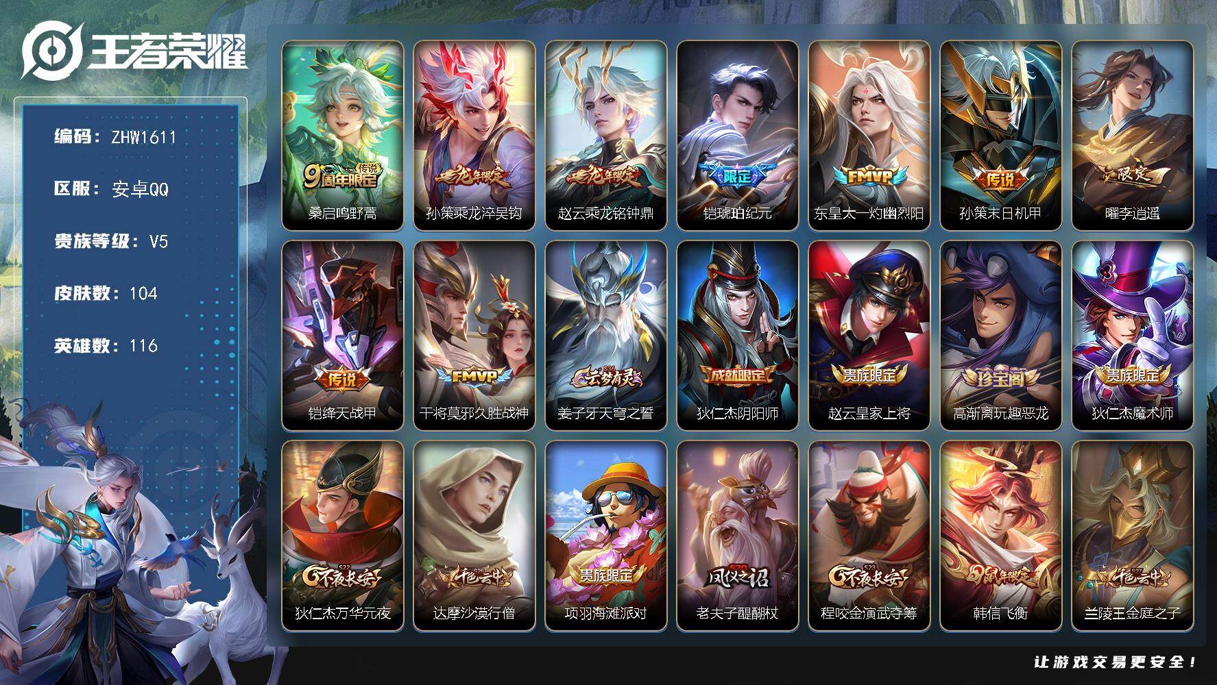 [14127533]可二次【店主推荐捡漏号!可直接换绑】安卓Q-V5-永恒钻石II段位-116英雄-104皮肤-9传说-29史诗 【英雄全皮】:影全皮 【传说皮肤】:桑启鸣野蒿,孙策乘龙淬吴钩,赵云乘龙铭钟鼎,铠琥珀纪元,东皇太一灼幽烈阳,孙策末日机甲,曜李逍遥 ,铠绛天战甲,干将莫邪久胜战神 【限定皮肤】:姜子牙天穹之誓,狄仁杰阴阳师,赵云皇家上将,高渐离玩趣恶龙,狄仁杰魔术师,狄仁杰万华元夜,达摩沙漠行僧,项羽海滩派对,老夫子醍醐杖,程咬金演武夺筹,韩信飞衡,兰陵王金庭之子,孙悟空至尊宝,后羿辉光之辰,李元芳云中旅人,钟馗驱傩正仪,雅典娜单词大作战,鬼谷子原初探秘者,鬼谷子五谷丰年,铠青龙志,苏烈千军破阵,弈星混沌棋,沈梦溪大漠名商,明世隐疑决卦,裴擒虎李小龙,云中君纤云弄巧,曜李逍遥 ,西施玲珑珍味,蒙犽狂想玩偶喵,鲁班大师探海日志,桑启海盐诗旅,戈娅驭风魔法,张良古海寻踪,鬼谷子天穹祈灯,铠琥珀纪元,孙策乘龙淬吴钩,赵云乘龙铭钟鼎,刘邦剑破天穹 【年限皮肤】:铠青龙志,后羿辉光之辰,韩信飞衡,孙策乘龙淬吴钩,赵云乘龙铭钟鼎 【赛季限定】:狄仁杰万华元夜,达摩沙漠行僧,老夫子醍醐杖,程咬金演武夺筹,兰陵王金庭之子,张良古海寻踪,李元芳云中旅人,钟馗驱傩正仪,鬼谷子原初探秘者,苏烈千军破阵,弈星混沌棋,沈梦溪大漠名商,明世隐疑决卦,鲁班大师探海日志,桑启海盐诗旅,鬼谷子天穹祈灯,刘邦剑破天穹,姜子牙天穹之誓 【战令限定】:雅典娜单词大作战,西施玲珑珍味,蒙犽狂想玩偶喵,戈娅驭风魔法 【史诗皮肤】:赵云皇家上将,王昭君偶像歌手,狄仁杰魔术师,宫本武藏鬼剑武藏,孙尚香水果甜心,妲己魅力维加斯,墨子金属风暴,刘禅绅士熊喵,曹操幽灵船长,孙悟空至尊宝,兰陵王暗隐猎兽者,亚瑟心灵战警,后羿辉光之辰,百里守约特工魅影,铠曙光守护者,蔡文姬舞动绿茵,刘禅天才门将,李元芳逐浪之夏,铠青龙志,狄仁杰鹰眼统帅,韩信飞衡,大乔白蛇,橘右京修罗,蒙犽狂想玩偶喵,裴擒虎李小龙,云中君纤云弄巧,鬼谷子五谷丰年,戈娅驭风魔法,亚连破空之剑 【其他皮肤】:项羽海滩派对,韩信街头霸王,露娜哥特玫瑰,达摩大发明家,白起白色死神,妲己少女阿狸,亚瑟死亡骑士,狄仁杰阴阳师,宫本武藏霸王丸,王昭君幻想奇妙夜,狂铁命运角斗场,诸葛亮掌控之力,项羽科学大爆炸,高渐离玩趣恶龙,弈星混沌棋,哪吒次元突破,鲁班七号黑桃队长,明世隐