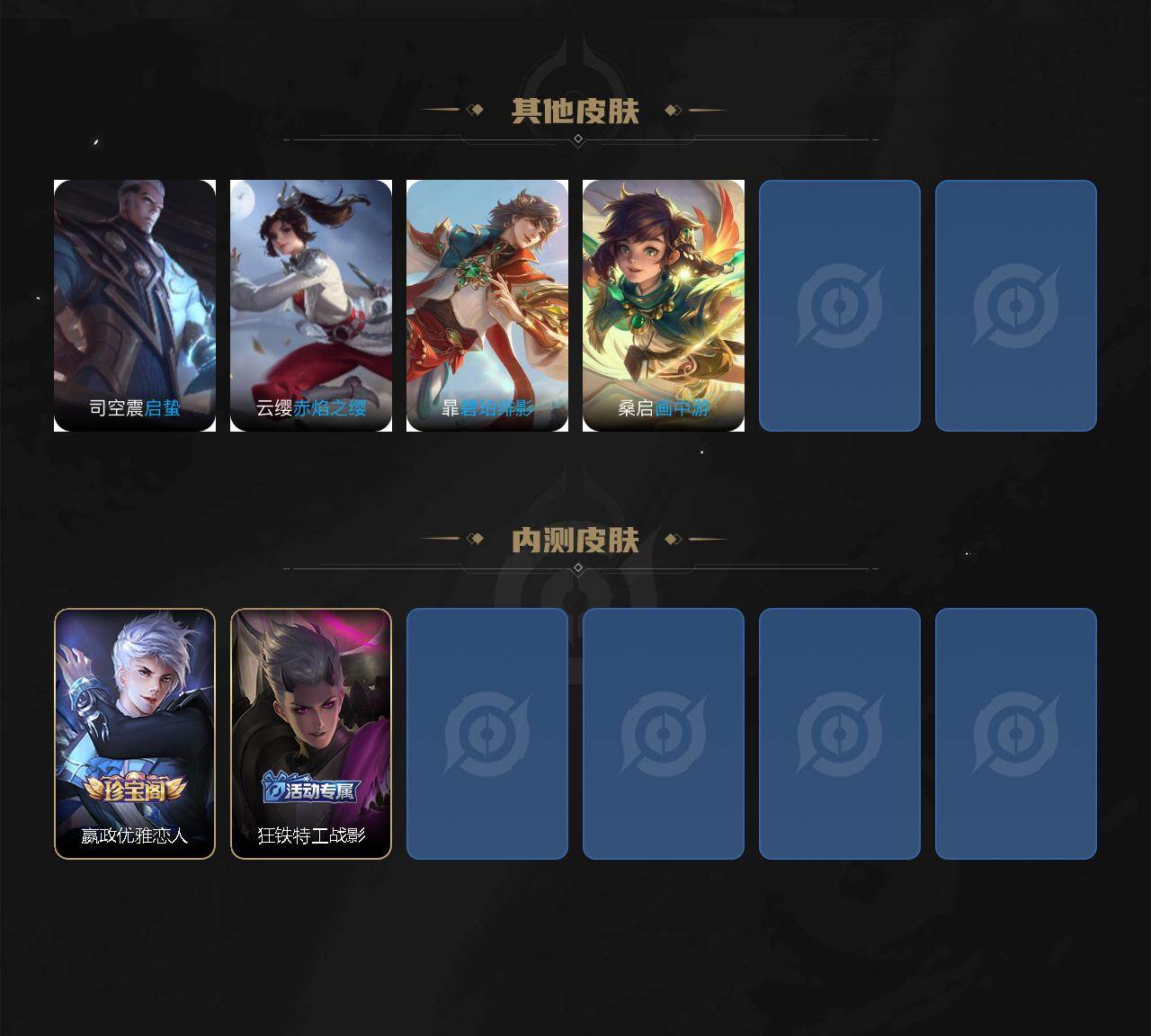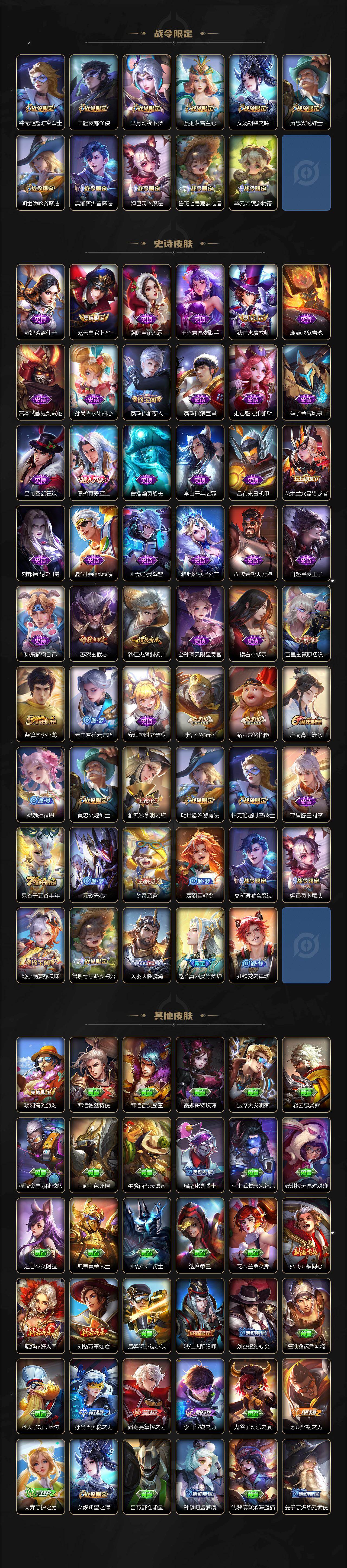 【限定皮肤】:狄仁杰阴阳师,赵云皇家上将,嬴政优雅恋人,庄周高山流水,钟无艳超时空战士,白起夜都怪侠,芈月幻夜卜梦,周瑜真爱至上,元歌无心,甄姬落雪兰心,狄仁杰魔术师,狄仁杰万华元夜,达摩沙漠行僧,项羽海滩派对,老夫子醍醐杖,程咬金演武夺筹,兰陵王金庭之子,不知火舞绯月行,孙悟空孙行者,李元芳云中旅人,钟馗驱傩正仪,女娲朔望之晖,雅典娜黎明之约,鬼谷子原初探秘者,鬼谷子五谷丰年,黄忠火炮绅士,苏烈玄武志,苏烈千军破阵,百里玄策原初追逐者,弈星混沌棋,梦奇顽趣,沈梦溪大漠名商,明世隐疑决卦,明世隐吟游魔法,裴擒虎李小龙,裴擒虎寅虎赤拳,裴擒虎擒涛扼浪,云中君纤云弄巧,猪八戒猪悟能,嫦娥拒霜思,鲁班大师探海日志,桑启海盐诗旅,张良古海寻踪,蒙犽百解令,高渐离燃音魔法,妲己灵卜魔法,鬼谷子天穹祈灯,姬小满妄想食味,沈梦溪龙舞盛年,鲁班七号蔬乡物语,李元芳蔬乡物语,刘邦剑破天穹,关羽决胜骁骑,周瑜熔金海岸