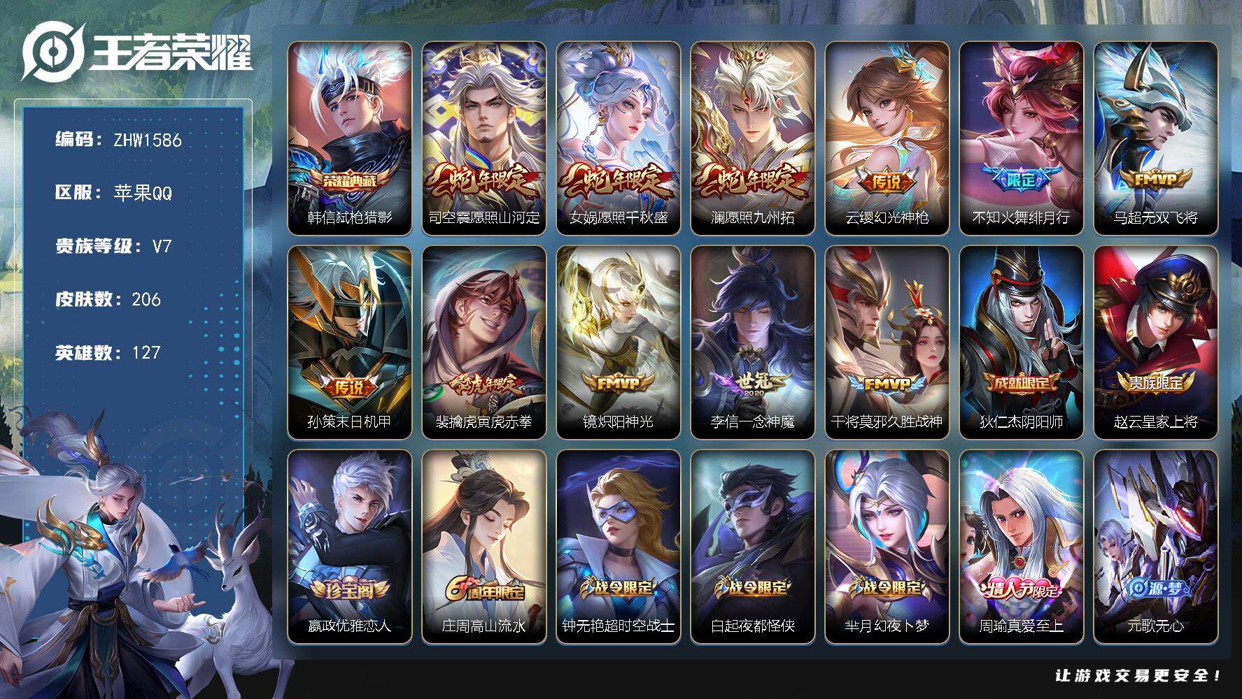 [14128139]可二次【店主推荐捡漏号!可直接换绑】苹果Q-V7-至尊星耀III段位-127英雄-206皮肤-1典藏-11传说-52史诗 【荣耀典藏】:韩信弑枪猎影 【传说皮肤】:司空震愿照山河定,女娲愿照千秋盛,澜愿照九州拓,云缨幻光神枪,不知火舞绯月行,马超无双飞将,孙策末日机甲,裴擒虎寅虎赤拳,镜炽阳神光,李信一念神魔,干将莫邪久胜战神 【限定皮肤】:狄仁杰阴阳师,赵云皇家上将,嬴政优雅恋人,庄周高山流水,钟无艳超时空战士,白起夜都怪侠,芈月幻夜卜梦,周瑜真爱至上,元歌无心,甄姬落雪兰心,狄仁杰魔术师,狄仁杰万华元夜,达摩沙漠行僧,项羽海滩派对,老夫子醍醐杖,程咬金演武夺筹,兰陵王金庭之子,不知火舞绯月行,孙悟空孙行者,李元芳云中旅人,钟馗驱傩正仪,女娲朔望之晖,雅典娜黎明之约,鬼谷子原初探秘者,鬼谷子五谷丰年,黄忠火炮绅士,苏烈玄武志,苏烈千军破阵,百里玄策原初追逐者,弈星混沌棋,梦奇顽趣,沈梦溪大漠名商,明世隐疑决卦,明世隐吟游魔法,裴擒虎李小龙,裴擒虎寅虎赤拳,裴擒虎擒涛扼浪,云中君纤云弄巧,猪八戒猪悟能,嫦娥拒霜思,鲁班大师探海日志,桑启海盐诗旅,张良古海寻踪,蒙犽百解令,高渐离燃音魔法,妲己灵卜魔法,鬼谷子天穹祈灯,姬小满妄想食味,沈梦溪龙舞盛年,鲁班七号蔬乡物语,李元芳蔬乡物语,刘邦剑破天穹,关羽决胜骁骑,周瑜熔金海岸 【年限皮肤】:苏烈玄武志,裴擒虎寅虎赤拳 【赛季限定】:狄仁杰万华元夜,达摩沙漠行僧,老夫子醍醐杖,程咬金演武夺筹,兰陵王金庭之子,张良古海寻踪,李元芳云中旅人,钟馗驱傩正仪,雅典娜黎明之约,鬼谷子原初探秘者,苏烈千军破阵,百里玄策原初追逐者,弈星混沌棋,梦奇顽趣,沈梦溪大漠名商,明世隐疑决卦,裴擒虎擒涛扼浪,鲁班大师探海日志,桑启海盐诗旅,鬼谷子天穹祈灯,刘邦剑破天穹 【战令限定】:钟无艳超时空战士,白起夜都怪侠,芈月幻夜卜梦,甄姬落雪兰心,女娲朔望之晖,黄忠火炮绅士,明世隐吟游魔法,高渐离燃音魔法,妲己灵卜魔法,鲁班七号蔬乡物语,李元芳蔬乡物语 【史诗皮肤】:露娜紫霞仙子,赵云皇家上将,貂蝉圣诞恋歌,王昭君偶像歌手,狄仁杰魔术师,廉颇地狱岩魂,宫本武藏鬼剑武藏,孙尚香水果甜心,嬴政优雅恋人,嬴政摇滚巨星,妲己魅力维加斯,墨子金属风暴,吕布圣诞狂欢,周瑜真爱至上,曹操幽灵船长,李白千年之狐,吕布末日机甲,花木兰水晶猎龙者,刘邦德古拉伯爵,夏侯惇