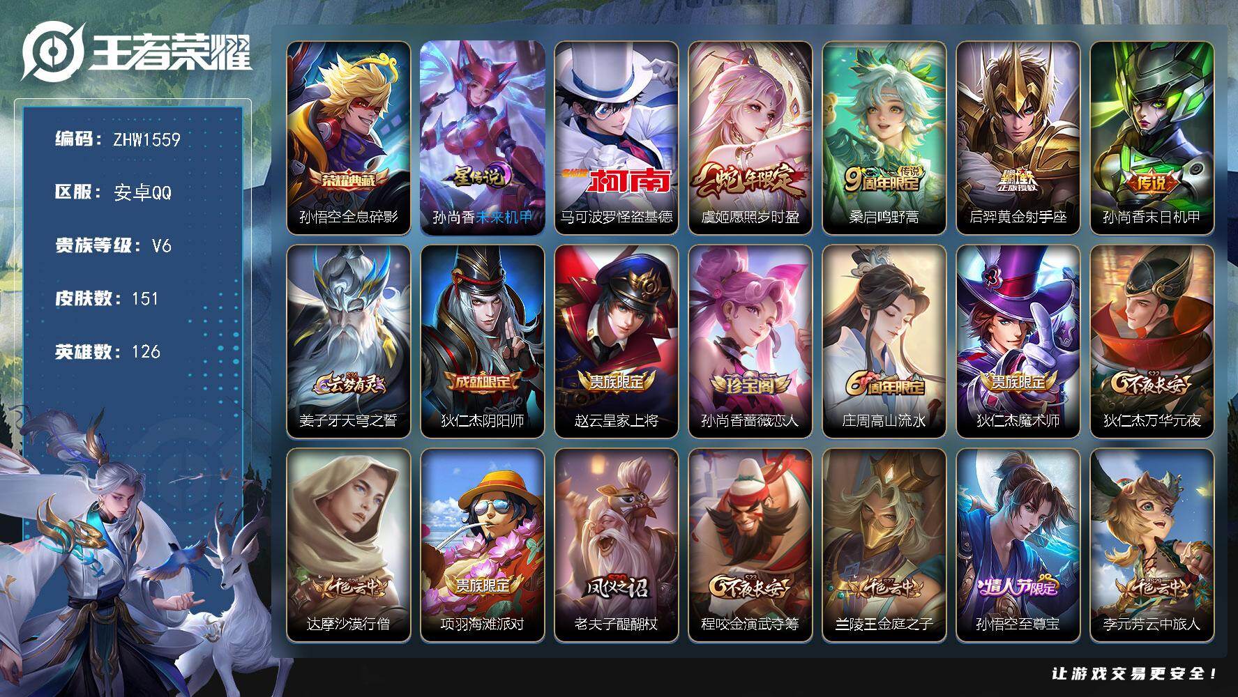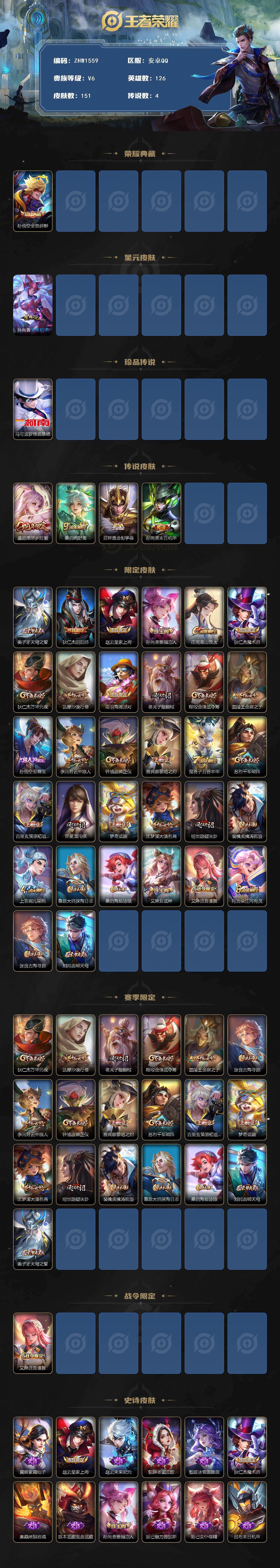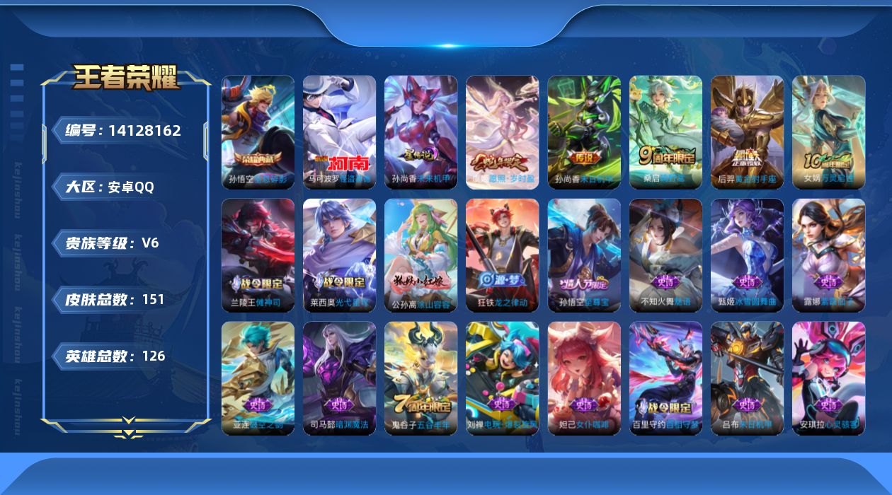 [14128162]【店主推荐捡漏号!可直接换绑】发育路36段,安卓Q-V6-最强王者段位-126英雄-151皮肤-1典藏皮肤-1珍品传说-1星传说-4传说-42史诗 【英雄全皮】:孙权全皮 【荣耀典藏】:孙悟空全息碎影 【珍品传说】:马可波罗怪盗基德 【传说皮肤】:虞姬愿照岁时盈,桑启鸣野蒿,后羿黄金射手座,孙尚香末日机甲 【限定皮肤】:姜子牙天穹之誓,狄仁杰阴阳师,赵云皇家上将,孙尚香蔷薇恋人,庄周高山流水,狄仁杰魔术师,狄仁杰万华元夜,达摩沙漠行僧,项羽海滩派对,老夫子醍醐杖,程咬金演武夺筹,兰陵王金庭之子,孙悟空至尊宝,李元芳云中旅人,钟馗驱傩正仪,雅典娜黎明之约,鬼谷子五谷丰年,苏烈千军破阵,百里玄策原初追逐者,弈星混沌棋,梦奇顽趣,沈梦溪大漠名商,明世隐疑决卦,裴擒虎擒涛扼浪,上官婉儿梁祝,鲁班大师探海日志,桑启海盐诗旅,艾琳女武神,艾琳流音漫舞,阿古朵江河有灵,张良古海寻踪,刘邦剑破天穹 【赛季限定】:狄仁杰万华元夜,达摩沙漠行僧,老夫子醍醐杖,程咬金演武夺筹,兰陵王金庭之子,张良古海寻踪,李元芳云中旅人,钟馗驱傩正仪,雅典娜黎明之约,苏烈千军破阵,百里玄策原初追逐者,弈星混沌棋,梦奇顽趣,沈梦溪大漠名商,明世隐疑决卦,裴擒虎擒涛扼浪,鲁班大师探海日志,桑启海盐诗旅,刘邦剑破天穹,姜子牙天穹之誓 【战令限定】:艾琳流音漫舞 【史诗皮肤】:露娜紫霞仙子,赵云皇家上将,赵云未来纪元,貂蝉圣诞恋歌,甄姬冰雪圆舞曲,狄仁杰魔术师,廉颇地狱岩魂,宫本武藏鬼剑武藏,孙尚香蔷薇恋人,妲己魅力维加斯,妲己女仆咖啡,吕布末日机甲,孙悟空至尊宝,夏侯惇乘风破浪,小乔缤纷独角兽,兰陵王暗隐猎兽者,诸葛亮黄金分割率,雅典娜冰冠公主,安琪拉心灵骇客,百里守约特工魅影,李元芳逐浪之夏,阿轲节奏热浪,伽罗箭羽风息,狄仁杰鹰眼统帅,上官婉儿梁祝,不知火舞魅语,百里玄策原初追逐者,庄周高山流水,司马懿暗渊魔法,雅典娜黎明之约,鬼谷子五谷丰年,梦奇顽趣,刘禅电玩爆裂旋风,阿古朵江河有灵,亚连破空之剑,百里守约百相守梦,狂铁龙之律动,公孙离涂山容容,莱西奥光弋星穹,兰陵王傩神司,女娲万灵启世,少司缘巫礼祀神 【其他皮肤】:项羽海滩派对,韩信教廷特使,韩信街头霸王,赵云忍炎影,艾琳女武神,扁鹊化身博士,宫本武藏未来纪元,妲己少女阿狸,典韦黄金武士,亚瑟死亡骑士,达摩拳王,花木兰兔女郎,甄姬花好人间,宫本武藏万