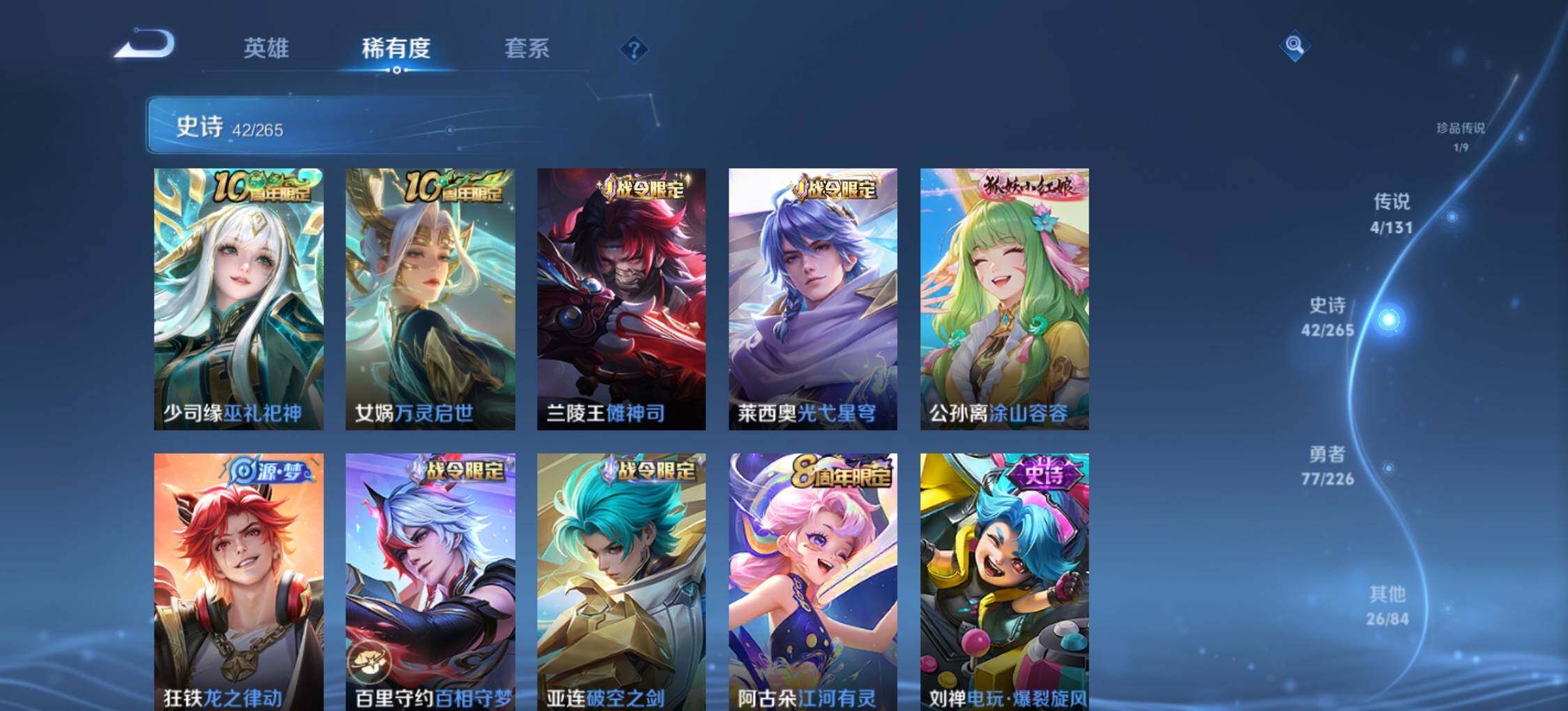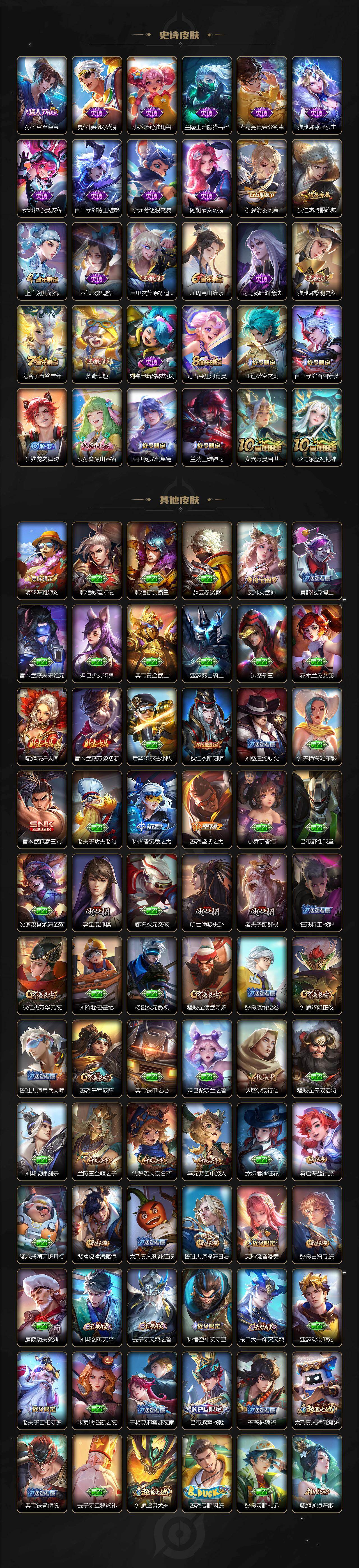 【史诗皮肤】:露娜紫霞仙子,赵云皇家上将,赵云未来纪元,貂蝉圣诞恋歌,甄姬冰雪圆舞曲,狄仁杰魔术师,廉颇地狱岩魂,宫本武藏鬼剑武藏,孙尚香蔷薇恋人,妲己魅力维加斯,妲己女仆咖啡,吕布末日机甲,孙悟空至尊宝,夏侯惇乘风破浪,小乔缤纷独角兽,兰陵王暗隐猎兽者,诸葛亮黄金分割率,雅典娜冰冠公主,安琪拉心灵骇客,百里守约特工魅影,李元芳逐浪之夏,阿轲节奏热浪,伽罗箭羽风息,狄仁杰鹰眼统帅,上官婉儿梁祝,不知火舞魅语,百里玄策原初追逐者,庄周高山流水,司马懿暗渊魔法,雅典娜黎明之约,鬼谷子五谷丰年,梦奇顽趣,刘禅电玩爆裂旋风,阿古朵江河有灵,亚连破空之剑,百里守约百相守梦,狂铁龙之律动,公孙离涂山容容,莱西奥光弋星穹,兰陵王傩神司,女娲万灵启世,少司缘巫礼祀神