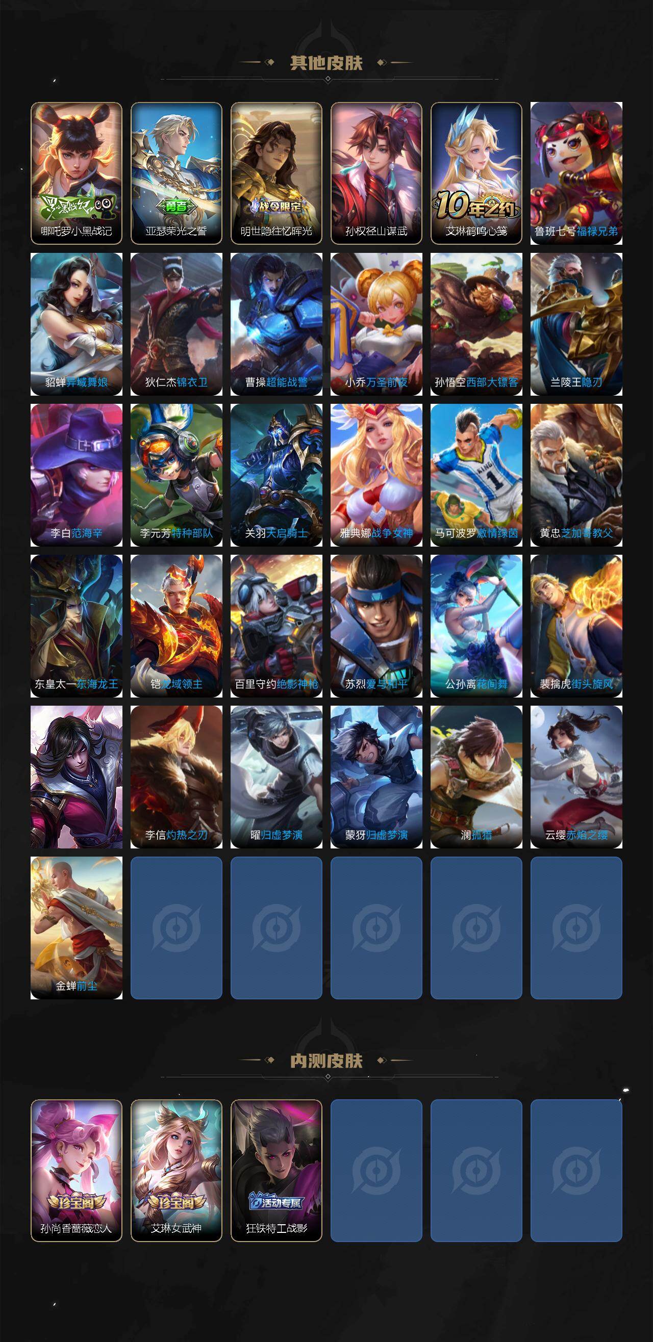 【限定皮肤】:姜子牙天穹之誓,狄仁杰阴阳师,赵云皇家上将,孙尚香蔷薇恋人,庄周高山流水,狄仁杰魔术师,狄仁杰万华元夜,达摩沙漠行僧,项羽海滩派对,老夫子醍醐杖,程咬金演武夺筹,兰陵王金庭之子,孙悟空至尊宝,李元芳云中旅人,钟馗驱傩正仪,雅典娜黎明之约,鬼谷子五谷丰年,苏烈千军破阵,百里玄策原初追逐者,弈星混沌棋,梦奇顽趣,沈梦溪大漠名商,明世隐疑决卦,裴擒虎擒涛扼浪,上官婉儿梁祝,鲁班大师探海日志,桑启海盐诗旅,艾琳女武神,艾琳流音漫舞,阿古朵江河有灵,张良古海寻踪,刘邦剑破天穹