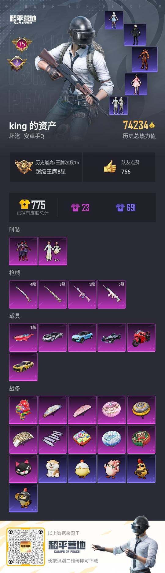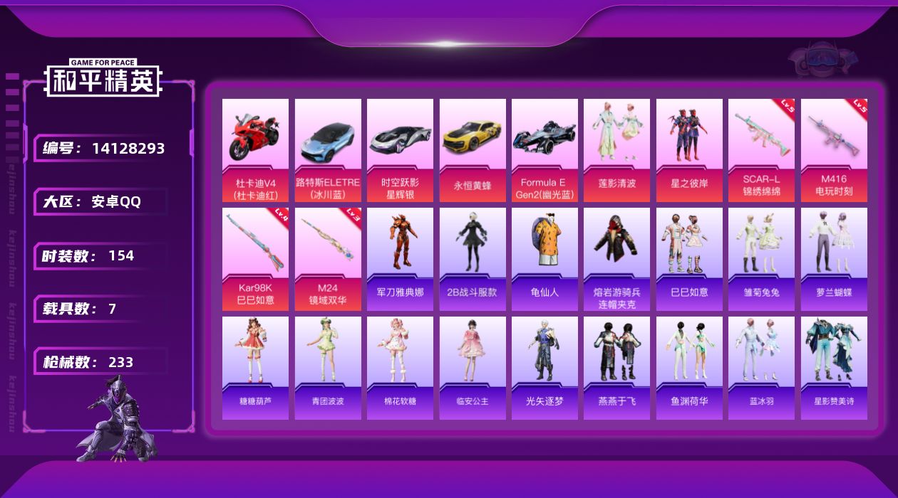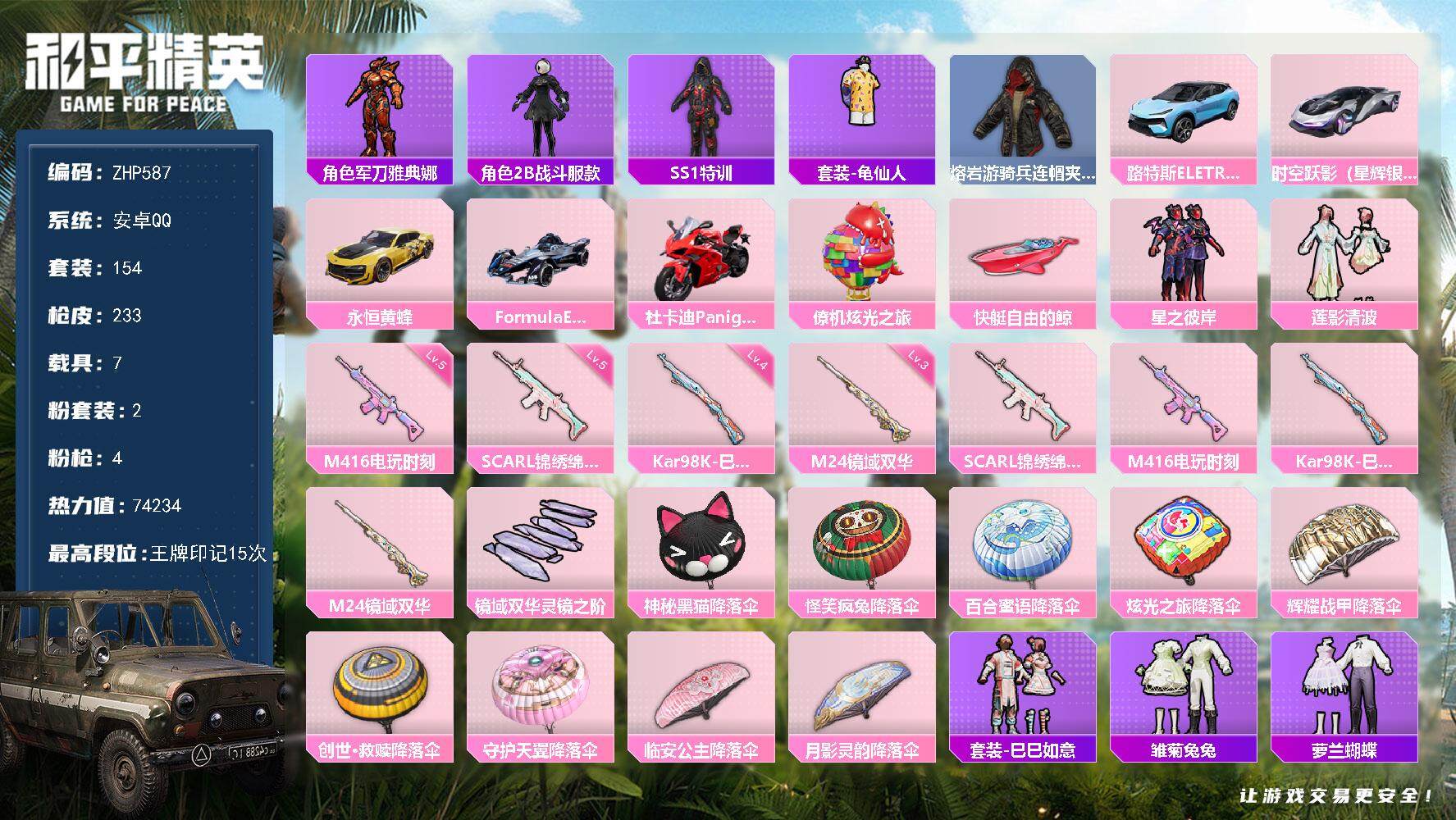 [14128293]可二次【店主推荐捡漏号!可直接换绑】/素材身法号/扭蛋碎片538 安卓 手Q-2粉装-4特效枪-7载具-1粉色飞行器-7.4w热力值-15王牌印记-154套装-233枪皮【热门品类】:角色-军刀雅典娜,角色-2B战斗服款,套装-SS1特训,套装-龟仙人,熔岩游骑兵连帽夹克【粉色载具】:路特斯ELETRE(冰川蓝),时空跃影(星辉银),永恒黄蜂,Formula E Gen2(幽光蓝),杜卡迪 Panigale V4(杜卡迪红),僚机-炫光之旅,快艇-自由的鲸【粉色套装】:粉装-星之彼岸,粉装-莲影清波【粉色枪皮等级】:SCAR-L-锦绣绵绵(五级),M416-电玩时刻(五级),Kar98K-巳巳如意(四级),M24-镜域双华(三级)【粉色飞行器】:镜域双华-灵镜之阶