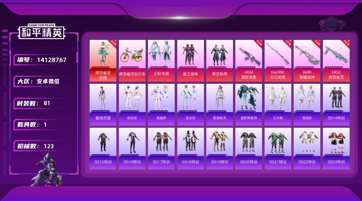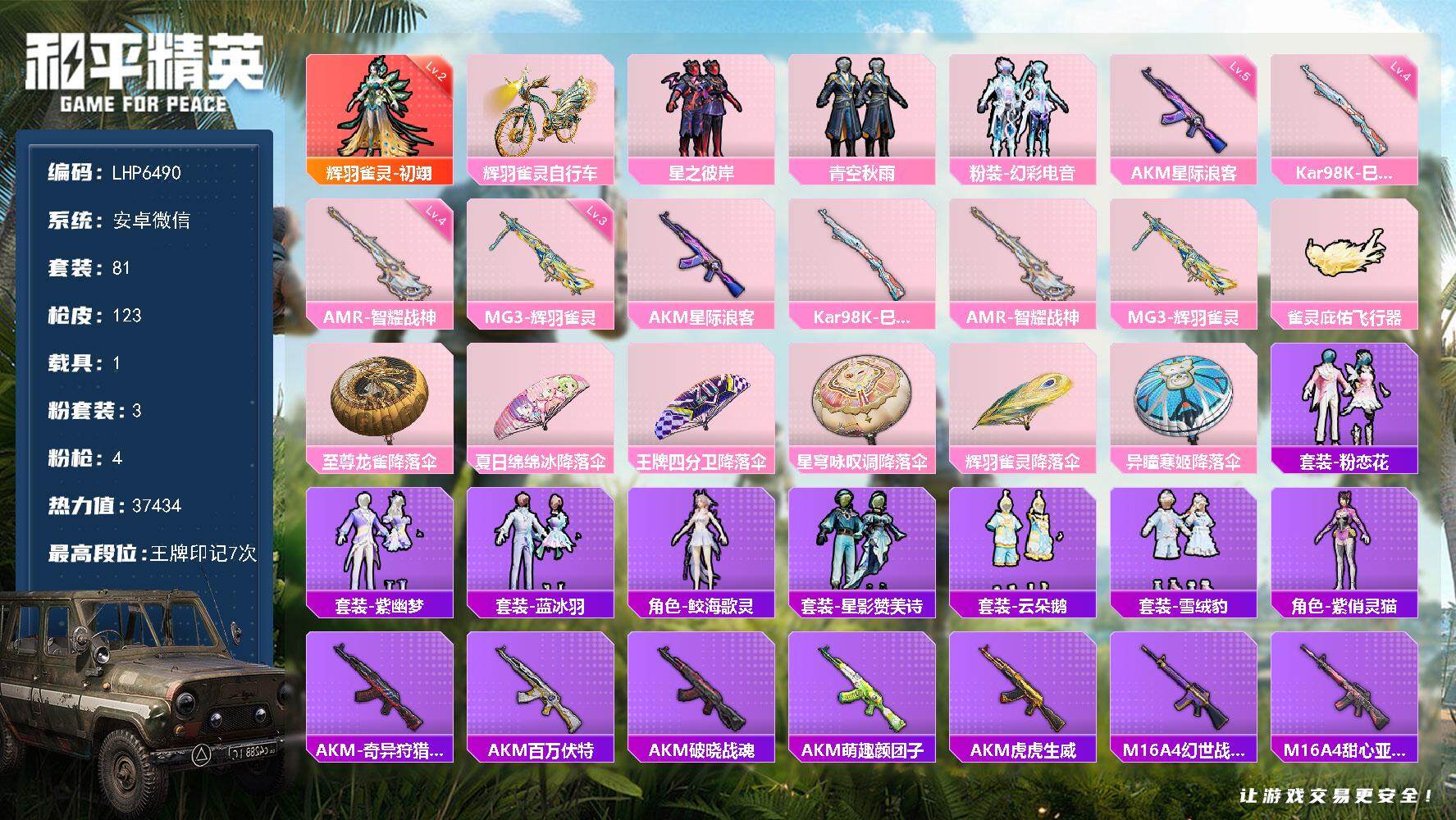 [14128767]素材身法号 安卓 微信-1神装-3粉装-4特效枪-1载具-1粉色飞行器-3.7w热力值-7王牌印记-81套装-123枪皮【红色神装等级】:辉羽雀灵-初翊(二级)【粉色载具】:辉羽雀灵自行车【粉色套装】:粉装-星之彼岸,粉装-青空秋雨,粉装-幻彩电音【粉色枪皮等级】:AKM-星际浪客(五级),Kar98K-巳巳如意(四级),AMR-智耀战神(四级),MG3-辉羽雀灵(三级)【粉色飞行器】:雀灵庇佑飞行器
