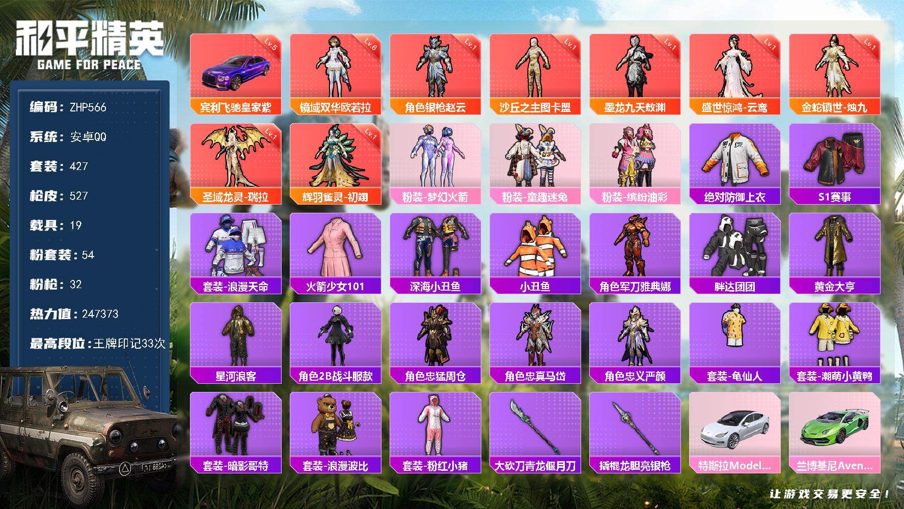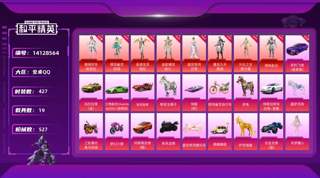 [14128564]可二次【店主推荐捡漏号!可直接换绑】/素材身法号/8套6级红装可随意切换/老101/宾利飞驰(皇家紫)(五级)/M416-超新星(九级)/绝世印记2/地铁满天赋 安卓 手Q-8神装-54粉装-32特效枪-19载具-20粉色飞行器-24.7w热力值-33王牌印记-427套装-527枪皮【红色载具】:宾利飞驰(皇家紫)(五级【红色神装等级】:辉羽雀灵-初翊(一级),圣域龙灵-瑞拉(一级),金蛇镇世-烛九(一级),盛世惊鸿-云鸾(一级),墨龙九天-敖渊(一级),镜域双华-欧若拉(六级),沙丘之主-图卡盟(一级),角色-银枪赵云(一级)【热门品类】:粉装-梦幻火箭,粉装-童趣迷兔,粉装-缤纷油彩,绝对防御上衣,套装-S1赛事,套装-浪漫天命,套装-火箭少女101,套装-深海小丑鱼,套装-小丑鱼,角色-军刀雅典娜,套装-胖达团团,套装-黄金大亨,套装-星河浪客,角色-2B战斗服款,角色-忠猛周仓,角色-忠真马岱,角色-忠义严颜,套装-龟仙人,套装-潮萌小黄鸭,套装-暗影哥特,套装-浪漫波比,套装-粉红小猪,大砍刀-青龙偃月刀,撬棍-龙胆亮银枪【粉色载具】:特斯拉Model 3(珍珠白),兰博基尼Aventador SVJ(翡翠绿),阿斯顿马丁DBX(橙),玛莎拉蒂Ghibli(金),宾利飞驰(皇家紫),合金龙骨(蓝),焰龙咆哮,萌喵橘座,双人摩托-梦幻火箭,疾风龙骑,盛世惊鸿摩托车,鬼马风驰,空客H135-蔚蓝之翼,快艇-塞莎KL27(霓虹粉),赤兔,照夜玉狮子,护世瑞兽,晶梦灵驹,辉羽雀灵自行车【粉色套装】:粉装-数码大师,粉装-深渊皇后,粉装-甜心巧克力,粉装-宝贝奶油派,粉装-天使彩虹糖,粉装-金曜白虎,粉装-梦幻火箭,粉装-金风玉露,粉装-缤纷油彩,粉装-彗云及圣,粉装-狩月元帅,粉装-新星烈龙,粉装-极致幻想,粉装-冰霜白皇,粉装-童趣迷兔,粉装-炙焰红王,粉装-馨动时刻,粉装-烈焰拳霸,粉装-蜜桃特工,粉装-显圣真君,粉装-桀骜红莲,粉装-暗夜玫瑰,角色-赛罗闪耀型,粉装-彩虹鹿灵,粉装-山涧鹿灵,角色-洛天依,粉装-花影阑珊,粉装-吟月归客,角色-2号机款机体服,粉装-金风银杏,粉装-海盐物语,粉装-薄荷物语,粉装-妙趣可丽,粉装-暖熊萌萌,粉装-傲雪凌霜,粉装-霁雪冰心,粉装-灵感创作师,粉装-暗夜鎏金,角色-白勺歌姬,角色-呆萌星弥,角色-小可学妹,粉装-
