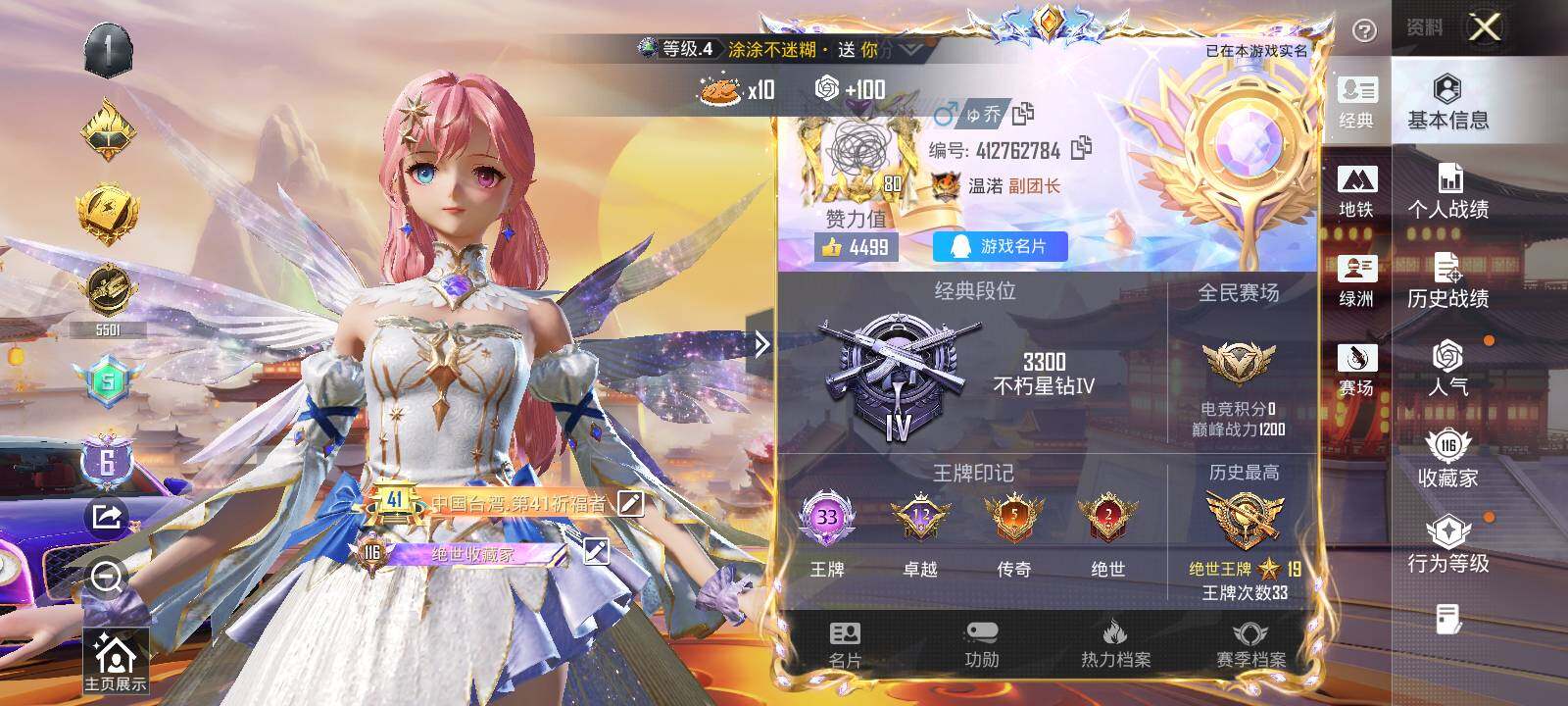 - [12042675]绝世印记1/地铁满天赋【特价急出/详情看图】:苹果 手Q-2粉装-11特效枪-2粉色飞行器-4.4w热力值-3王牌印记-90套装-147枪皮【热门品类】:角色-军刀雅典娜,套装-粉红小猪,角色-Mark.06【粉色套装】:粉装-未来领航者,角色-绯穹魔姬【粉色枪皮等级】:AKM-梦之光华(七级),SCAR-L-锦绣绵绵(五级),M416-电玩时刻(五级),GROZA-镜光银凌(五级),AUG-暖羊咩咩(五级),UMP45-量子极限(五级),汤姆逊-热量炸弹(五级),Kar98K-巳巳如意(五级),Mk14-甜梦熊击(五级),DP-28-豹影疾电(五级),MG-36-沧焰双生(五级)【粉色飞行器】:圣域金龙飞行器,灵猫魔法师飞行器