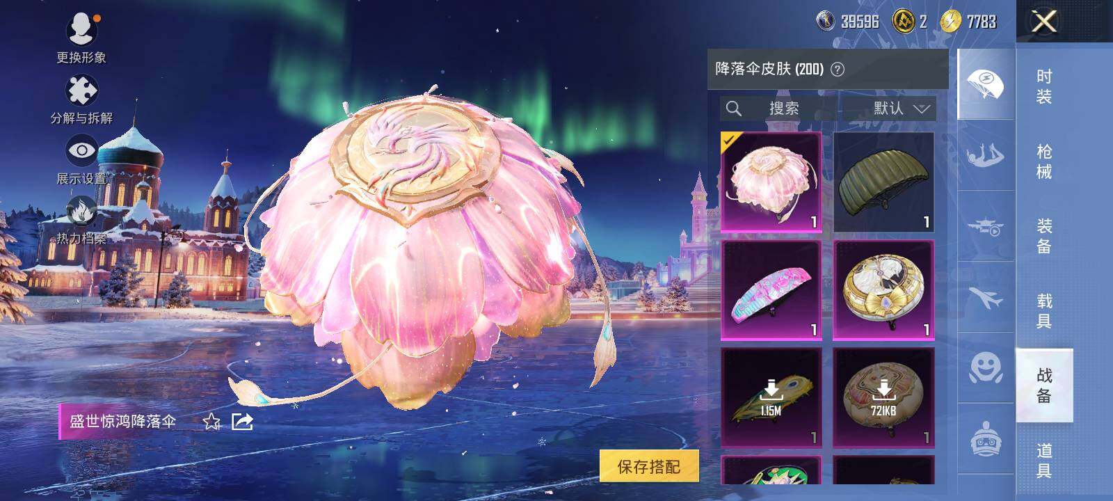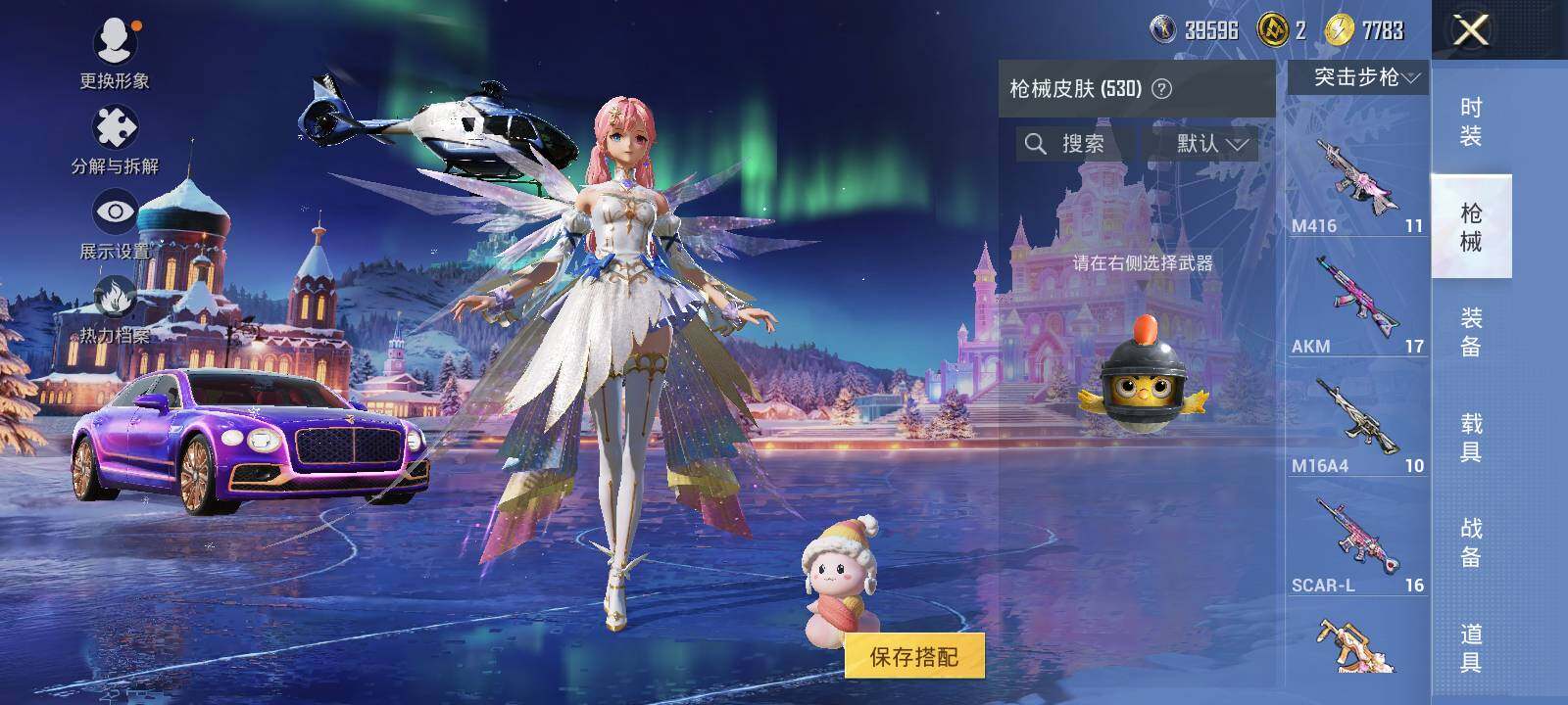 AKM-炫紫旋律,SCAR-L-童趣迷兔,SCAR-L-纯梦嫁纱,M416-五爪金龙,M416-心之恋语,M416-超新星,M416-墨龙九天,GROZA-焦糖拿铁,AUG-超新星,M762-甜蜜誓约,UMP45-雪国精灵,AKS-74U-信仰神谕,P90-仙履奇缘,P90-粉樱探戈,P90-沙丘之主,Kar98K-伏魔团,Kar98K-巳巳如意,M24-星之信仰,M24-镜域双华,AWM-橘柚倾心,Mk14-盛世惊鸿,SVD-月影灵韵,M249-绒雪飘舞,MG3-洛神天依,平底锅-林间仙鹿,烟雾弹-猫咪绅士,破片手榴弹-热量炸弹