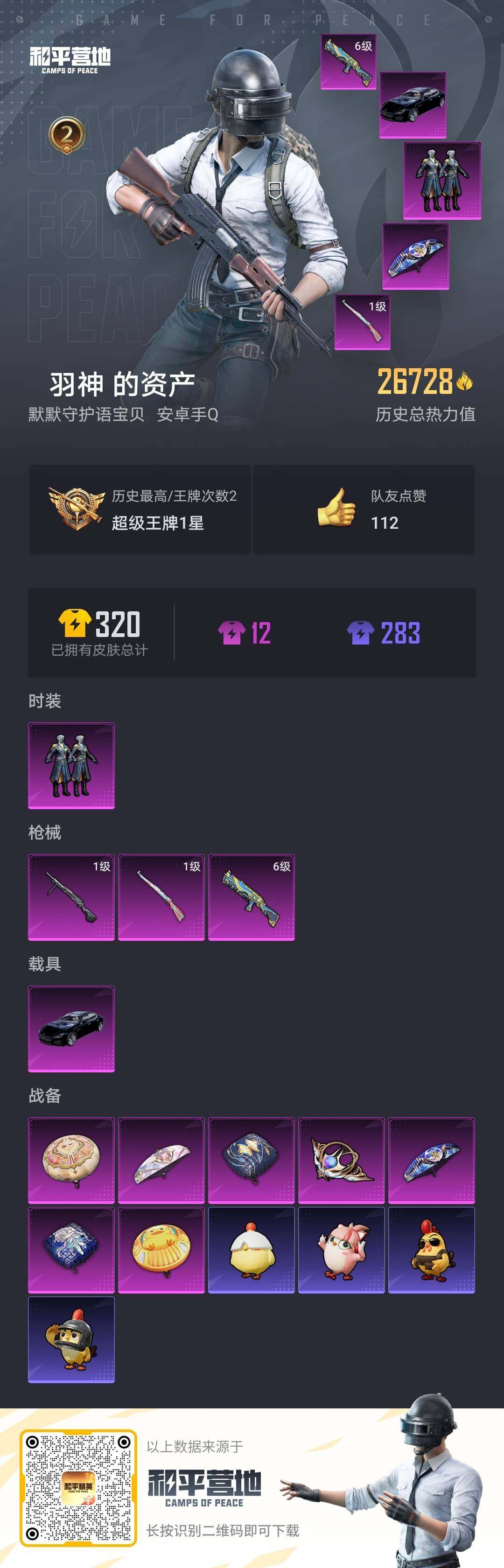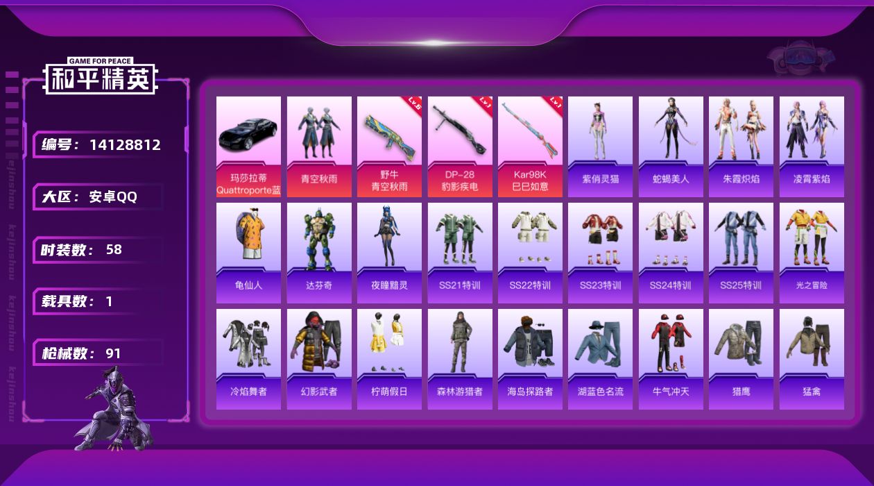 [14128812]可二次【店主推荐捡漏号!可直接换绑】 安卓 手Q-1粉装-3特效枪-1载具-1粉色飞行器-2.6w热力值-2王牌印记-58套装-91枪皮【热门品类】:套装-龟仙人【粉色载具】:玛莎拉蒂Quattroporte(夜幕蓝)【粉色套装】:粉装-青空秋雨【粉色枪皮等级】:野牛-青空秋雨(六级),Kar98K-巳巳如意(一级),DP-28-豹影疾电(一级)【粉色飞行器】:星际浪客飞行器