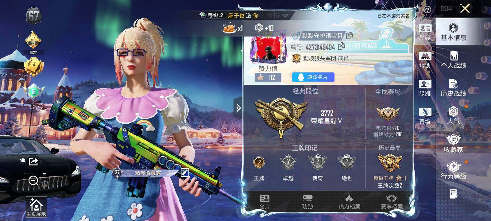 - [11105330]实名: 可修改 时装数: 252 枪械数: 95 战备数: 65 热门装扮: 莲影清波,烟云彩露 稀有枪皮: M416风花雪月,PKM江南烟雨,Kar98K-巳巳如意,DP-28-豹影疾电
