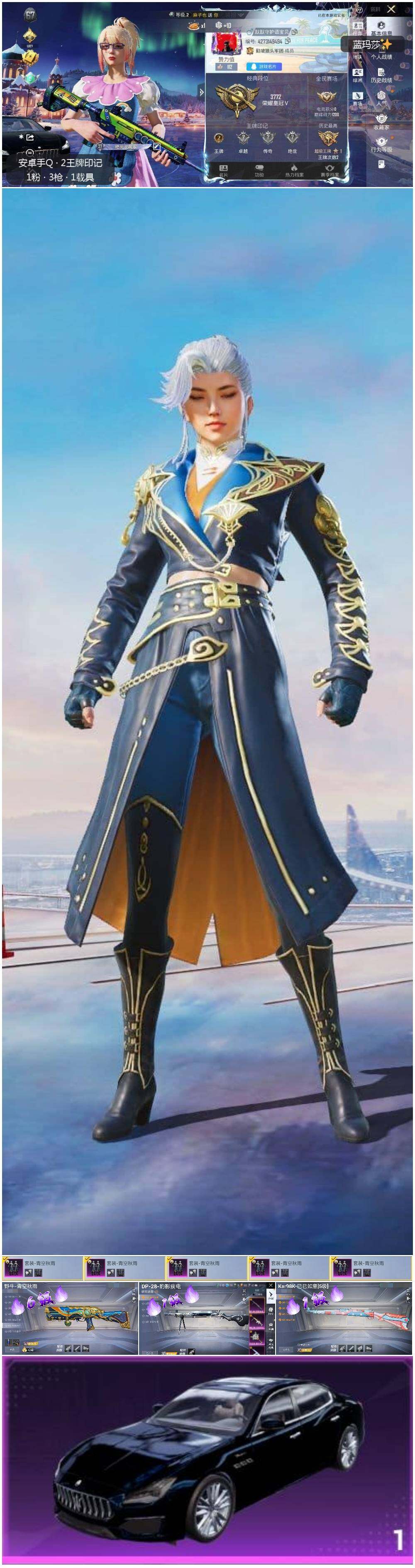 - [12845004]安卓 手Q-4粉装-4特效枪-3载具-0粉色飞行器-33378热力值-2王牌印记-66套装-86枪皮 【热门品类】:角色-军刀雅典娜 【粉色载具】:玛莎拉蒂MC20(星石白),玛莎拉蒂Quattroporte(夜幕蓝),海龙奔腾 【粉色套装】:粉装-炙焰牛王,粉装-旋转彩虹,粉装-碧穹智者,粉装-暗夜鎏金 【粉色枪皮等级】:M416-五爪金龙(二级),GROZA-旋转彩虹(三级),AUG-星之彼岸(五级),M249-彩虹甜喵(六级) 【粉色枪皮】:M416-五爪金龙,GROZA-旋转彩虹,AUG-星之彼岸,M249-彩虹甜喵 【粉色降落伞】:快乐主宰降落伞,百万伏特降落伞,王牌四分卫降落伞,暗夜玫瑰降落伞,旋转彩虹降落伞,暗夜鎏金降落伞,萌酷奶龙降落伞 【稀有枪皮】:AKM-彩虹符号,AKM-星之信仰,AKM-星之彼岸,AKM-破晓战魂,AKM-萌趣颜团子,M16A4-幻世战舞者,M16A4-甜心亚梦,SCAR-L-玉兔迎春,SCAR-L-红色方程式,M416-暗星紫秘,M416-蓝色火焰,GROZA-彩虹符号,GROZA-田园牧歌,AUG-天降萌叽,AUG-耀粉歌者,QBZ-飞驰魅影,M762-彩虹甜喵,M762-绯红前夜,M762-风花雪月,AC-VAL-甜心亚梦,蜜獾-垂柳戏鸭,蜜獾-天降萌叽,蜜獾-娇憨猪猪,UZI-娇憨猪猪,UMP45-生命誓言,Vector-田园牧歌,汤姆逊-奇异狩猎者,汤姆逊-耀粉歌者,P90-翩跹演武,P90-飞驰魅影,Kar98K-炫彩节奏,Kar98K-王子的夏天,Kar98K-飞驰魅影,AWM-恐龙拽拽,SKS-青丘仙客,VSS-星之彼岸,VSS-田园牧歌,VSS-碧影闪光,Mini14-旋转彩虹,Mini14-耀粉歌者,Win94-萝萝小趴兔,SLR-娇憨猪猪,S1897-暗夜鎏金,S1897-飞驰魅影,S12K-娇憨猪猪,S12K-幻世战舞者,S12K-幻影战神,DBS-彩虹甜喵,DBS-彩虹符号,DBS-甜心亚梦,SPAS-12-田园牧歌,M249-星之彼岸,M249-百万伏特,M249-糯团青竹,M249-莲影清波,DP-28-旋转彩虹,DP-28-甜心亚梦,MG3-幻世战舞者,MG3-青空秋雨,沙漠之鹰-旋转彩虹,爆炸猎弓-炎氏战神 【其他套装】:套装-SS11特训,套装-SS14特训,套装-SS15特训,套装-SS