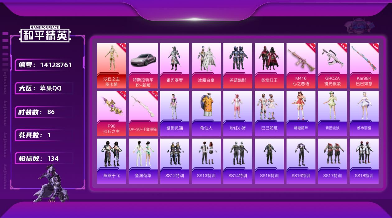 [14128761]【店主推荐捡漏号!可直接换绑】/素材身法号 苹果 手Q-1神装-5粉装-5特效枪-1载具-7粉色飞行器-4.6w热力值-7王牌印记-86套装-134枪皮【红色神装等级】:沙丘之主-图卡盟(二级)【热门品类】:粉装-梦幻火箭,套装-龟仙人,套装-粉红小猪【粉色载具】:特斯拉Roadster(沁心粉)【粉色套装】:粉装-梦幻火箭,粉装-苍蓝魅影,粉装-银刃赛罗,粉装-冰霜白皇,粉装-炙焰红王【粉色枪皮等级】:M416-心之恋语(七级),GROZA-镜光银凌(五级),P90-沙丘之主(三级),Kar98K-巳巳如意(四级),DP-28-千金淑猫(二级)【粉色飞行器】:酣梦熊熊飞行器,梦幻火箭飞行器,齐天大圣飞行器,沙丘之主天马,镜域双华-灵镜之阶,龙翔九天飞行器