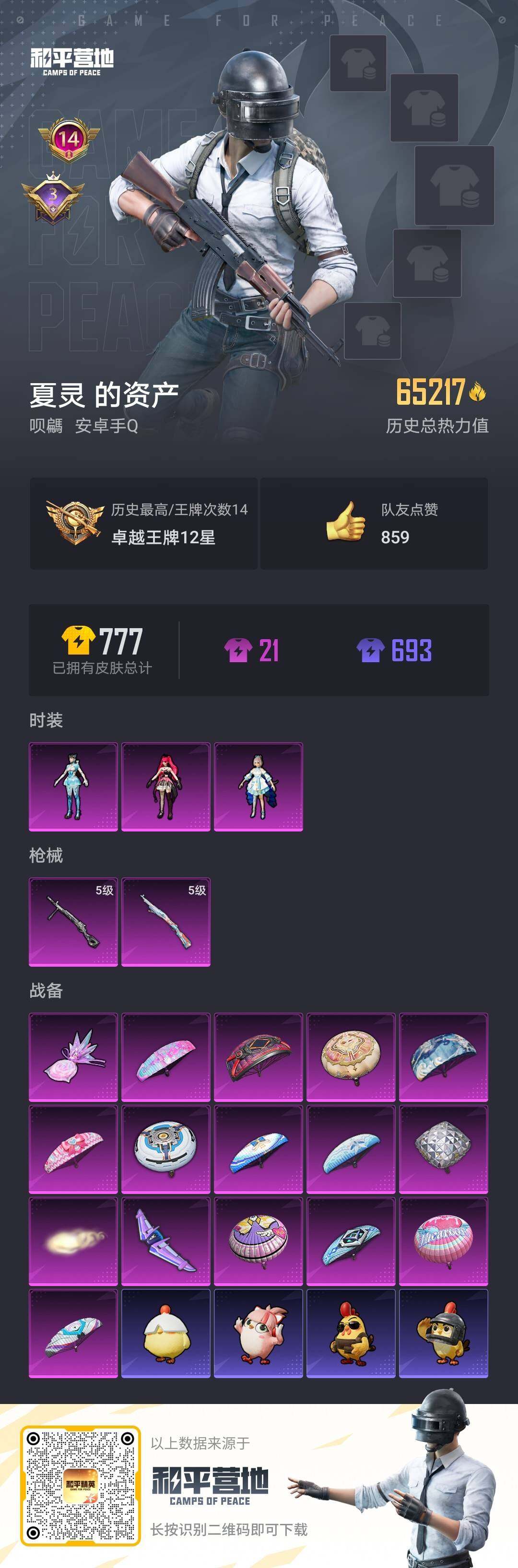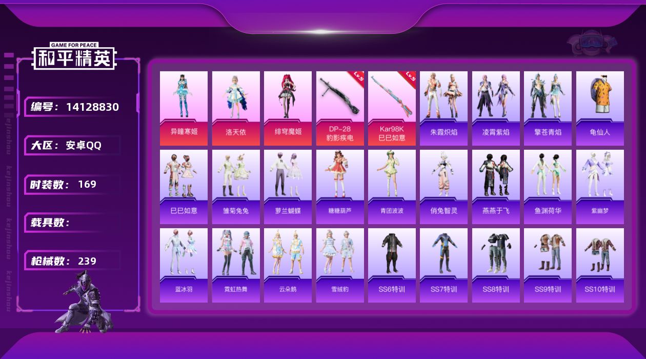 - [12803814]素材身法号 安卓 手Q-1神装-10粉装-14特效枪-2载具-7粉色飞行器-13.1w热力值-17王牌印记-274套装-396枪皮【红色神装等级】:魔童闹海-哪吒(二级)【热门品类】:粉装-梦幻火箭,套装-浪漫天命,套装-都市猎人,套装-深海小丑鱼,套装-小丑鱼,套装-奇异狩猎者,套装-金羽特工,套装-龟仙人,套装-暗影哥特,套装-浪漫波比,套装-粉红小猪,套装-萌熊伴侣,角色-8号机【粉色载具】:兰博基尼Estoque(银翼灰),黑曜夜骑【粉色套装】:粉装-天使彩虹糖,粉装-梦幻火箭,粉装-新星烈龙,粉装-星之彼岸,粉装-庄周梦蝶,粉装-飒粉甜心,角色-水仙星,粉装-金丰海韵,粉装-幻彩电音,角色-奇迹舞步 美雪【粉色枪皮等级】:AKM-星际浪客(六级),AKM-绿萝繁花(四级),SCAR-L-梦幻火箭(五级),M416-五爪金龙(一级),M416-灵猫魔法师(三级),GROZA-镜光银凌(四级),AUG-暖羊咩咩(五级),M762-激战未来(五级),蜜獾-异瞳寒姬(四级),AKS-74U-信仰神谕(五级),Kar98K-巳巳如意(五级),Mk14-甜梦熊击(四级),SLR-暗夜玫瑰(六级),DP-28-豹影疾电(五级)【粉色飞行器】:梦幻火箭飞行器,庄周梦蝶飞行器,沙丘之主天马,镜域双华-灵镜之阶,月下星之子飞行器,灵猫魔法师飞行器