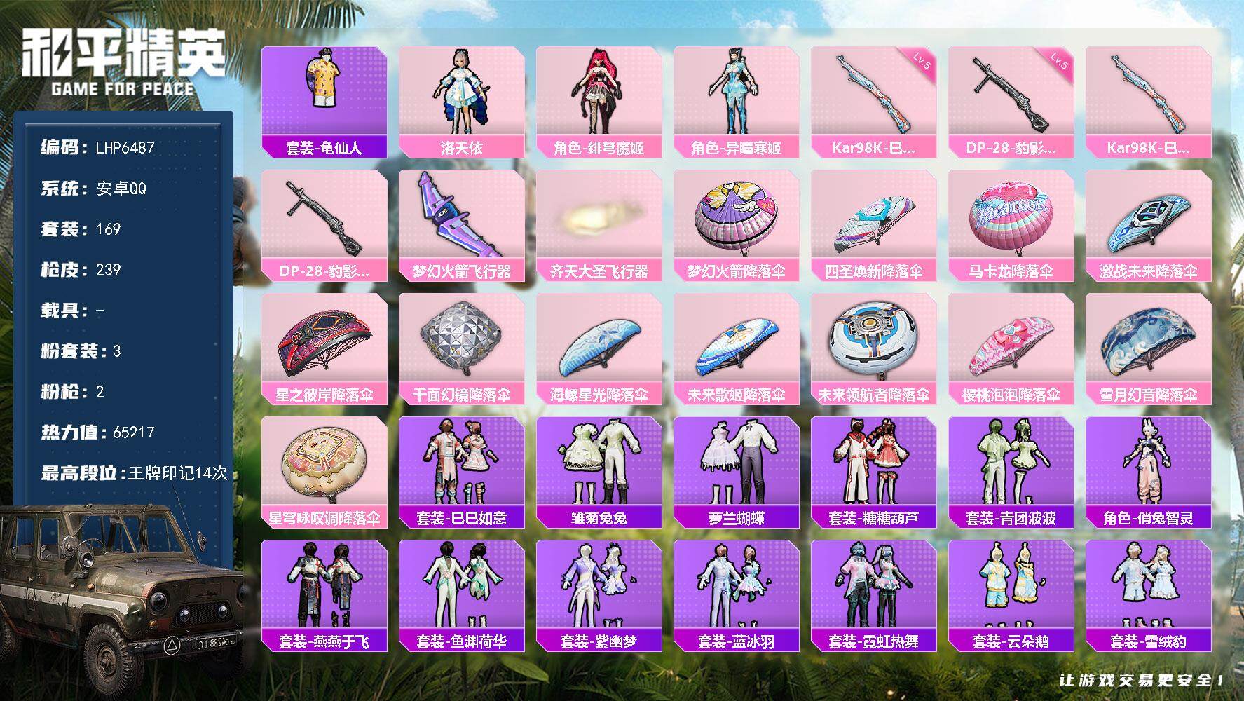 [14128830]可二次【店主推荐捡漏号!可直接换绑】/地铁满天赋 安卓 手Q-3粉装-2特效枪-3粉色飞行器-6.5w热力值-14王牌印记-169套装-239枪皮【热门品类】:套装-龟仙人【粉色套装】:角色-洛天依,角色-绯穹魔姬,角色-异瞳寒姬【粉色枪皮等级】:Kar98K-巳巳如意(五级),DP-28-豹影疾电(五级)【粉色飞行器】:梦幻火箭飞行器,齐天大圣飞行器