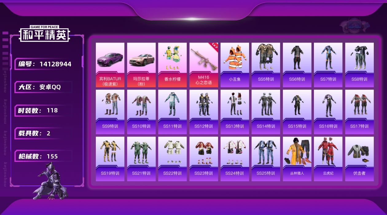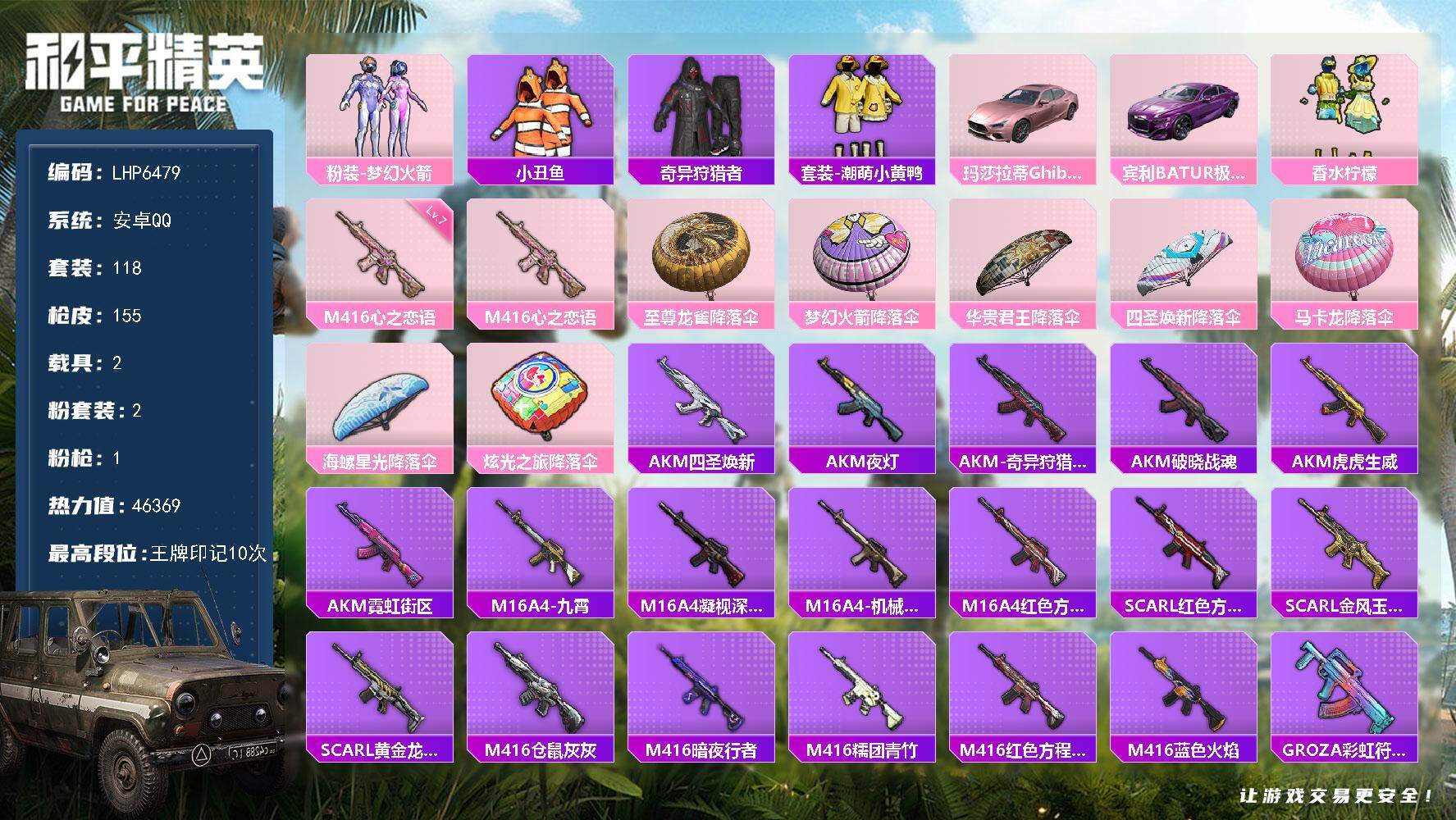 [14128944]可二次【店主推荐捡漏号!可直接换绑】 安卓 手Q-2粉装-1特效枪-2载具-4.6w热力值-10王牌印记-118套装-155枪皮【热门品类】:粉装-梦幻火箭,套装-小丑鱼,套装-奇异狩猎者,套装-潮萌小黄鸭【粉色载具】:玛莎拉蒂Ghibli(粉),宾利BATUR(极速紫)【粉色套装】:粉装-梦幻火箭,粉装-香水柠檬【粉色枪皮等级】:M416-心之恋语(七级)