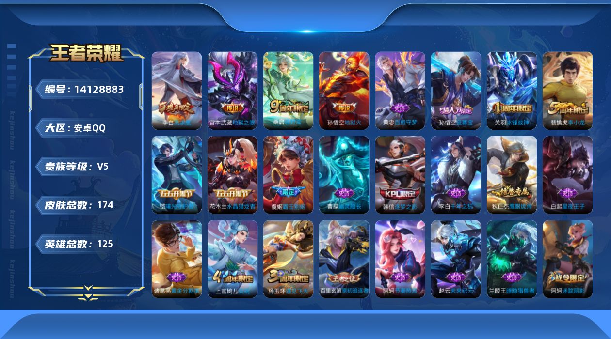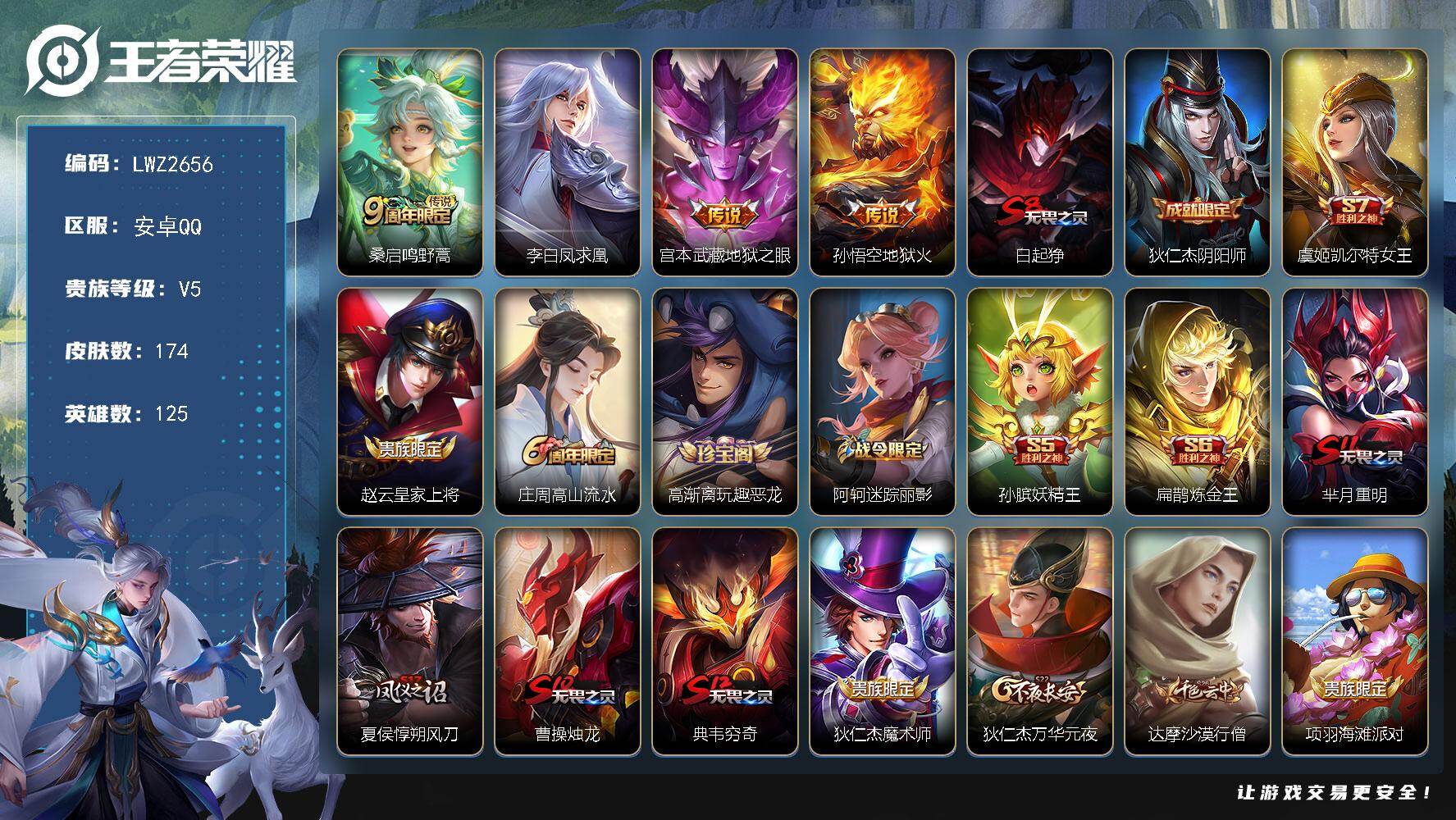 [14128883]【店主推荐捡漏号!可直接换绑】安卓Q-V7-永恒钻石III段位-125英雄-174皮肤-4传说-32史诗 【传说皮肤】:桑启鸣野蒿,李白凤求凰,宫本武藏地狱之眼,孙悟空地狱火 【限定皮肤】:白起狰,狄仁杰阴阳师,虞姬凯尔特女王,赵云皇家上将,庄周高山流水,高渐离玩趣恶龙,阿轲迷踪丽影,孙膑妖精王,扁鹊炼金王,芈月重明,夏侯惇朔风刀,曹操烛龙,典韦穷奇,狄仁杰魔术师,狄仁杰万华元夜,达摩沙漠行僧,项羽海滩派对,老夫子醍醐杖,关羽冰锋战神,程咬金演武夺筹,刘邦夺宝奇兵,韩信逐梦之影,兰陵王金庭之子,孙悟空至尊宝,牛魔御旌,李元芳云中旅人,虞姬霸王别姬,钟馗驱傩正仪,杨玉环遇见飞天,太乙真人饕餮,鬼谷子原初探秘者,苏烈千军破阵,百里玄策原初追逐者,弈星混沌棋,沈梦溪大漠名商,明世隐疑决卦,裴擒虎李小龙,裴擒虎擒涛扼浪,狂铁御狮,米莱狄御霄,上官婉儿梁祝,鲁班大师探海日志,桑启海盐诗旅,张良古海寻踪 【年限皮肤】:李白凤求凰 【赛季限定】:孙膑妖精王,扁鹊炼金王,白起狰,芈月重明,夏侯惇朔风刀,曹操烛龙,典韦穷奇,狄仁杰万华元夜,达摩沙漠行僧,老夫子醍醐杖,程咬金演武夺筹,兰陵王金庭之子,张良古海寻踪,牛魔御旌,李元芳云中旅人,虞姬凯尔特女王,钟馗驱傩正仪,太乙真人饕餮,鬼谷子原初探秘者,苏烈千军破阵,百里玄策原初追逐者,弈星混沌棋,沈梦溪大漠名商,明世隐疑决卦,裴擒虎擒涛扼浪,狂铁御狮,米莱狄御霄,鲁班大师探海日志,桑启海盐诗旅 【战令限定】:阿轲迷踪丽影,刘邦夺宝奇兵 【史诗皮肤】:赵云皇家上将,赵云未来纪元,貂蝉圣诞恋歌,狄仁杰魔术师,宫本武藏鬼剑武藏,孙尚香水果甜心,墨子金属风暴,曹操幽灵船长,李白千年之狐,张飞乱世虎臣,虞姬霸王别姬,关羽冰锋战神,孙悟空至尊宝,花木兰水晶猎龙者,韩信逐梦之影,小乔缤纷独角兽,兰陵王暗隐猎兽者,诸葛亮黄金分割率,雅典娜冰冠公主,铠曙光守护者,蔡文姬舞动绿茵,程咬金功夫厨神,白起星夜王子,阿轲节奏热浪,杨玉环遇见飞天,狄仁杰鹰眼统帅,上官婉儿梁祝,阿轲迷踪丽影,百里玄策原初追逐者,裴擒虎李小龙,庄周高山流水,黄忠百相守梦 【其他皮肤】:项羽海滩派对,韩信教廷特使,韩信街头霸王,露娜哥特玫瑰,阿轲爱心护理,达摩大发明家,赵云忍炎影,白起白色死神,牛魔西部大镖客,扁鹊化身博士,宫本武藏未来纪元,孙膑天使之翼,妲己少女阿狸,典韦黄金武士,