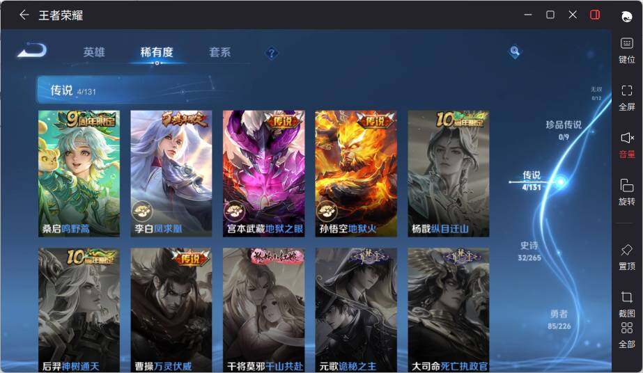 【史诗皮肤】:赵云皇家上将,赵云未来纪元,貂蝉圣诞恋歌,狄仁杰魔术师,宫本武藏鬼剑武藏,孙尚香水果甜心,墨子金属风暴,曹操幽灵船长,李白千年之狐,张飞乱世虎臣,虞姬霸王别姬,关羽冰锋战神,孙悟空至尊宝,花木兰水晶猎龙者,韩信逐梦之影,小乔缤纷独角兽,兰陵王暗隐猎兽者,诸葛亮黄金分割率,雅典娜冰冠公主,铠曙光守护者,蔡文姬舞动绿茵,程咬金功夫厨神,白起星夜王子,阿轲节奏热浪,杨玉环遇见飞天,狄仁杰鹰眼统帅,上官婉儿梁祝,阿轲迷踪丽影,百里玄策原初追逐者,裴擒虎李小龙,庄周高山流水,黄忠百相守梦
