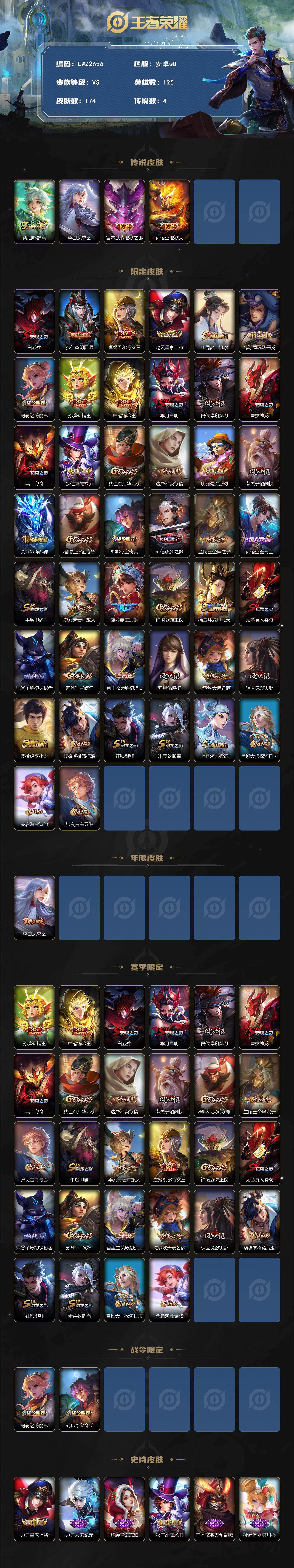 - [11687255]V10 2典藏 1无双 3珍品传说 46传说 126英雄 414皮肤 典藏英雄武则天 女号 可修改实名 优质装备:幻阙歌(貂蝉典藏),真我赫兹(瑶)(瑶无双),拾光映像(瑶典藏),江户川柯南,怪盗基德,器灵·落星盏,冠军飞将,云鹰飞将(小将军),黄金白羊座,猫影幻舞,久胜战神,一念神魔,云霓雀翎,末日机甲-孙尚香(绿蚂蚱),地狱火,仲夏夜之梦(大飞蛾),音你心动-小乔,海洋之心,飞鸢探春,音你心动-周瑜,胖达荣荣,乞巧织情,游龙清影(小青龙),淬星耀世,超时空战士-狄仁杰,遇见胡旋,挚爱之约,山海·炽霜斩(李信年限),山海·琳琅生(小乔年限),燃星之曲,浮生妄,艾琳觅芳踪,朵莉亚心动手记,牧神诗旅 传说皮:乘龙·问璇玑(孙尚香年限),貂蝉曦玄引,续相思,星之鸣奏,幻光神枪 珍宝阁皮:妄想食味,女武神 限定皮:愿照·九州拓(澜年限),愿照·福禄聚(蔡文姬年限),愿照·岁时盈(虞姬年限),愿照·山河定(司空震年限),愿照·众生和(妲己年限),愿照·千秋盛(女娲年限),逐霄战戟,映山客,陌上桑,鸣野蒿,太华(伽罗年限),异界灵契(白毛香),傲雪梅枪,寅虎·展翼(孙膑年限),绯月行,时之彼端,白鹤梁神女,魔法小厨娘,神威(电光马子),山海·碧波行(瑶年限),至美·乘鲤谣,高山流水,天狼运算者,梁祝,天狼溯光者,逐梦之影,孙行者,猪悟能,青春决赛季,乒乒小将,蜜橘之夏,匿光追影者,女儿国国王,时之祈愿-瑶(瑶传限),神器·万象笔 史诗皮:苍鳞隐世,器灵·浮梦炉,糖绘人间,狼魂孤将,绮世丹青,化蝶舞,星界战将,谪仙醉月,龙之律动,茶境仙,怒海争锋,炽弈燎原,破空之剑,战舞者,涂山红红,东方月初,埋骨钱,芈月浮光幕影,海诺心动手记,琥珀纪元伽罗,夜落电台,决胜骁骑,奇遇星旅,蔬乡物语(鲁班七号),百相守梦-百里守约,百相守梦-黄忠,遇见神鹿,紫霞仙子,白龙吟,黄金分割率,特工魅影,千年之狐,永昼,江河有灵,匿光侦查者,魅语,百解令(蒙犽),高渐离燃音魔法,蒙恬荣光圣徽,无限星赏官,冰冠公主,青蛇,偶像歌手,白蛇,晚萤,银翎春语,末日机甲-吕布,猫狗日记-孙策,猫狗日记-大乔,时之恋人-孙尚香,乱世虎臣,节奏热浪,修罗,女仆咖啡,摇滚巨星,水果甜心,绅士熊喵,天才门将,星夜王子,心灵骇客,时之奇旅-安琪拉,功夫厨神,德古拉伯爵,暗隐猎兽者,鬼剑武藏,心灵战警,