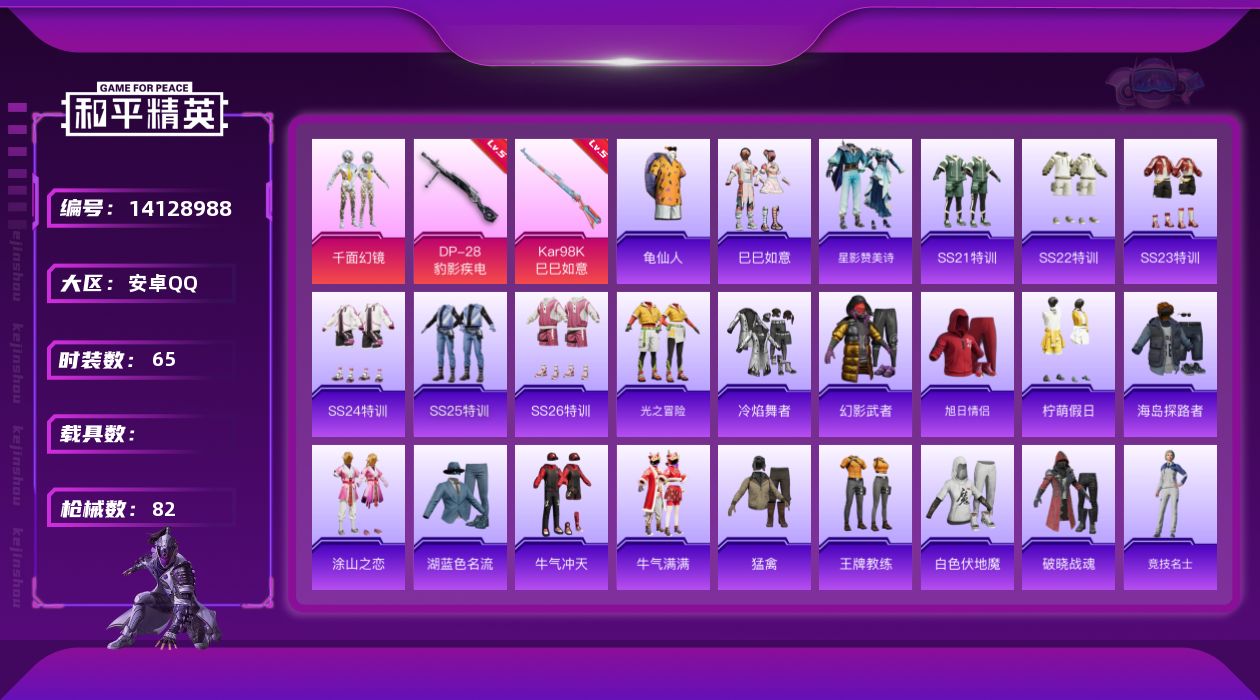 [14128988]【店主推荐捡漏号!可直接换绑】 安卓 手Q-1粉装-2特效枪-1粉色飞行器-2.3w热力值-4王牌印记-65套装-82枪皮【热门品类】:套装-龟仙人【粉色套装】:粉装-千面幻镜【粉色枪皮等级】:Kar98K-巳巳如意(五级),DP-28-豹影疾电(五级)【粉色飞行器】:千面幻镜飞行器