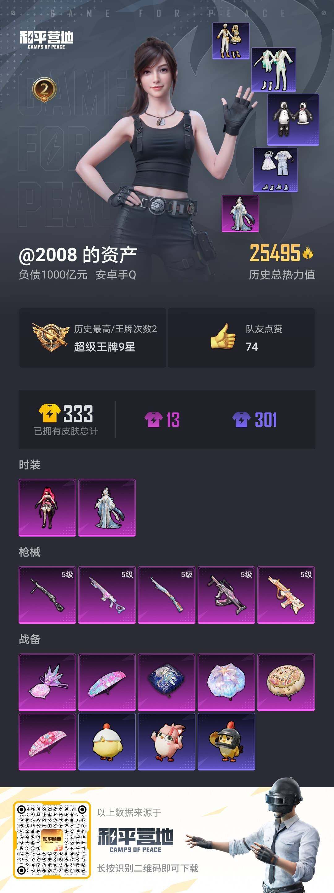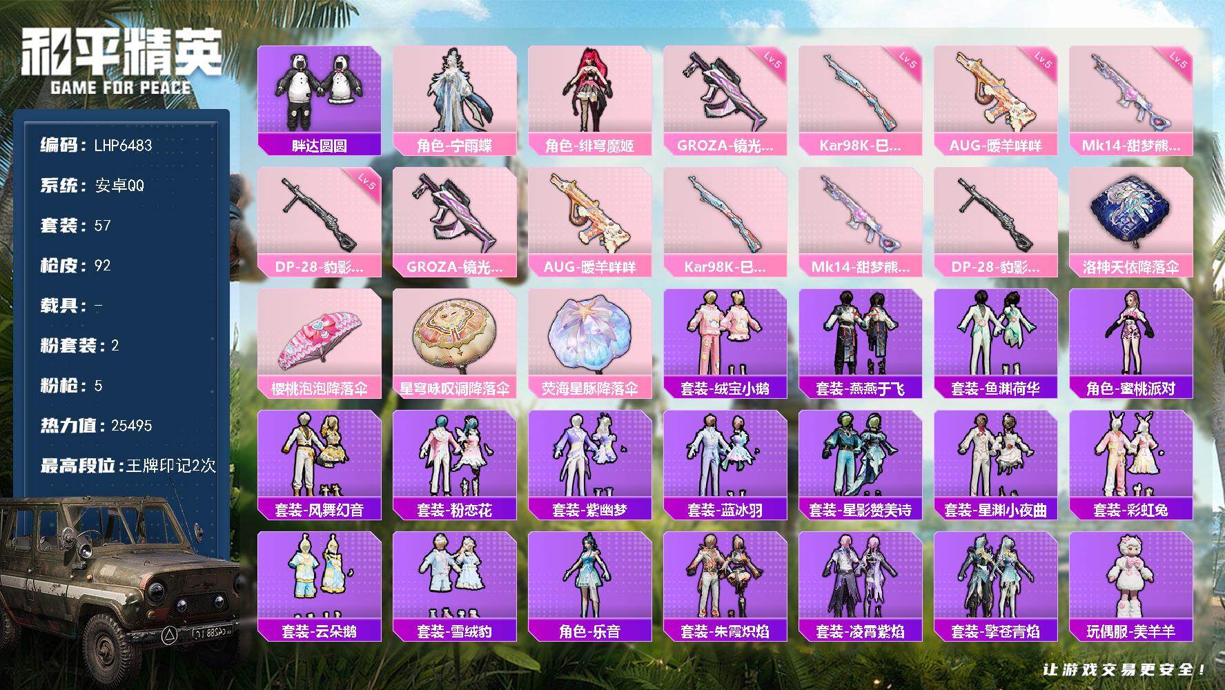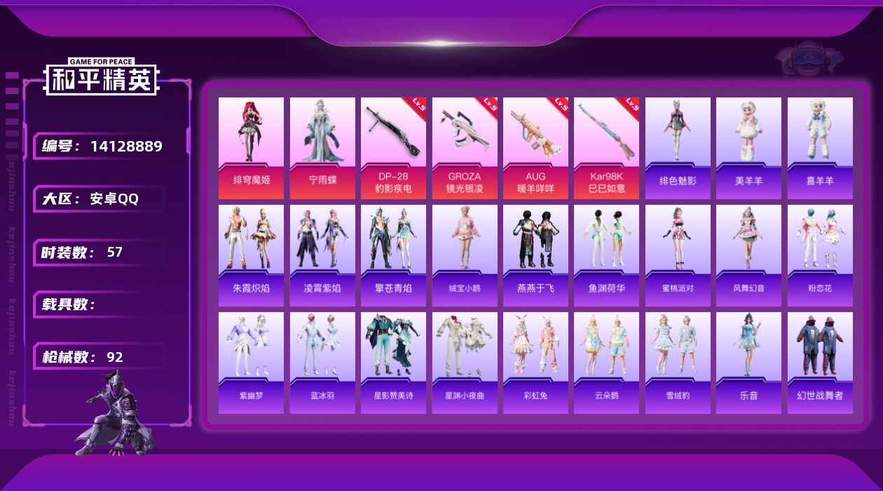 [14128889]【店主推荐捡漏号!可直接换绑】/地铁满天赋 安卓 手Q-2粉装-5特效枪-1粉色飞行器-2.5w热力值-2王牌印记-57套装-92枪皮【热门品类】:套装-胖达圆圆【粉色套装】:角色-宁雨蝶,角色-绯穹魔姬【粉色枪皮等级】:GROZA-镜光银凌(五级),AUG-暖羊咩咩(五级),Kar98K-巳巳如意(五级),Mk14-甜梦熊击(五级),DP-28-豹影疾电(五级)