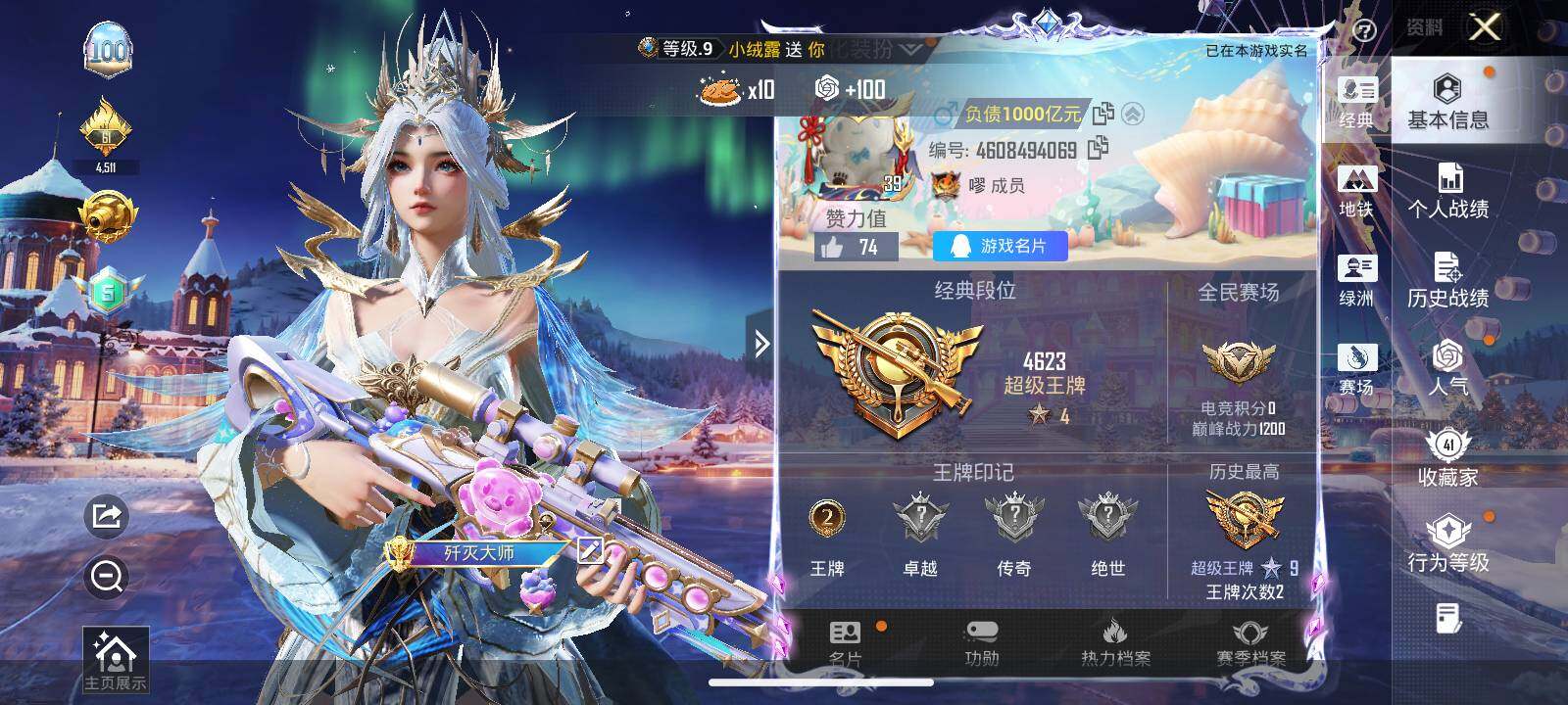 - PX_2094678-实名: 可修改 贵族等级: V7 英雄数: 110 皮肤数: 125 珍品传说: 大耳狗之梦 传说皮: 游龙清影,记忆之芯,霜月吟,澜逐花归海,幻光神枪 限定皮: 时之奇旅-妲己,五谷丰年,至美·乘鲤谣,鸣野蒿,陌上桑,逐霄战戟,愿照·众生和