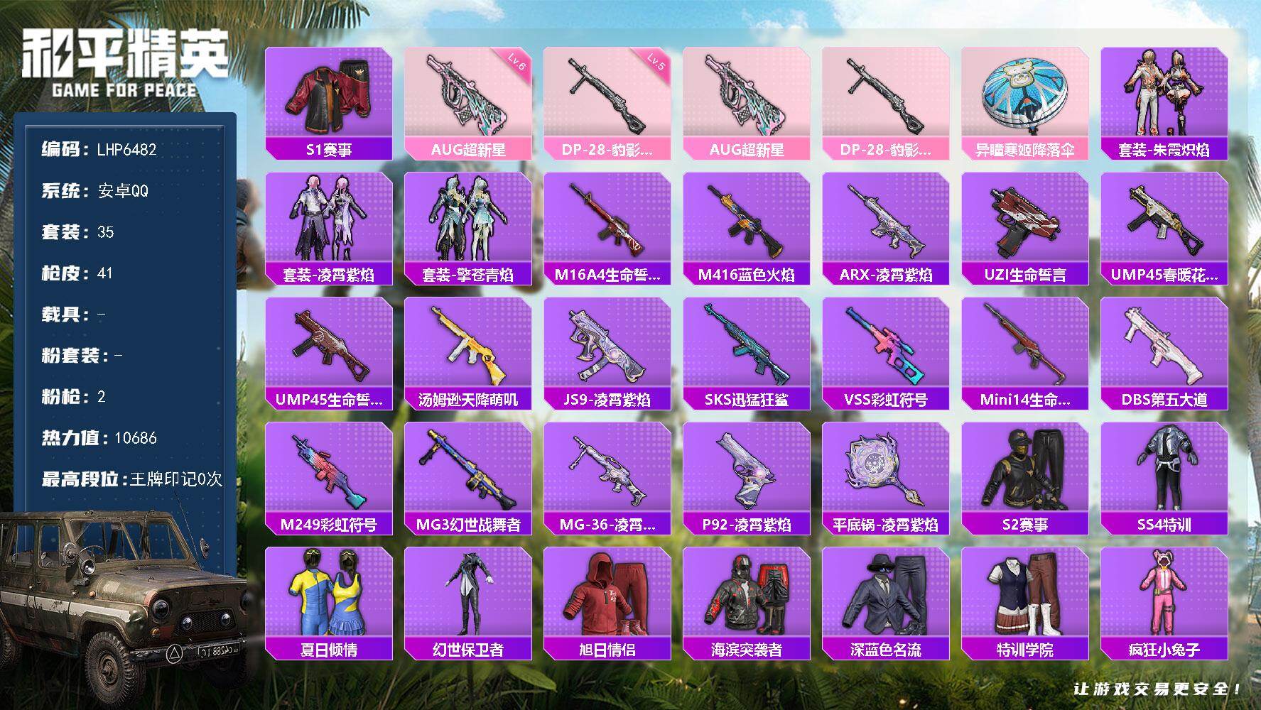 [14128919]s1全套【店主推荐捡漏号!可直接换绑】/地铁满天赋 安卓 手Q-2特效枪-1粉色飞行器-1w热力值-1王牌印记-35套装-41枪皮【热门品类】:套装-S1赛事【粉色枪皮等级】:AUG-超新星(六级),DP-28-豹影疾电(五级)