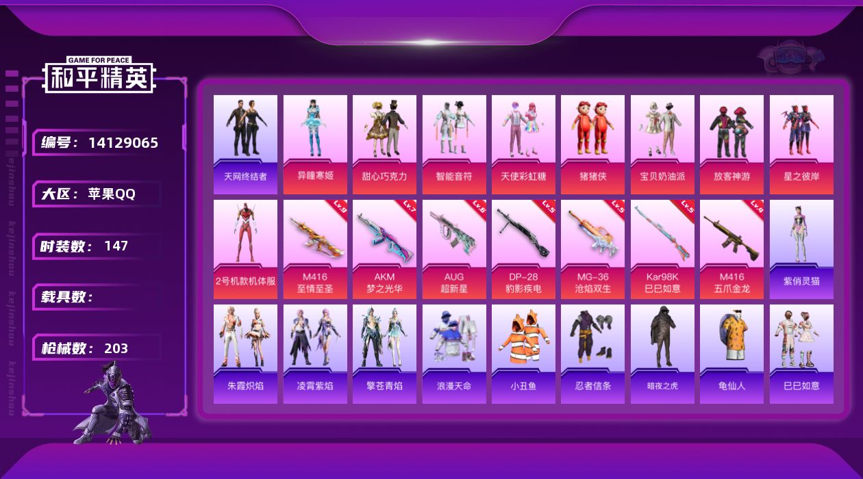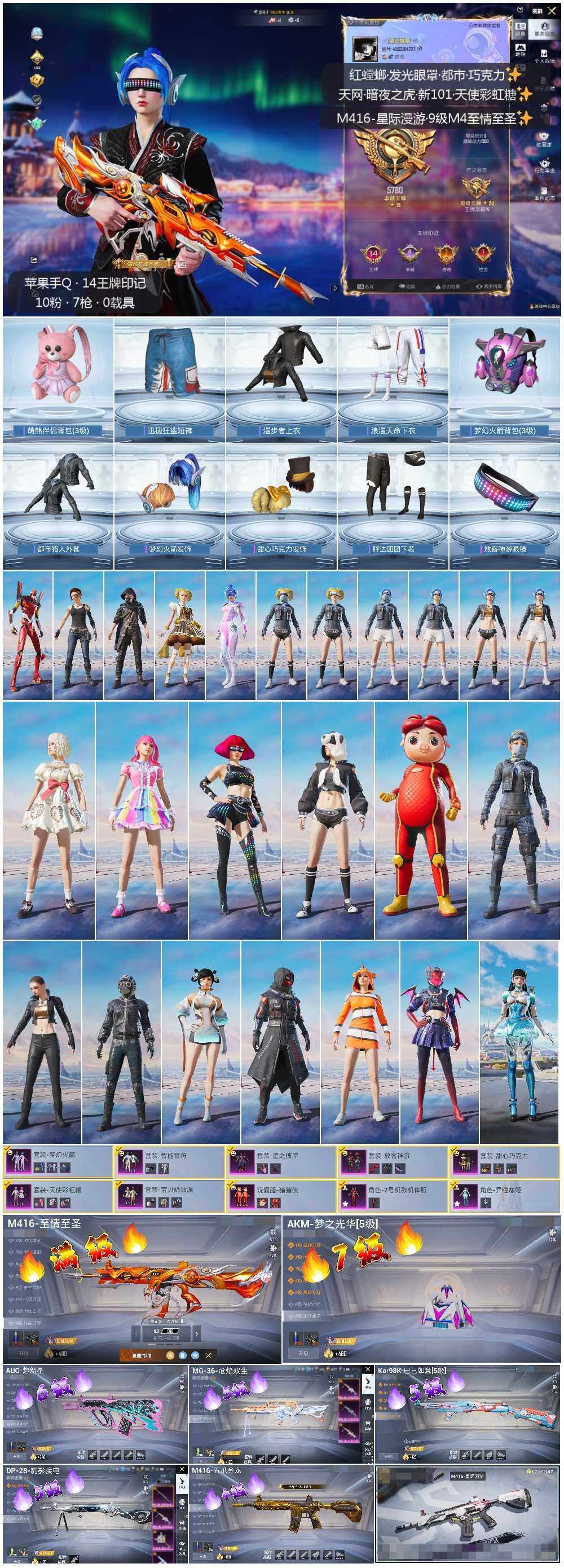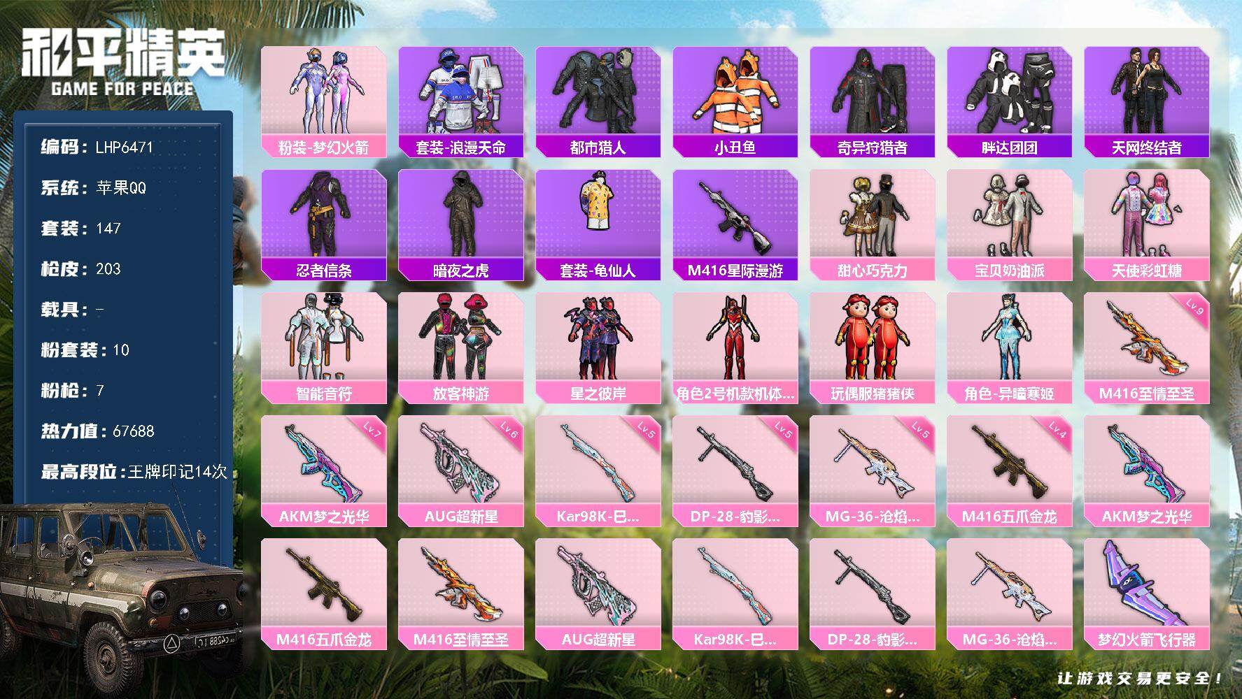 [14129065]可二次【店主推荐捡漏号!可直接换绑】/素材身法号/绝世印记1/ M416-至情至圣(九级)/地铁满天赋 苹果 手Q-10粉装-7特效枪-0载具-3粉色飞行器-6.7w热力值-14王牌印记-147套装-203枪皮【热门品类】:粉装-梦幻火箭,套装-浪漫天命,套装-都市猎人,套装-小丑鱼,套装-奇异狩猎者,套装-胖达团团,套装-天网终结者,套装-忍者信条,套装-暗夜之虎,套装-龟仙人,M416-星际漫游【粉色套装】:粉装-甜心巧克力,粉装-宝贝奶油派,粉装-天使彩虹糖,粉装-梦幻火箭,粉装-智能音符,粉装-放客神游,粉装-星之彼岸,角色-2号机款机体服,玩偶服-猪猪侠,角色-异瞳寒姬【粉色枪皮等级】:AKM-梦之光华(七级),M416-五爪金龙(四级),M416-至情至圣(九级),AUG-超新星(六级),Kar98K-巳巳如意(五级),DP-28-豹影疾电(五级),MG-36-沧焰双生(五级)【粉色飞行器】:梦幻火箭飞行器,超新星飞行器