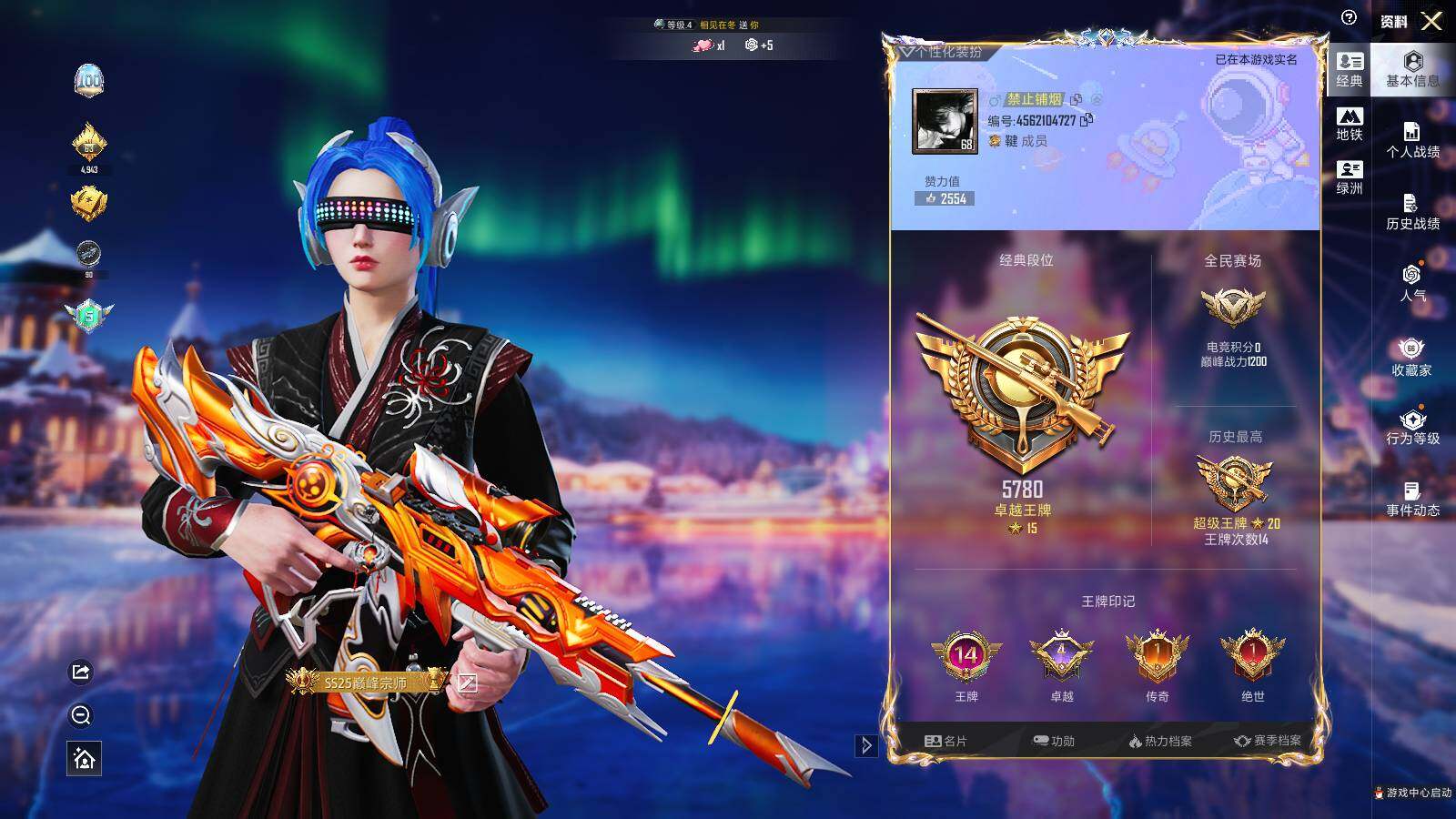 - PX_2095939-实名: 可修改 贵族等级: V8 英雄数: 123 皮肤数: 251 荣耀水晶: 无限飓风号 星传说: 幽冥火,幻舞叠翠 传说皮: 冠军飞将,猫影幻舞,久胜战神,地狱火,乞巧织情,游龙清影,淬星耀世,超时空战士-狄仁杰,山海·炽霜斩,山海·琳琅生,山海·苍雷引,炽翼辉光 限定皮: 遇见飞天,李小龙,祈雪灵祝,游园惊梦,梁祝,逐梦之光,凤求凰,寅虎·御盾,凤凰于飞,至尊宝,大圣