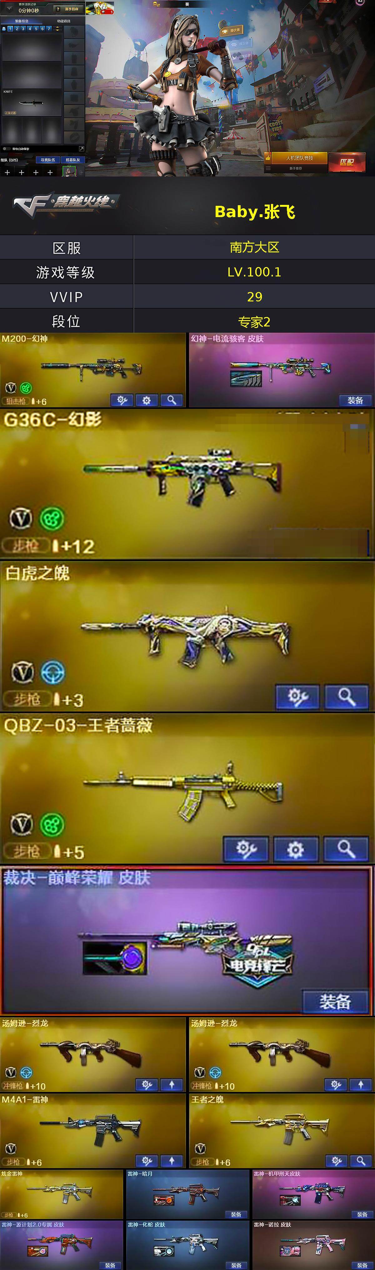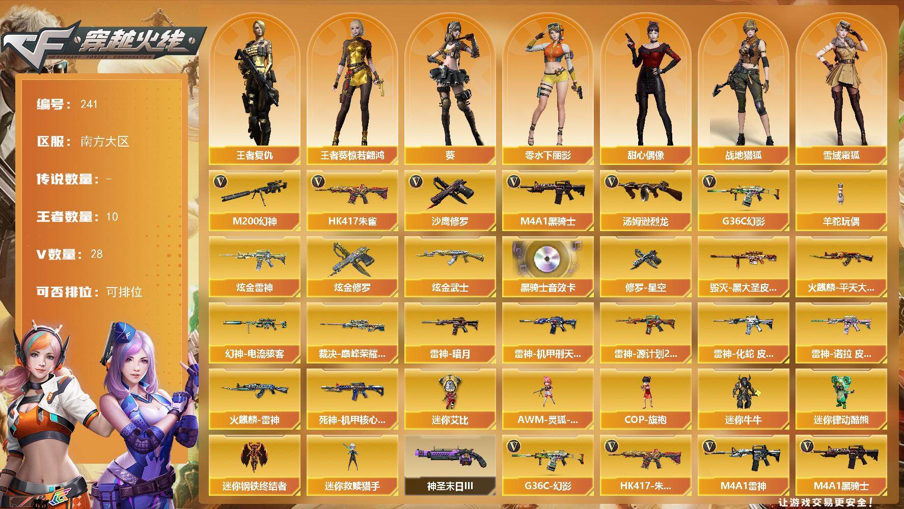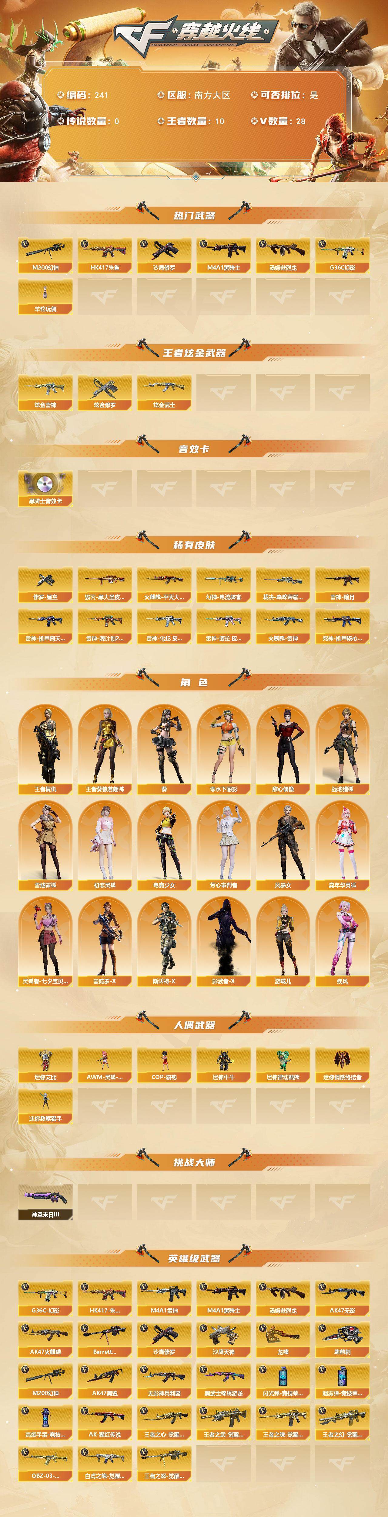 [14132624]南方大区-28V-10王者-4炫金 【热门武器】:G36C-幻影,HK417-朱雀,M200-幻神,M4A1-黑骑士,汤姆逊-烈龙*2,羊驼玩偶*3,沙鹰-修罗*2 【王者炫金武器】:炫金雷神,炫金武士,炫金修罗*2 【音效卡】:M4A1-黑骑士音效卡 【皮肤】:幻神-电流骇客 皮肤,裁决-巅峰荣耀 皮肤,雷神-暗月,雷神-机甲刑天皮肤,雷神-源计划2.0专属 皮肤,雷神-化蛇 皮肤,雷神-诺拉 皮肤,火麒麟-雷神,火麒麟-平天大圣*2,毁灭-黑大圣皮肤,死神-机甲核心皮肤,修罗-星空 【角色】:葵,战地猎狐,王者葵-惊若翩鸿,王者复仇,雪域霜狐,初恋灵狐,电竞少女,芳心审判者,风暴女,嘉年华灵狐,疾风,零-水下丽影,灵狐者-七夕宝贝,曼陀罗-X,斯沃特-X,甜心偶像,影武者-X,游珑儿 【人偶武器】:迷你钢铁终结者,迷你救赎猎手,迷你律动酷熊,AWM-灵狐-15周年嘉年华,COP-旗袍,迷你牛牛,迷你艾比 【挑战大师】:神圣爆裂者-末日III 【英雄级武器】:AK47-火麒麟,M4A1-雷神,M4A1-黑骑士,AK47-无影,AK47-黑鲨,HK417-朱雀,无影-神兵利器,G36C-幻影,黑武士-锦绣游龙,王者之心-觉醒版,王者之武-觉醒版,王者之魄-觉醒版,王者之幻-觉醒版,AK-47-猩红传说,QBZ-03-王者蔷薇-觉醒版,白虎之魄-觉醒版,Barrett-毁灭,M200-幻神,王者之怒-觉醒版,汤姆逊-烈龙*2,沙鹰-修罗*2,沙鹰-天神,龙啸,麒麟刺,高爆手雷-竞技荣光,闪光弹-竞技荣光,烟雾弹-竞技荣光*3 【道具】:亚洲杯纪念炫彩背包,战舰背包,沙漠龙背包-猛男专属,炫彩背包-诺拉,牛魔王背包-至尊黄金,超级背包,雪域霜狐炫彩背包,黄金巨石泰坦-魔花研究所背包,救世主-黑桃战神,黄金生化钩,绿色巨人,灵魂忍者,迷雾幽灵,生化弹匣,夺命之镰,防化服*2,金色流光-枪王排位*2,星辰流光-枪王排位,枪王排位28赛季金色流光,枪王排位29赛季金色流光,语音特效-怀旧,雪域霜狐表情,C4-沙漠,防弹头盔*4,防弹衣*4,C4工具钳*2,手雷包*2 【特殊枪械】:1黑骑士,2烈龙